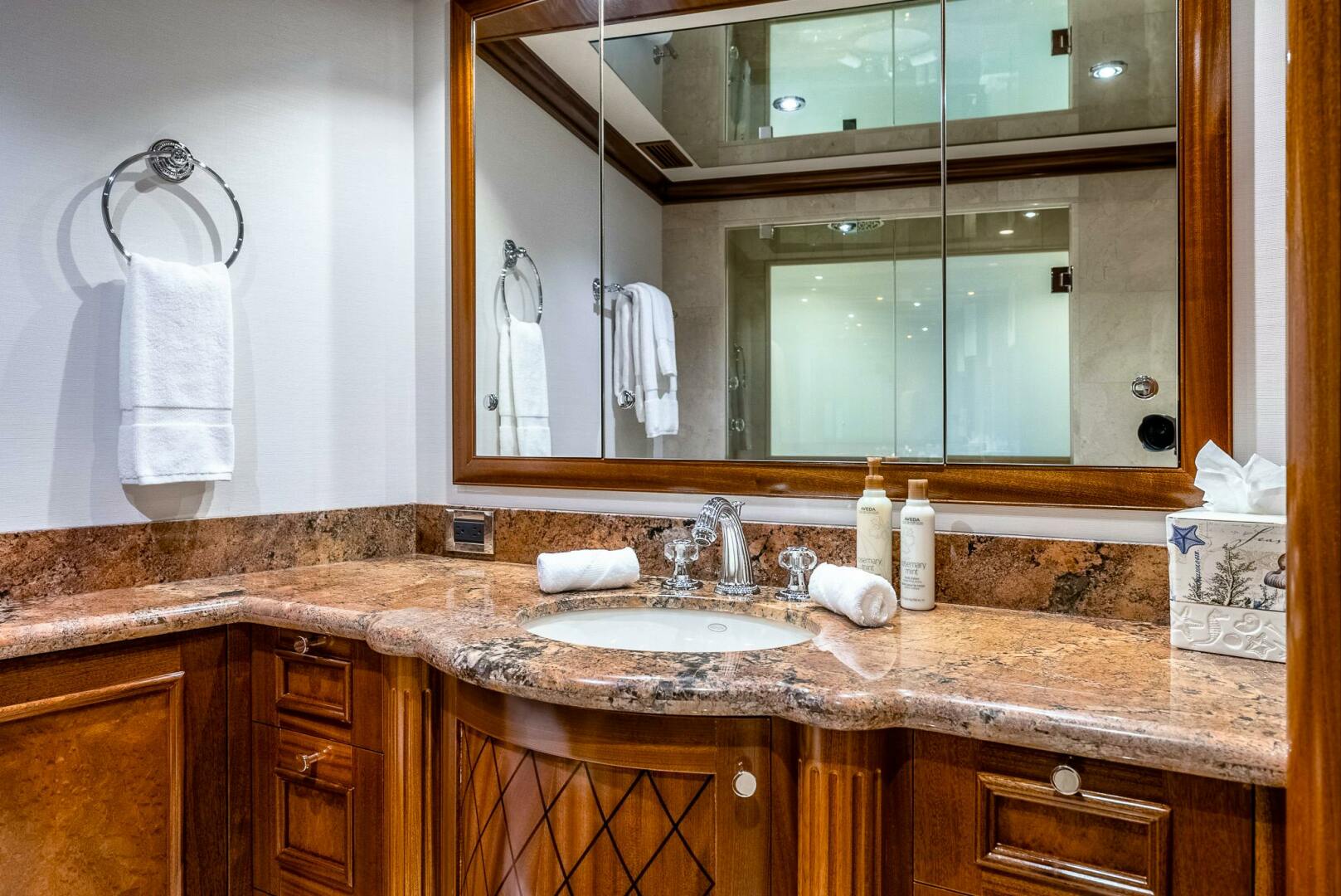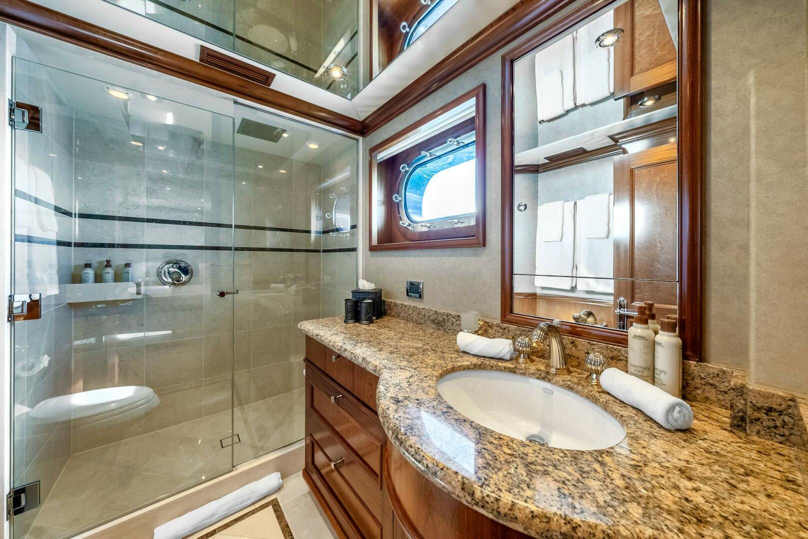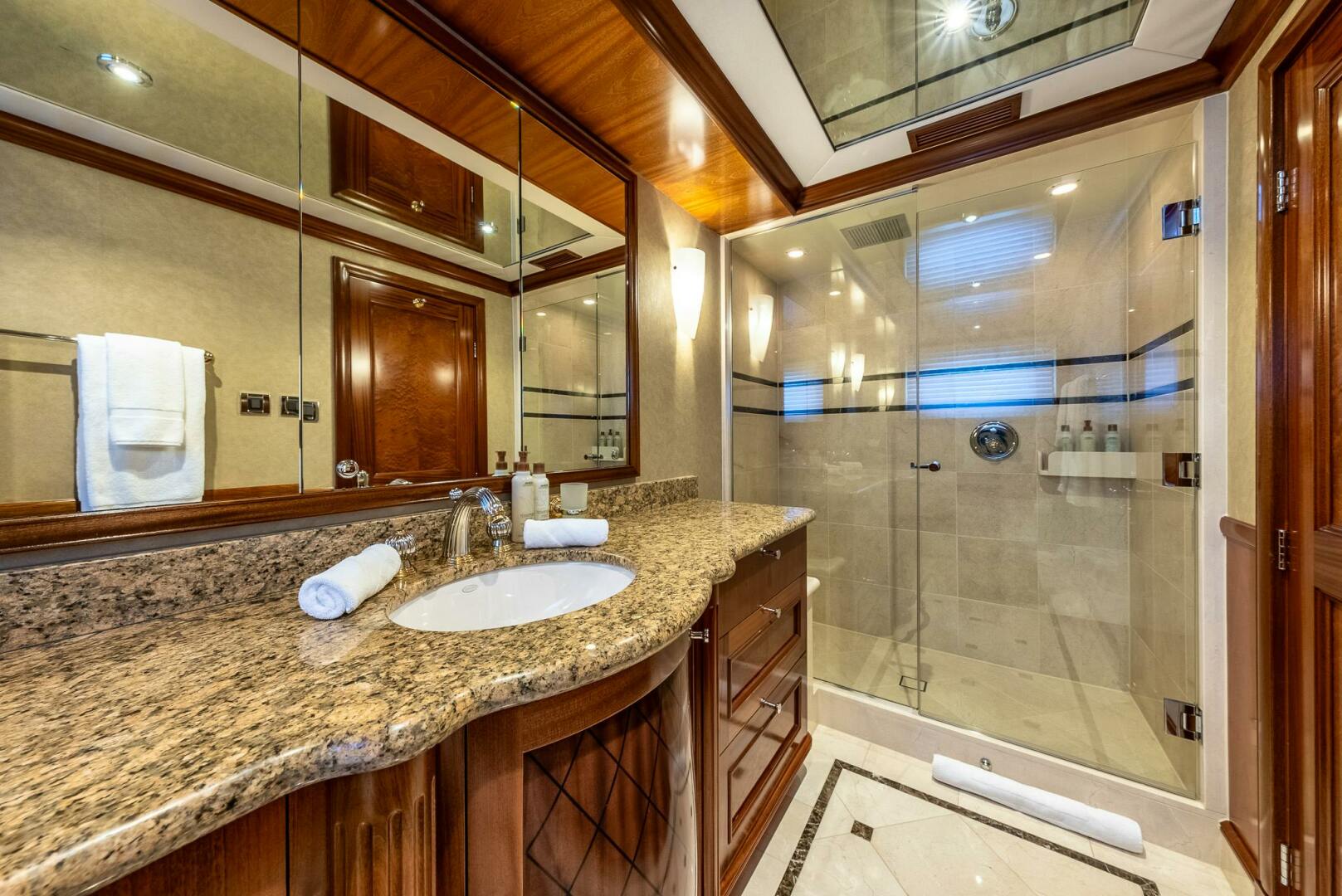 The full beam on-deck master suite is designed with elegance and comfort in mind. At the entrance on starboard side is a built-in desk and bookshelf/office area with a (2) Subzero drawer refreshment center. As you walk into the master stateroom the king size bed is set in the center of the room with a couch starboard side and vanity to port. A full entertainment system is hidden in cabinetry on the aft bulkhead. There is a large cedar-lined walk-in closet with plenty of storage and drawers. Forward of the bed are his and her bathrooms, his with a shower with two shower heads and a steamer, hers with a whirlpool tub. There is a fog mirror between his and her baths for privacy.