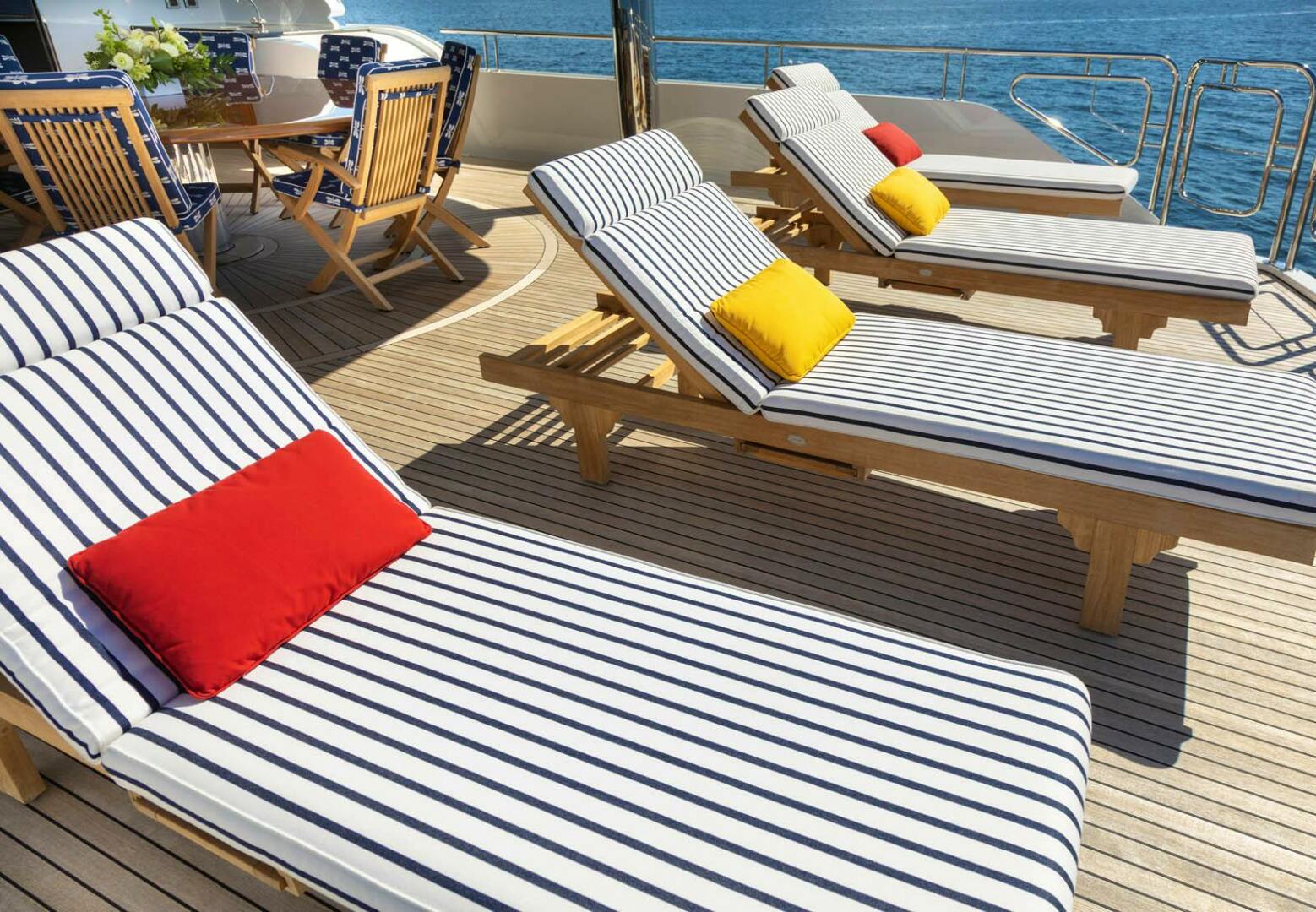Boarding CALLIOPE has been made easy by the 20’ Bezenzoni electric/hydraulic passarelle or the custom-built tide ride ladder either midship or via the aft deck. The main aft deck has plenty of seating area at the teak table and the wrap around bar, providing a good place to view the drop down 32” HD TV.