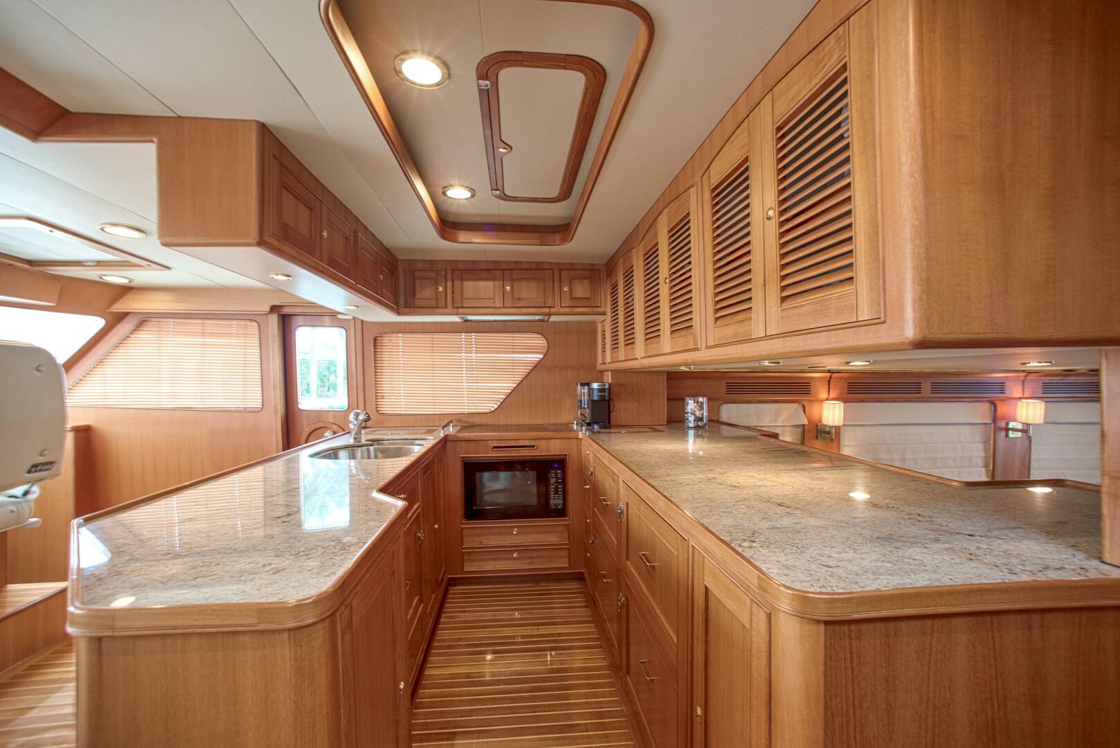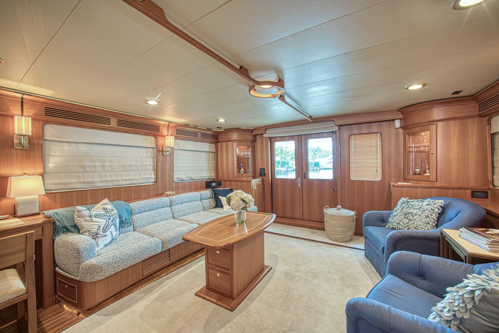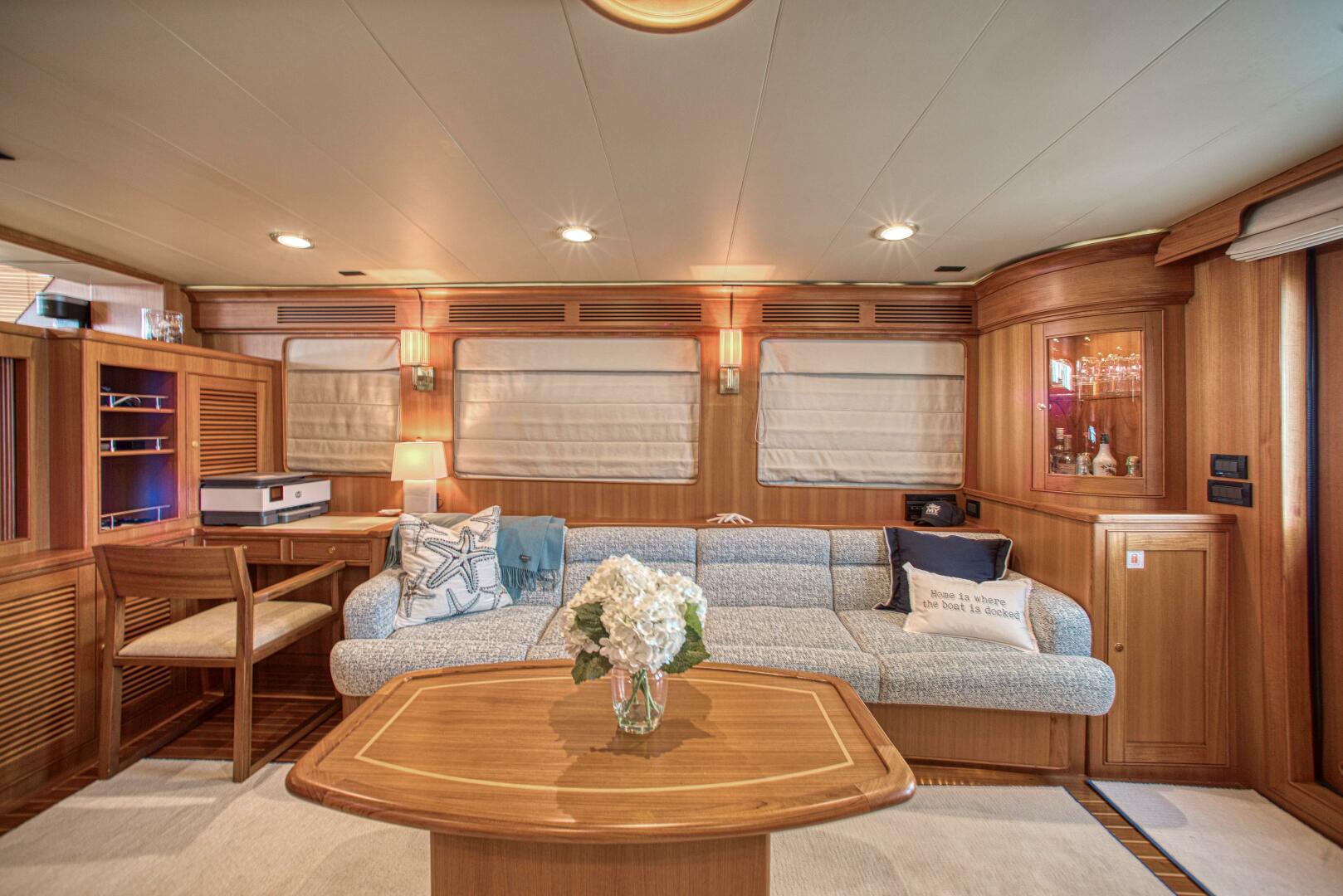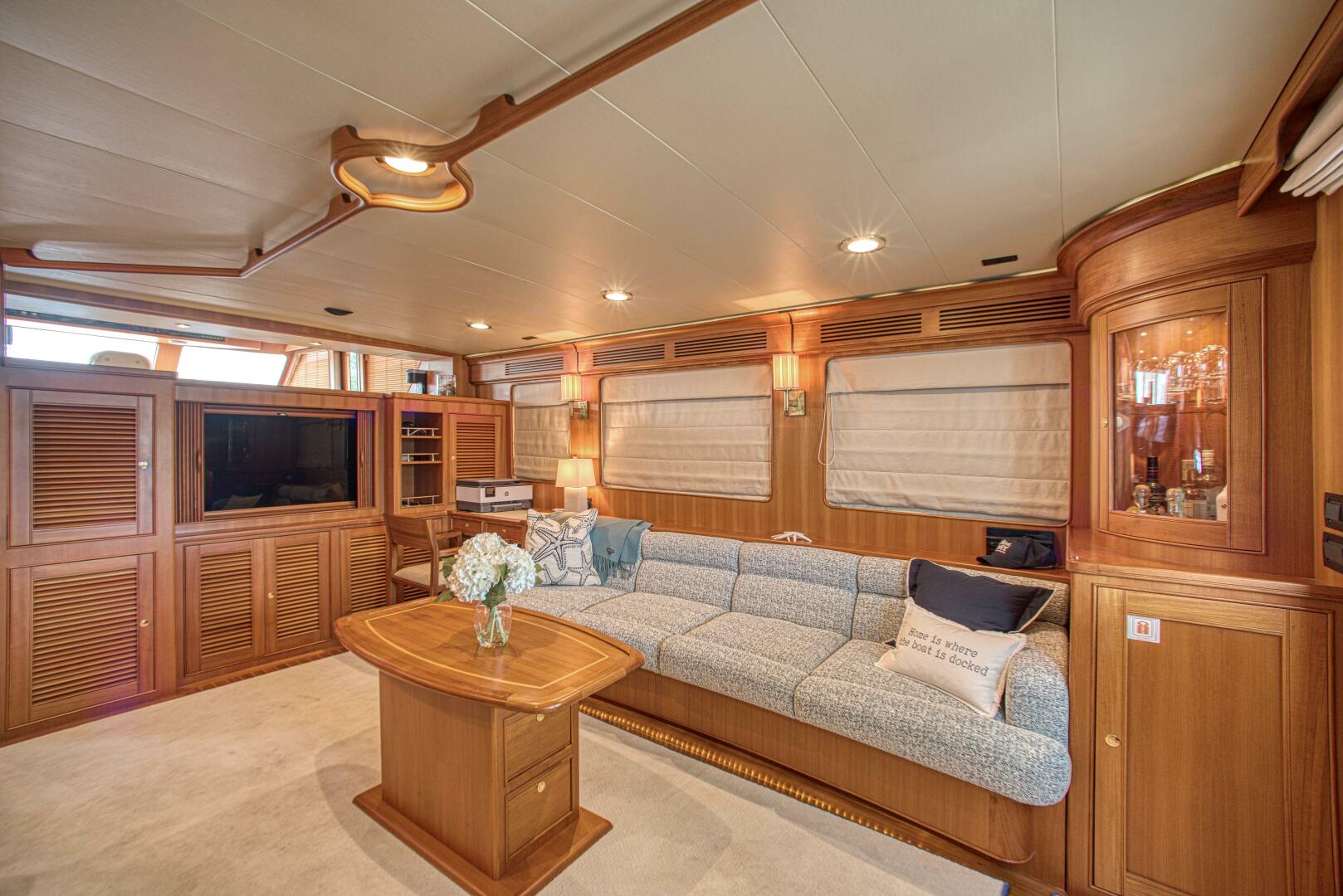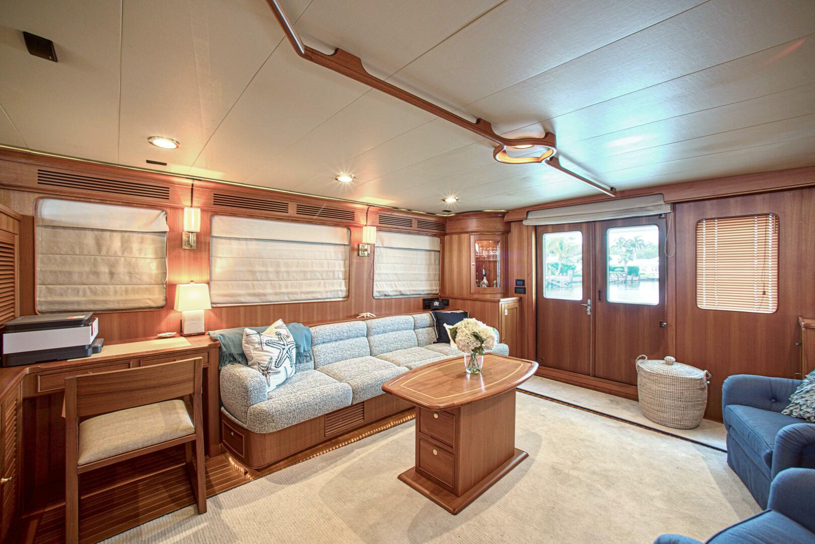 Upon entering the salon, you are immediately struck by the beautiful interior, hand-crafted teak and holly high-gloss floors, and customized teak cabinetry with opulent interior upgrades. The impeccable teak and holly sole and satin-finish teak cabinetry impart a warm, inviting, yet lavish feeling that carries through to every space on the yacht. There is a desk built into the forward corner, complete with a file drawer, so one can work with a view, if necessary while cruising. Upgraded top-of-the-line fabrics and finishes Custom Roman Shade Venetian blinds Solid teak and holly sole Subzero UC-24 beverage center and ice maker Subzero wine cooler Large Samsung LED flat screen high-definition SAT TV mounted discretely behind custom teak tambour doors Custom teak table with storage beneath Two aft opening doors to cockpit