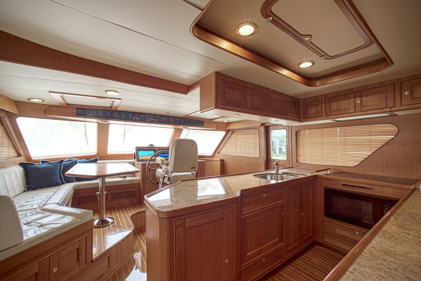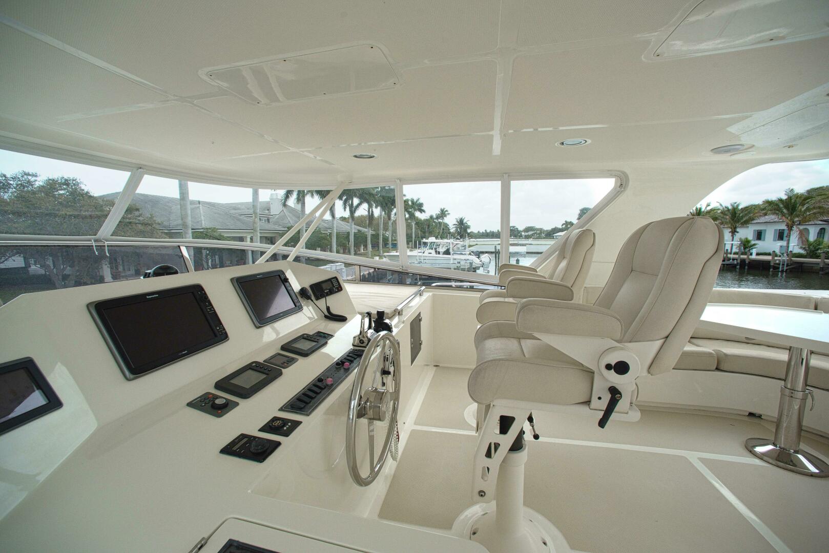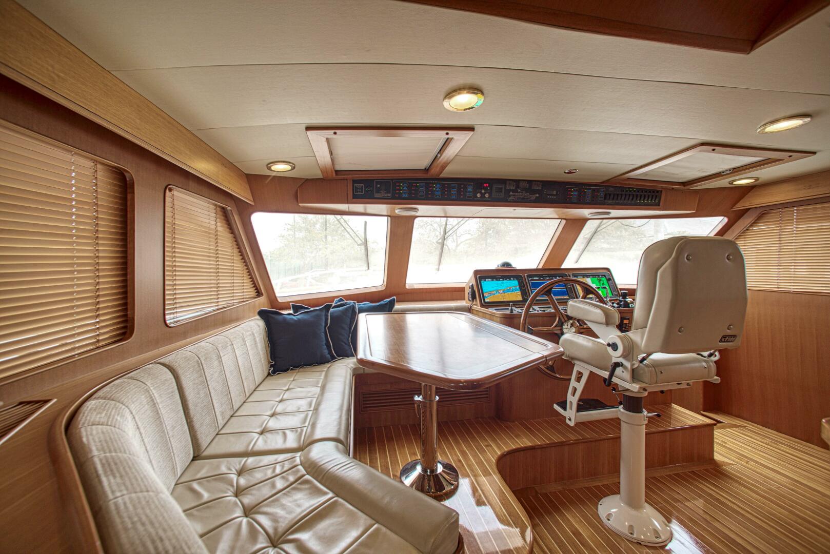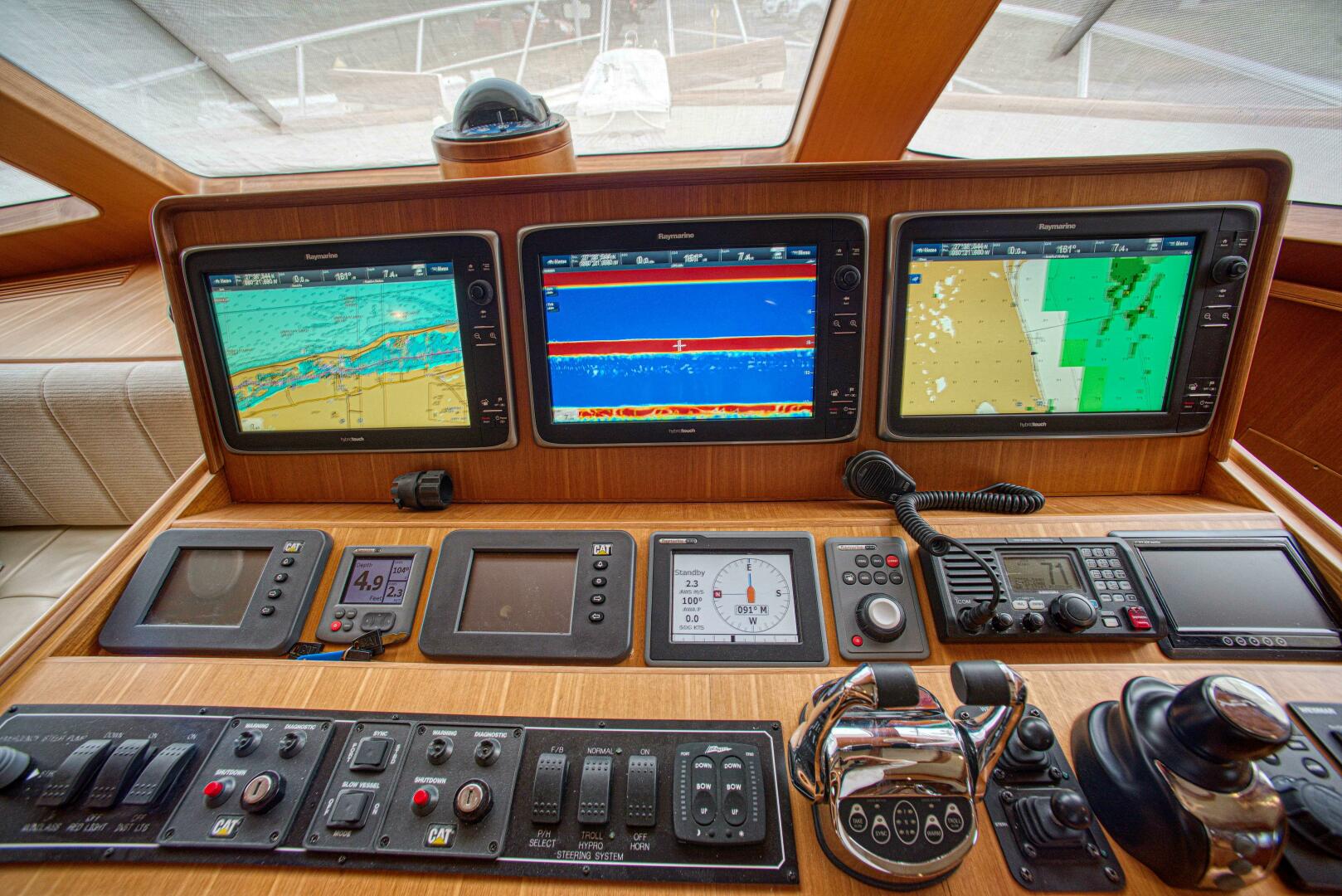 The central Flybridge station is an excellent place to run the boat and is the perfect open-air and open-water living space to enjoy the ocean while cruising. This is the preferred area for passengers when underway, with panoramic views of the ocean and waterways. In addition, the helm offers a grand living space separate from the main deck level, making her a more private space for yacht owners who spend months at a time on board. She has upgraded sun pads forward of the helm. She features two beautiful Stidd helm chairs, a full Raymarine electronics package, a large L-shaped settee, a beverage combination refrigerator with an ice maker, and a chart table. This open flybridge is simply a superb place for cruising and entertaining guests. This area is accessible by stairs from the pilothouse and from the aft cockpit stairs. She boasts plenty of storage and space for entertaining family and guests. New Enclosure Stereo system with upgraded speakers Subzero UC-24 beverage center refrigerator with ice maker Electric grill 1000 pound hydraulic davit with positioning and rotation-telescoping with remote Compass (2) Stidd ultra leather helm chairs Hydraulic power bow and stern thruster controls CAT digital engine monitors 12 volt outlet (2) Raymarine E-Series Hybrid Touch Screens Raymarine Autopilot ST70 and ST70+ ICOM M604 VHF radio Raymarine SR6 Sirius SAT weather and music Raymarine DSM300G Depth Sounder Xyenta Joystick Control KVH Tracvision HD7 Sat TV System Wesmar stabilizer control Engine synchronizer Windlass control CAT engine electronic displays Fuel and water tank monitor Bennett Trim Tabs