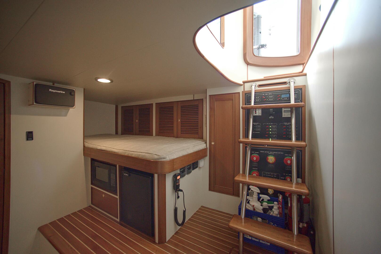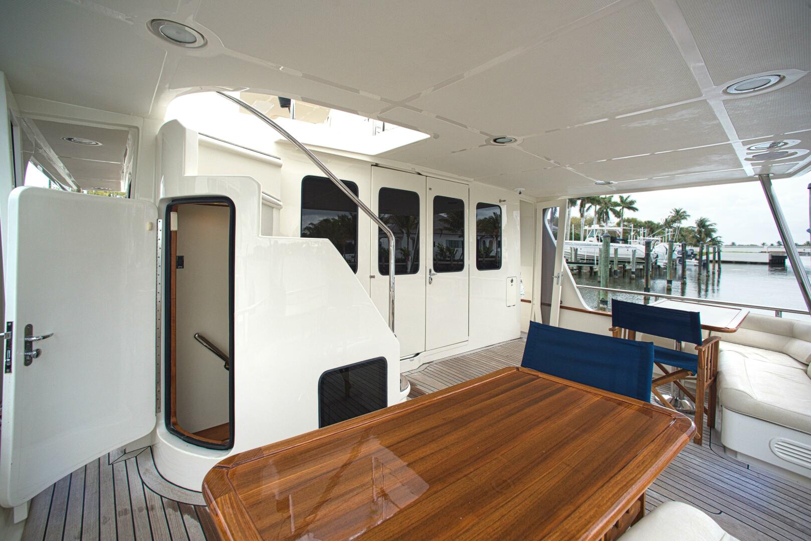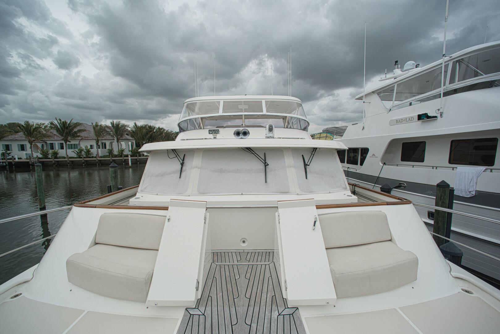 The central Flybridge station is an excellent place to run the boat and is the perfect open-air and open-water living space to enjoy the ocean while cruising. This is the preferred area for passengers when underway, with panoramic views of the ocean and waterways. In addition, the helm offers a grand living space separate from the main deck level, making her a more private space for yacht owners who spend months at a time on board. She has upgraded sun pads forward of the helm. She features two beautiful Stidd helm chairs, a full Raymarine electronics package, a large L-shaped settee, a beverage combination refrigerator with an ice maker, and a chart table. This open flybridge is simply a superb place for cruising and entertaining guests. This area is accessible by stairs from the pilothouse and from the aft cockpit stairs. She boasts plenty of storage and space for entertaining family and guests. New Enclosure Stereo system with upgraded speakers Subzero UC-24 beverage center refrigerator with ice maker Electric grill 1000 pound hydraulic davit with positioning and rotation-telescoping with remote Compass (2) Stidd ultra leather helm chairs Hydraulic power bow and stern thruster controls CAT digital engine monitors 12 volt outlet (2) Raymarine E-Series Hybrid Touch Screens Raymarine Autopilot ST70 and ST70+ ICOM M604 VHF radio Raymarine SR6 Sirius SAT weather and music Raymarine DSM300G Depth Sounder Xyenta Joystick Control KVH Tracvision HD7 Sat TV System Wesmar stabilizer control Engine synchronizer Windlass control CAT engine electronic displays Fuel and water tank monitor Bennett Trim Tabs