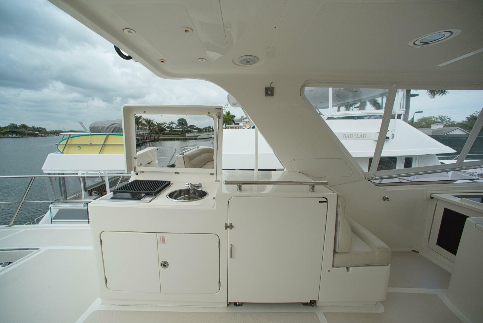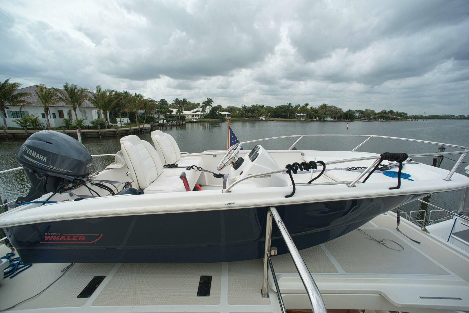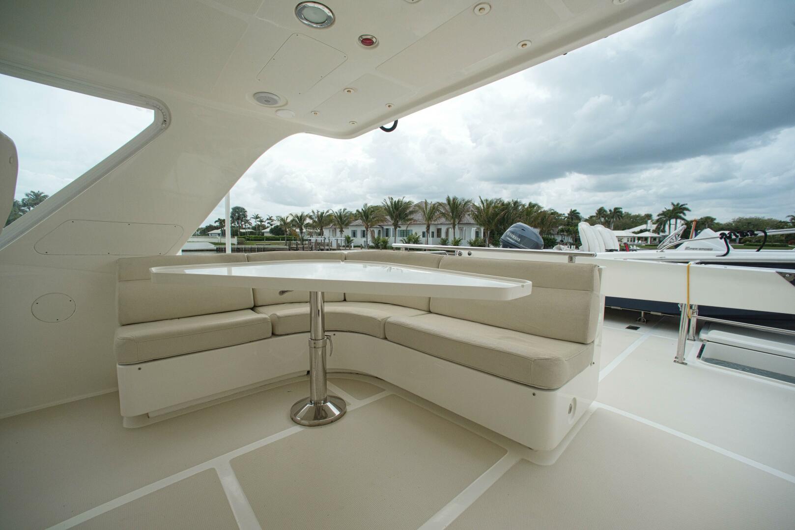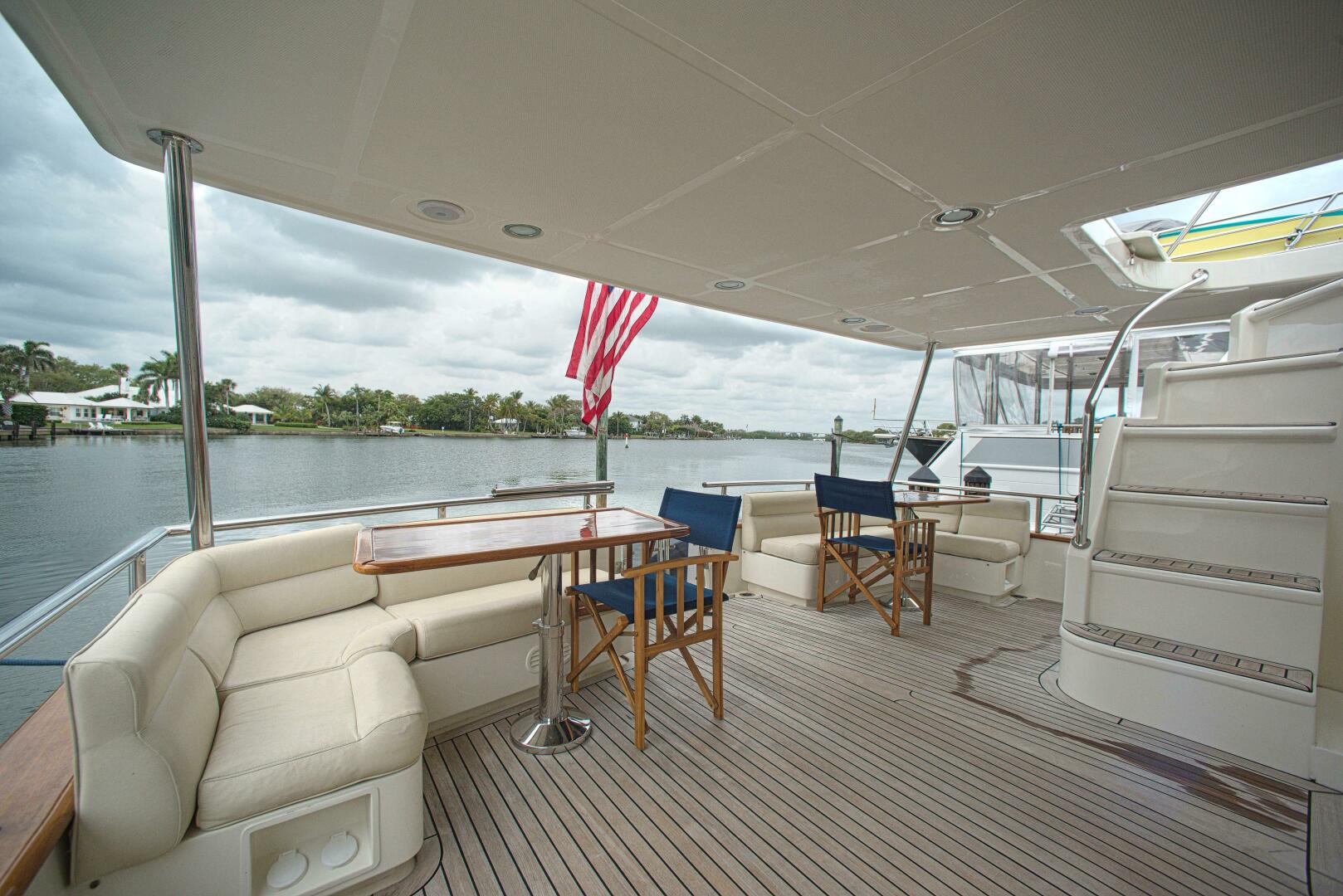 The central Flybridge station is an excellent place to run the boat and is the perfect open-air and open-water living space to enjoy the ocean while cruising. This is the preferred area for passengers when underway, with panoramic views of the ocean and waterways. In addition, the helm offers a grand living space separate from the main deck level, making her a more private space for yacht owners who spend months at a time on board. She has upgraded sun pads forward of the helm. She features two beautiful Stidd helm chairs, a full Raymarine electronics package, a large L-shaped settee, a beverage combination refrigerator with an ice maker, and a chart table. This open flybridge is simply a superb place for cruising and entertaining guests. This area is accessible by stairs from the pilothouse and from the aft cockpit stairs. She boasts plenty of storage and space for entertaining family and guests. New Enclosure Stereo system with upgraded speakers Subzero UC-24 beverage center refrigerator with ice maker Electric grill 1000 pound hydraulic davit with positioning and rotation-telescoping with remote Compass (2) Stidd ultra leather helm chairs Hydraulic power bow and stern thruster controls CAT digital engine monitors 12 volt outlet (2) Raymarine E-Series Hybrid Touch Screens Raymarine Autopilot ST70 and ST70+ ICOM M604 VHF radio Raymarine SR6 Sirius SAT weather and music Raymarine DSM300G Depth Sounder Xyenta Joystick Control KVH Tracvision HD7 Sat TV System Wesmar stabilizer control Engine synchronizer Windlass control CAT engine electronic displays Fuel and water tank monitor Bennett Trim Tabs