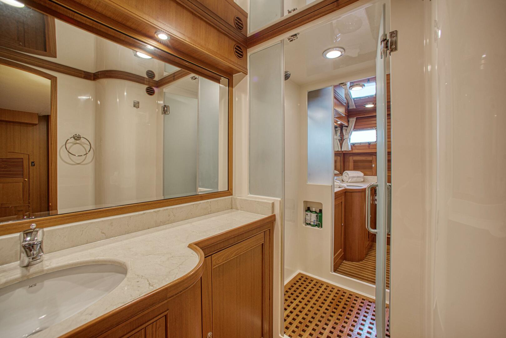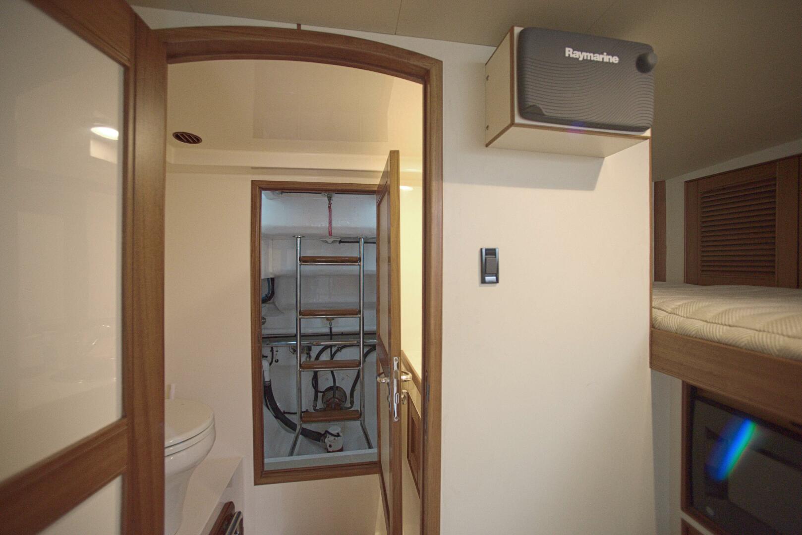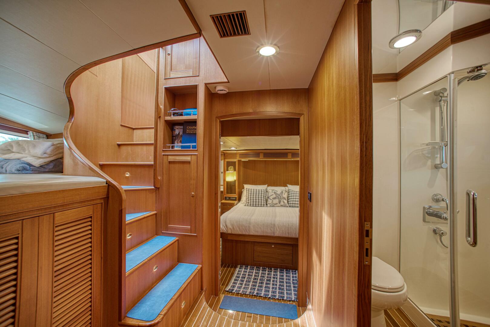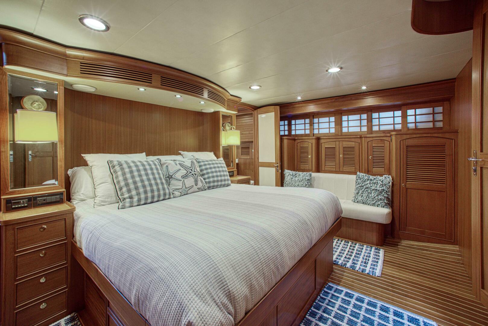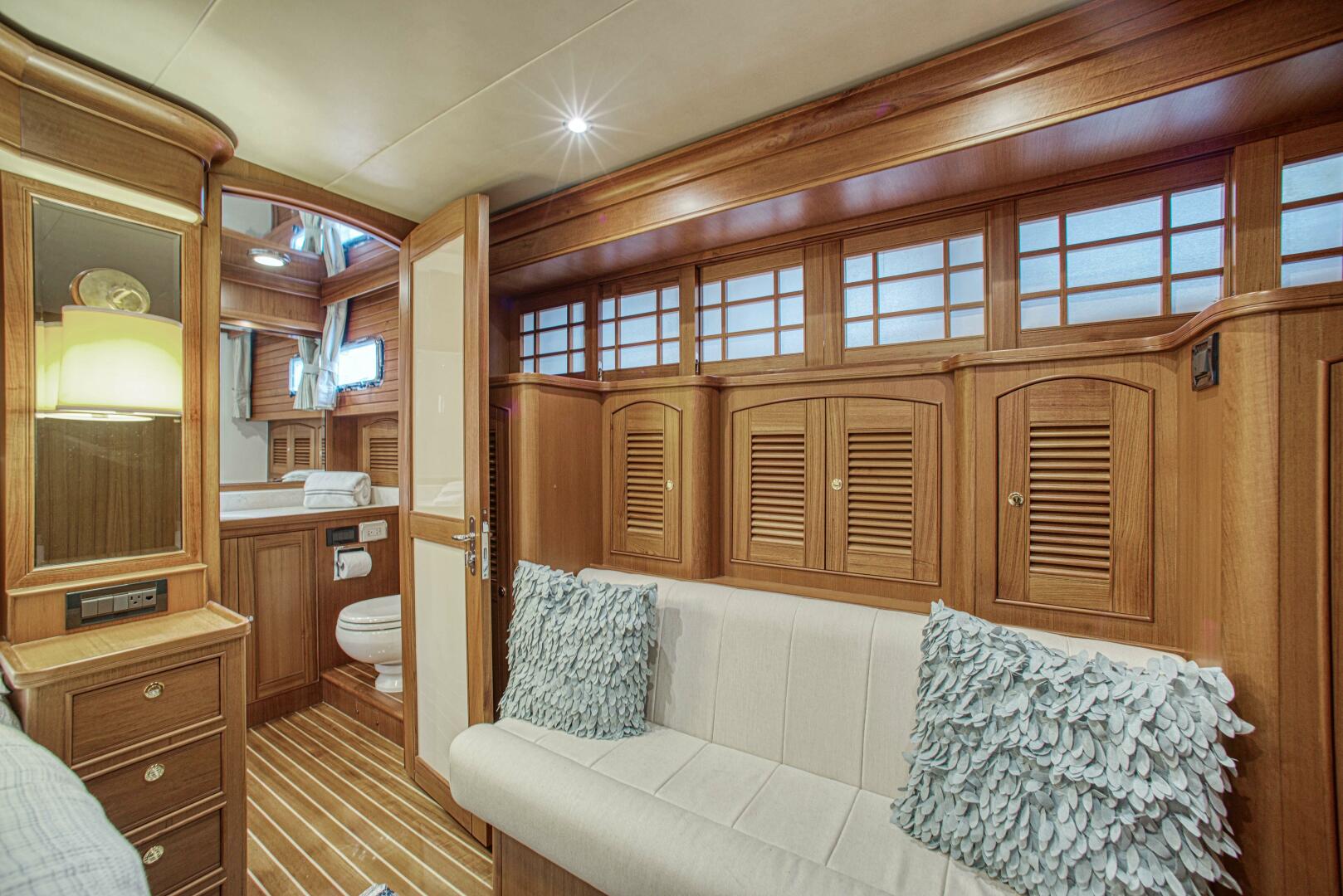 Upon entering this master stateroom, one walks through the gorgeous double doors. This specially designed extra-large full beam master suite has a custom king-size bed that lies centerline with its upgraded (2) privately separated his/her heads and the custom-created common shower between them. Abundant drawers, lockers, and hanging cabinets exemplify the Marlow Yachts philosophy of leaving no space unused. The quiet, chilled water air-conditioning system flows A/C or heat gently throughout the entire space. Teak and holly decks and beautiful teak bulkheads establish a warm and sumptuous feeling. This full beam master stateroom offers a very pleasing look with abundant teak and satin finish; large, fixed portholes throughout along with exquisite shoji screens on both port and starboard sides for letting the natural light in as well as excellent privacy when docked at a T head. Beautiful custom sofa settee is located port side of the master berth with an additional cabinet built underneath for even more storage space. The port holes in the head open and provide excellent cross ventilation when desired. • Custom Settee with sofa storage port• King size bed with custom memory foam mattress• Cedar lined hanging lockers• Air conditioning (reverse cycle chilled water)• Four drawers under berth and hidden storage• His/her private heads with common shower (2 sinks, 2 toilets)• MSR Heads windows open for cross ventilation when desired• Grohe fixtures• Sharp flat screen T.V.• Sony stereo with Samsung DVD player• Direct Satellite T.V.• Owner Safe