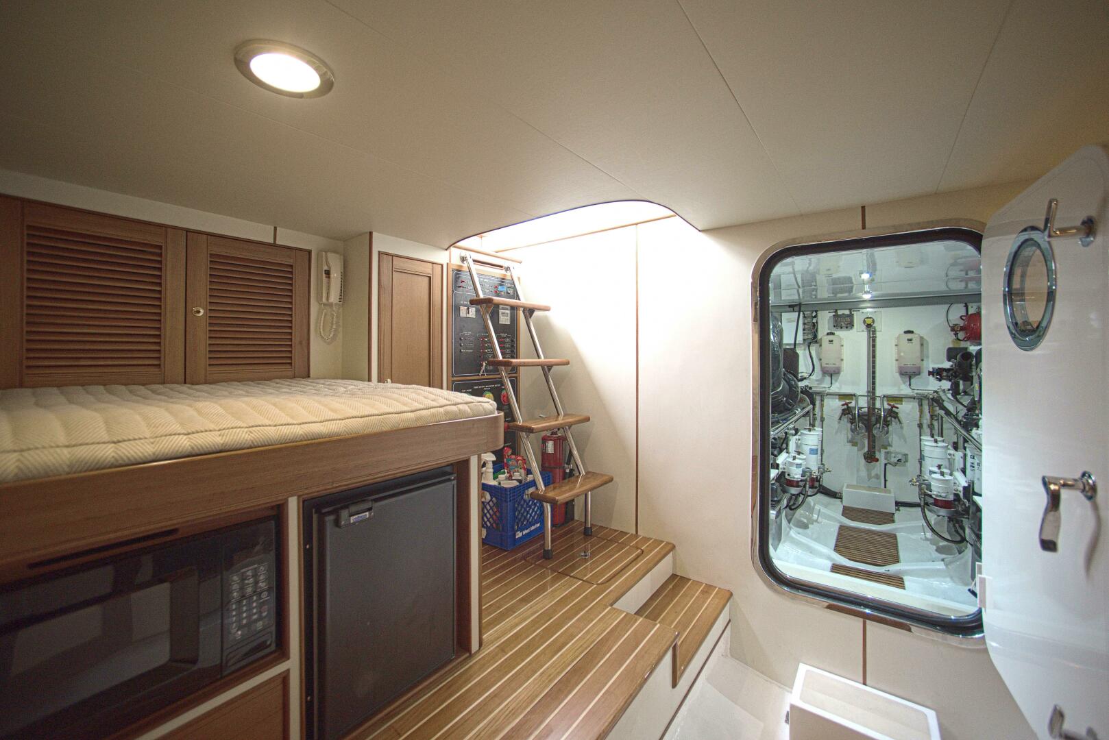 The full-size “standup” engine room area offers incredibly easy access to all equipment, engines, and systems, which provides excellent lighting and is air-conditioned for comfort and convenience when inspecting and performing maintenance. This engine room is very spacious, and both outboard sides can be easily reached. Upgraded and redundant Onan 17KW generators are perfect for the long-range cruiser who may visit New England in the summer and perhaps the Bahamas in the winter, perfect for long periods of at-anchor fun. There are 2 strategically placed entry positions to the engine room and crew quarters. One is exceptionally easy access from a tall watertight doorway from the aft cockpit, leading into a spacious, finished, and air-conditioned crew quarters and lazarette area. The other engine room entry is accessed from the door located on the aft swim platform steps for easy loading and unloading of materials, equipment, and other functions for convenience. • Twin 1015hp C-18 Caterpillars Diesel Engines only 960 hours• Velocijet Strut Keels, protect propellers from grounding and provide excellent tracking abilities• Wesmar stabilizers with dual station controls (pilot house and flybridge)• Hydraulic bow and stern thrusters• Hydraulic trim tabs• Engine synchronizer• 24 volt exhaust fans• High water/temperature/exhaust alarms• Racor Dual crossover fuel filtration system on engines and generators with vacuum gauges• Oil change system• Electronic controls at upper and lower stations and Aft deck station• Oil Filled Shaft system with thrust bearing• Color coded piping• Xenta Joystick Control• 900 GPD Sea Recovery Watermaker• Dual (redundant) Sea Chest for all seawater inlets• Air conditioning in engine room and crew quarters• Chilled water reverse cycle air conditioning throughout• AGM batteries• 5 blade S class Nibral props• Extensive noise insulation• Stainless steel water heaters• (2) Charles Isoboost Power Conditioner