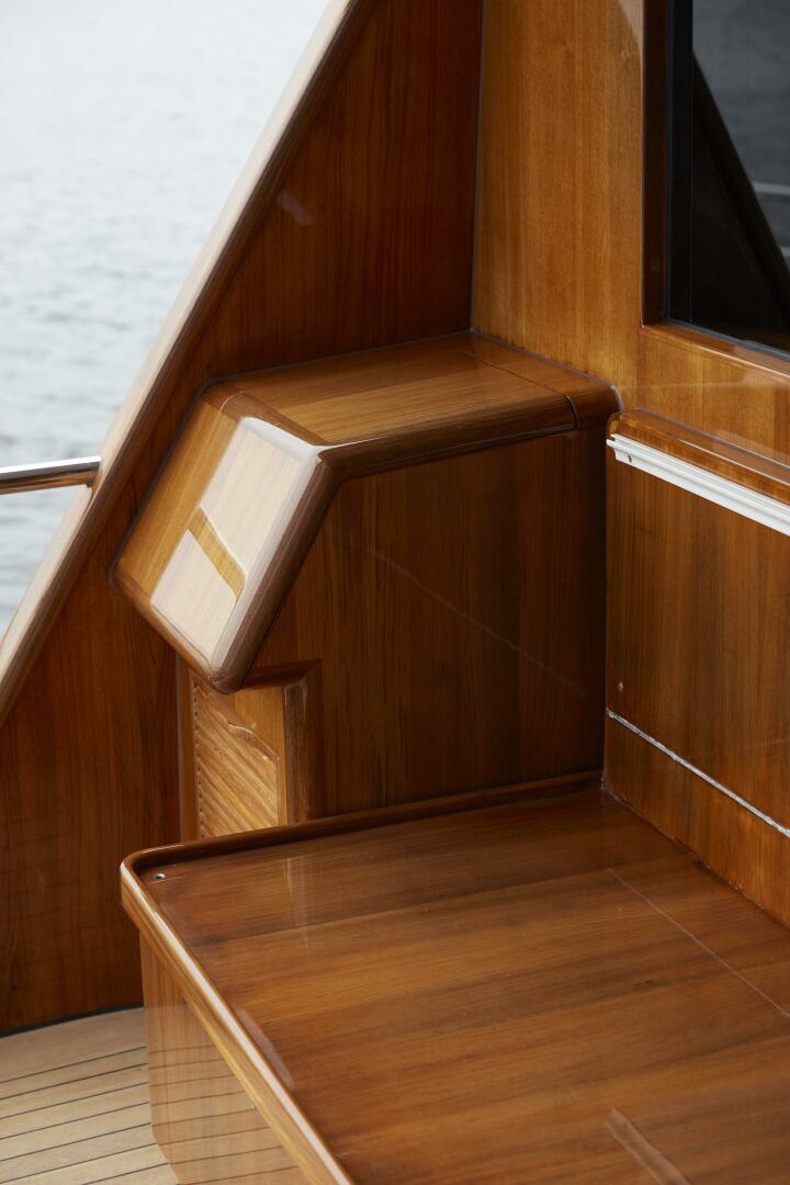 Boarding the cockpit – port or starboard, on her custom boarding system, the intricate details begin. Natural teak cap rails and teak decks, along with a varnished teak transom and varnished teak bulkheads, give an immediate, elegant feeling. Complete with all the necessary equipment to fish or entertain, nothing has been overlooked in its stunning design, which is elegant, clean, and practical.