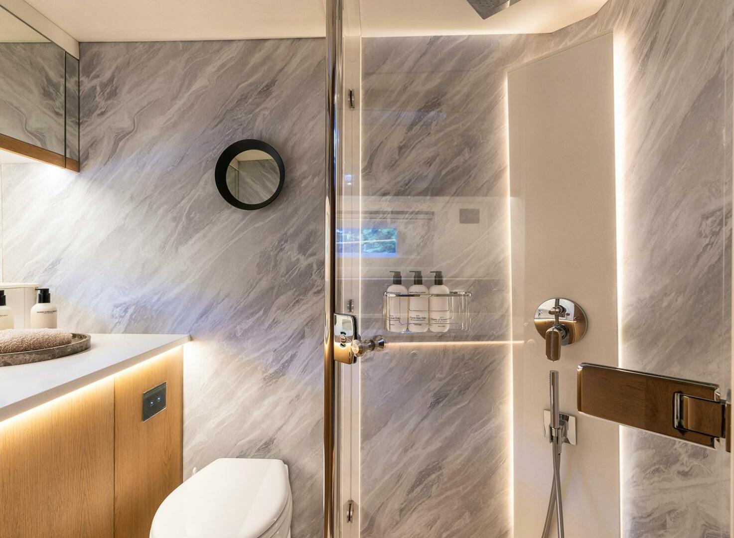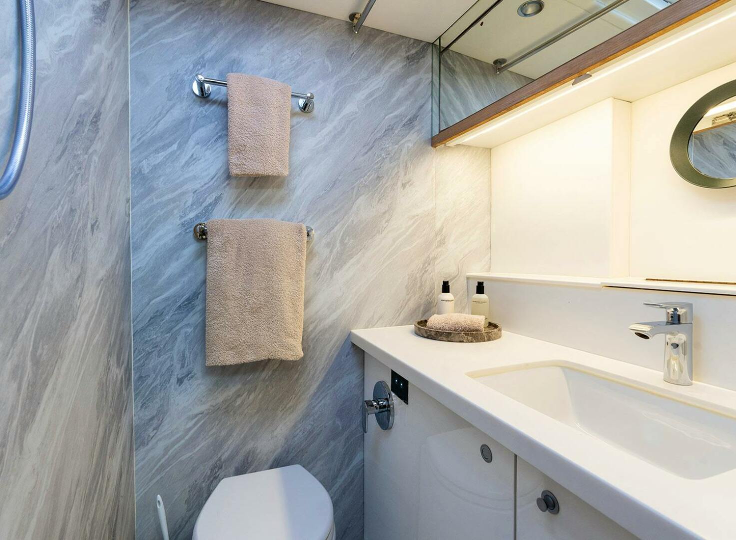 Inside, her modern, fresh interior features wraparound deck saloon windows that provide panoramic views. The salon is finished in fine wood tones and light cream fabrics. The port-side dining area comfortably seats eight, while the forward-facing navigation station to starboard is ideally positioned for easy access to controls. The fully equipped galley features white-grey marble countertops, a Miele induction hob and electric oven, and top-tier appliances, ensuring effortless meal preparation whether at anchor or underway.
