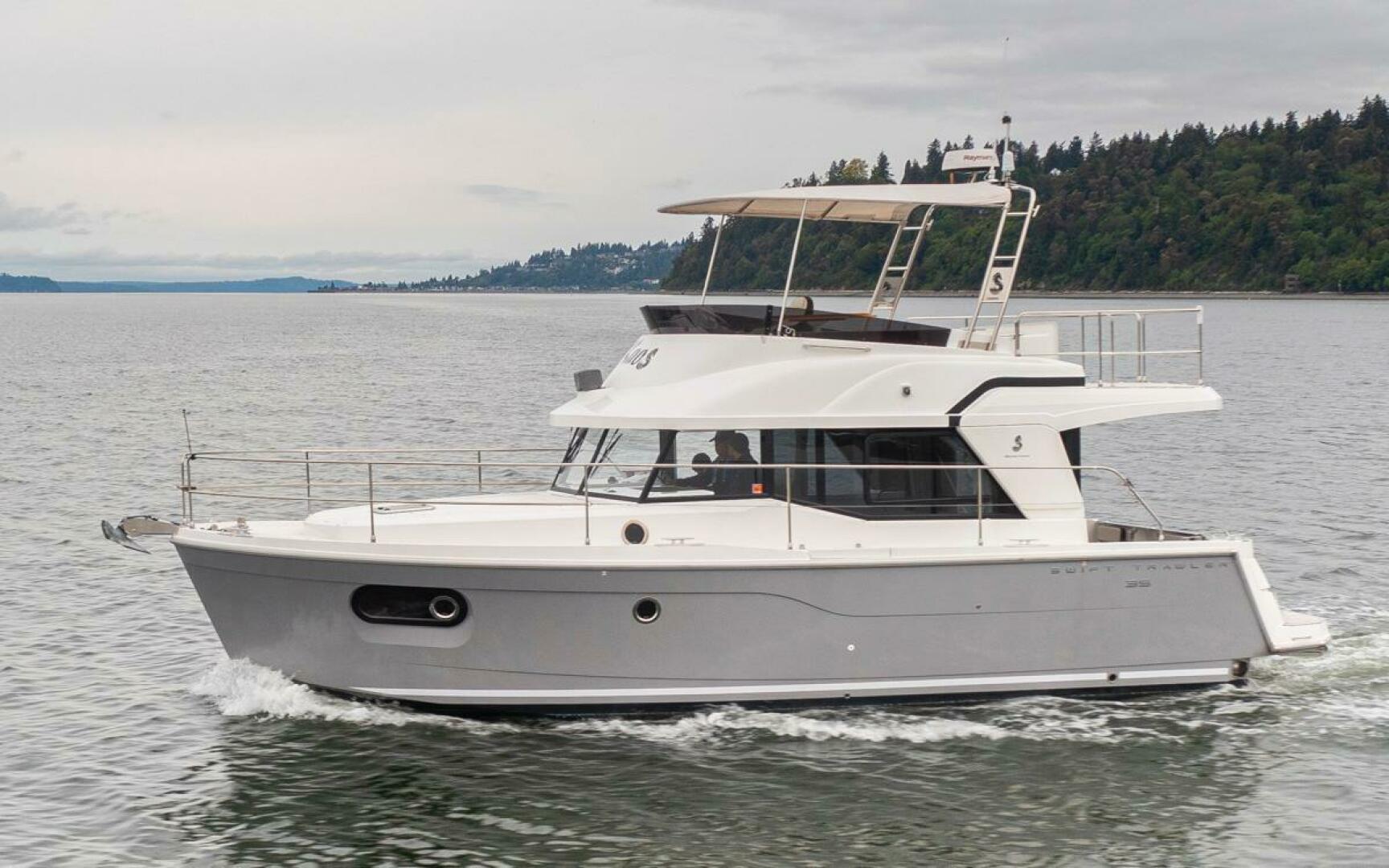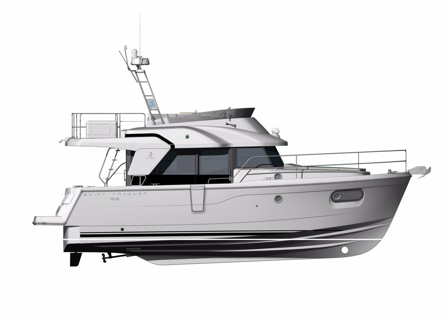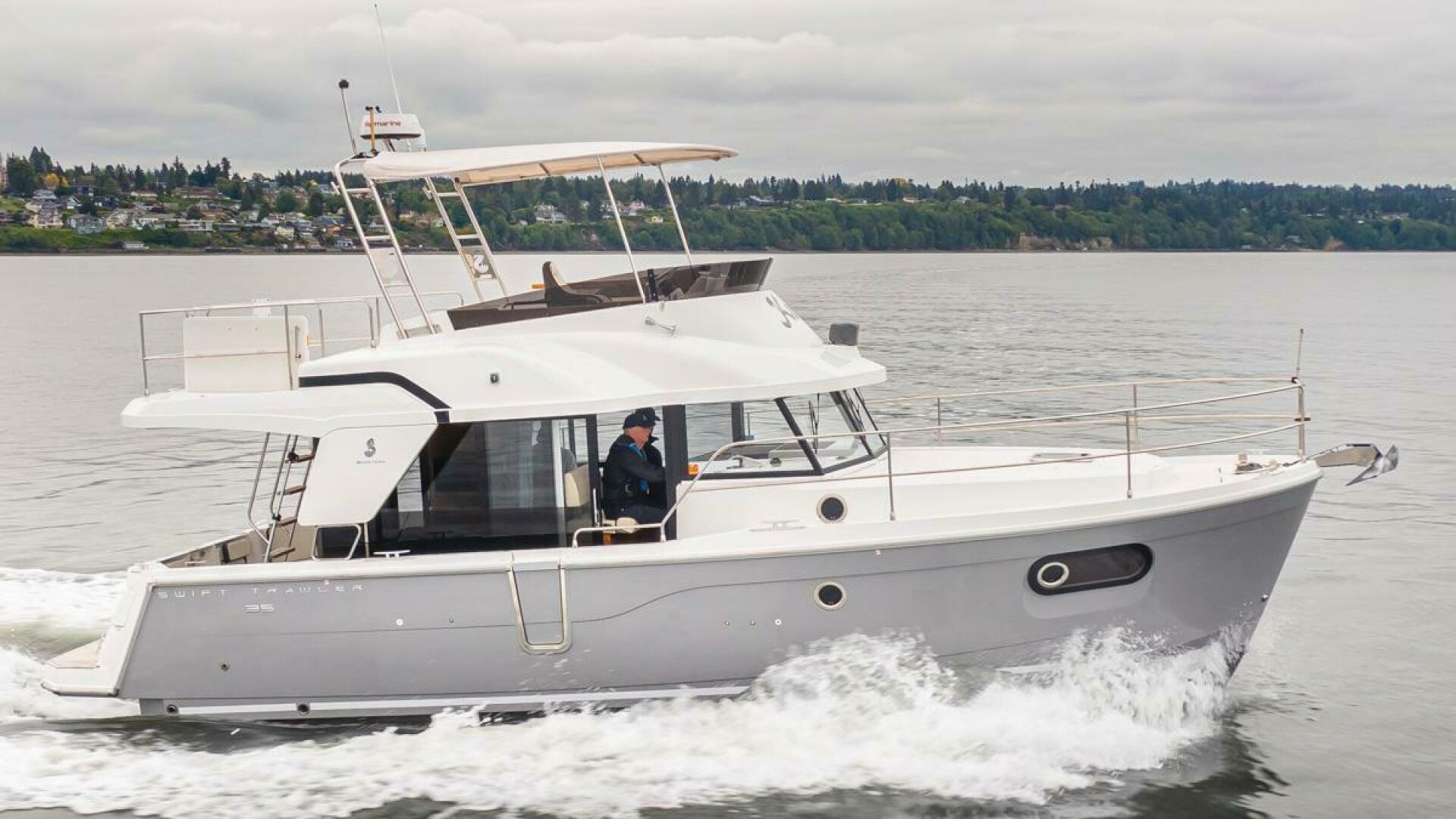 The Swift Trawler 35 has strong harmonious lines making you feel reassuringly safe, and this quality is repeated in the design and fit out choices. Built on a semi-planing hull developed through the expertise of Beneteau Power, the Swift Trawler 35 has a Cummins 425 hp engine, and together they procure pleasure underway and offer easy maneuvering. Protected by a fixed Bimini, the Swift Trawler 35's flybridge has a comfortable living space with a sea view.