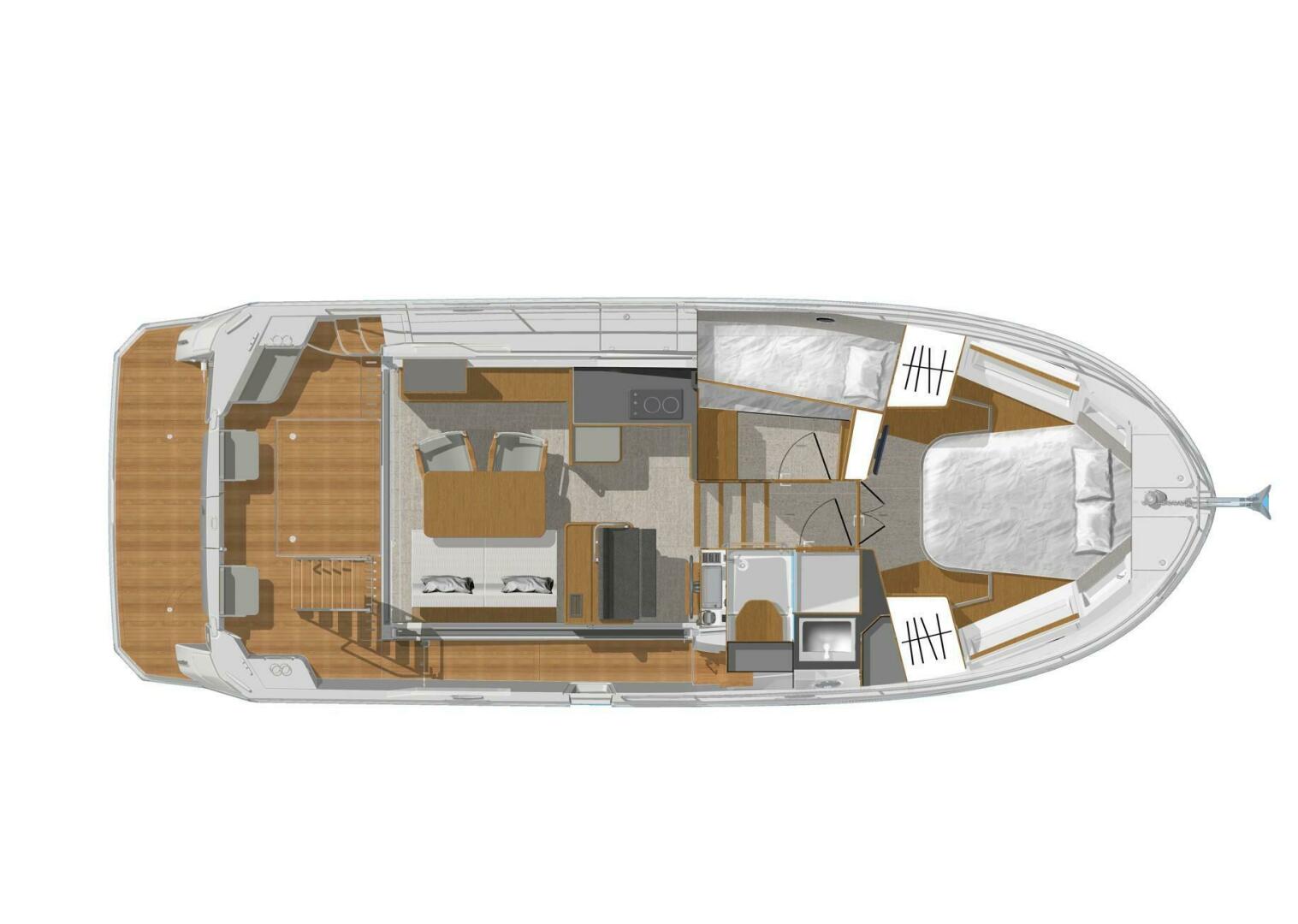 Intended for long cruises, the Swift Trawler 35 offers a spacious interior with ingenious contemporary fittings. The entirely glazed wheelhouse affords a 360° view and creates a pleasant atmosphere. You enter the owner cabin with en-suite shower room and a second cabin with bunk berths, by a gullwing door. There is plenty of space for guests on the Swift Trawler 35. Fitted with a twin sink that converts to a worktop and an extra forward-facing seat, the U-shaped galley offers a convivial living space on board. The sofa-bed in the saloon converts to a comfortable double berth. The teak wood matching the wonderfully easy to clean Efficiency upholstery creates a cozy atmosphere indoors.