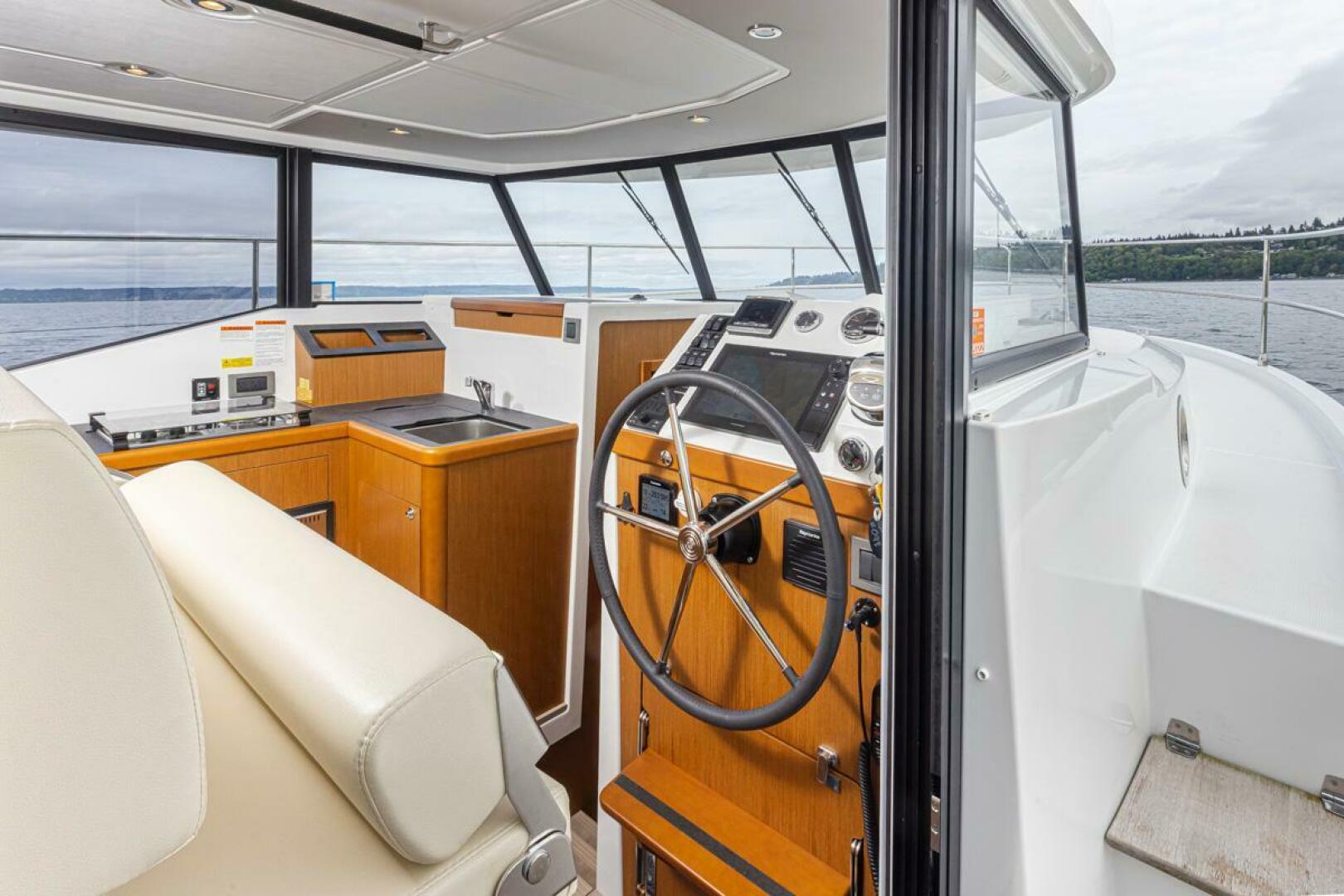 - Pilot console with control panel including Electric engine controls, Electric windlass control*, Thruster* and Trimtab