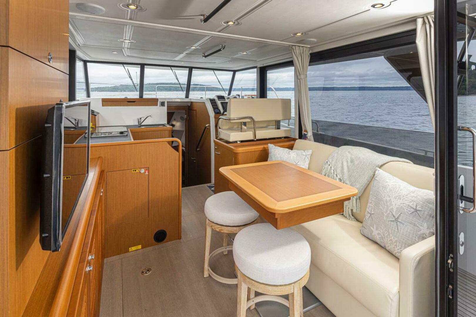 - Flybridge saloon on port side consisting of a U-shaped bench seat with built-in storage and a removable solid wood table