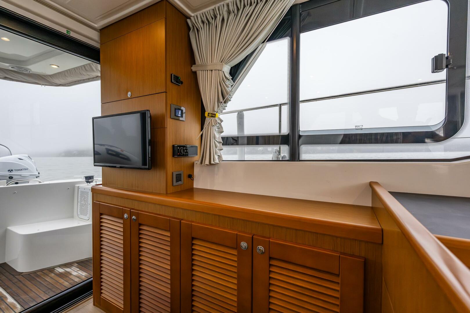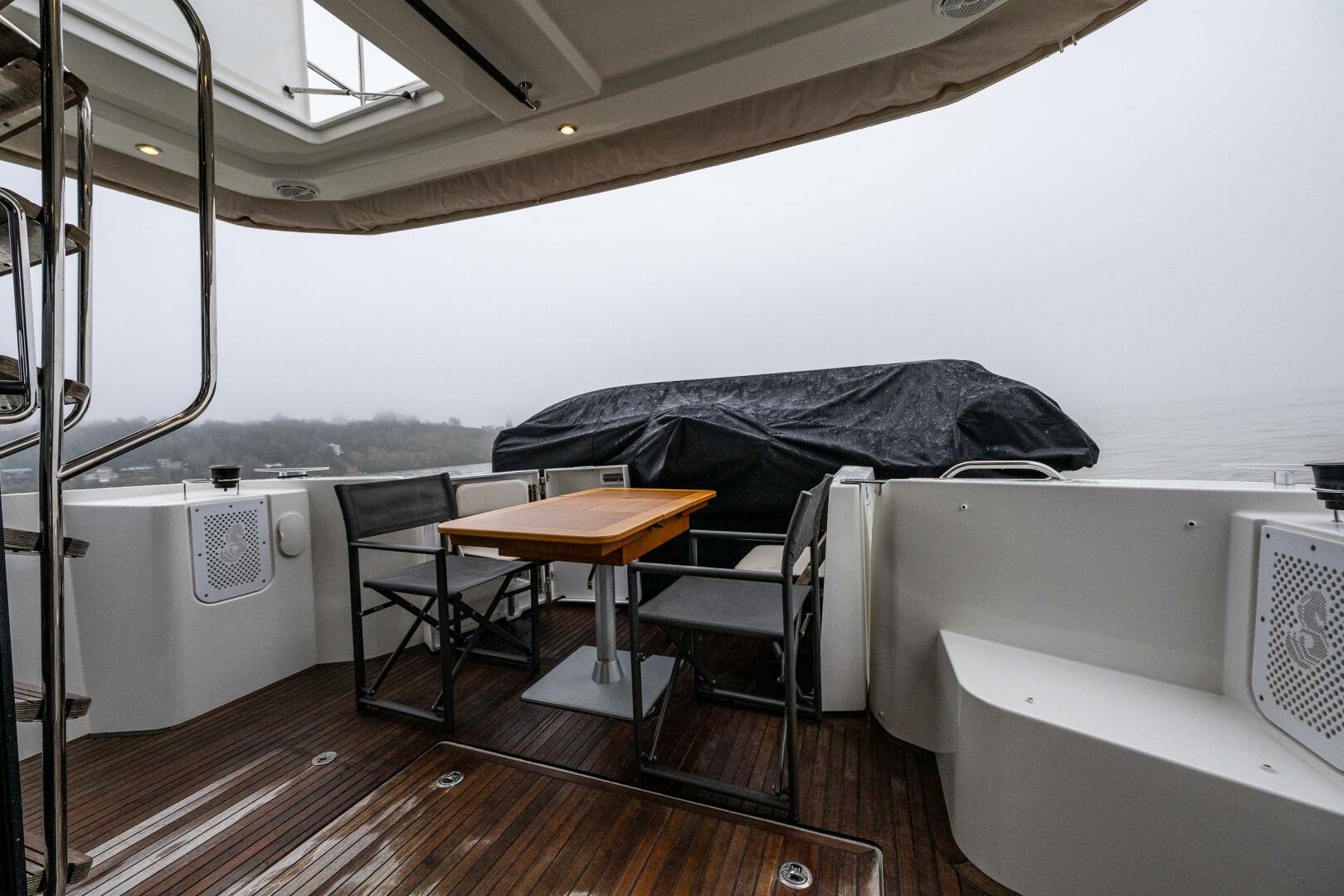 - Flybridge saloon on port side consisting of a U-shaped bench seat with built-in storage and a removable solid wood table