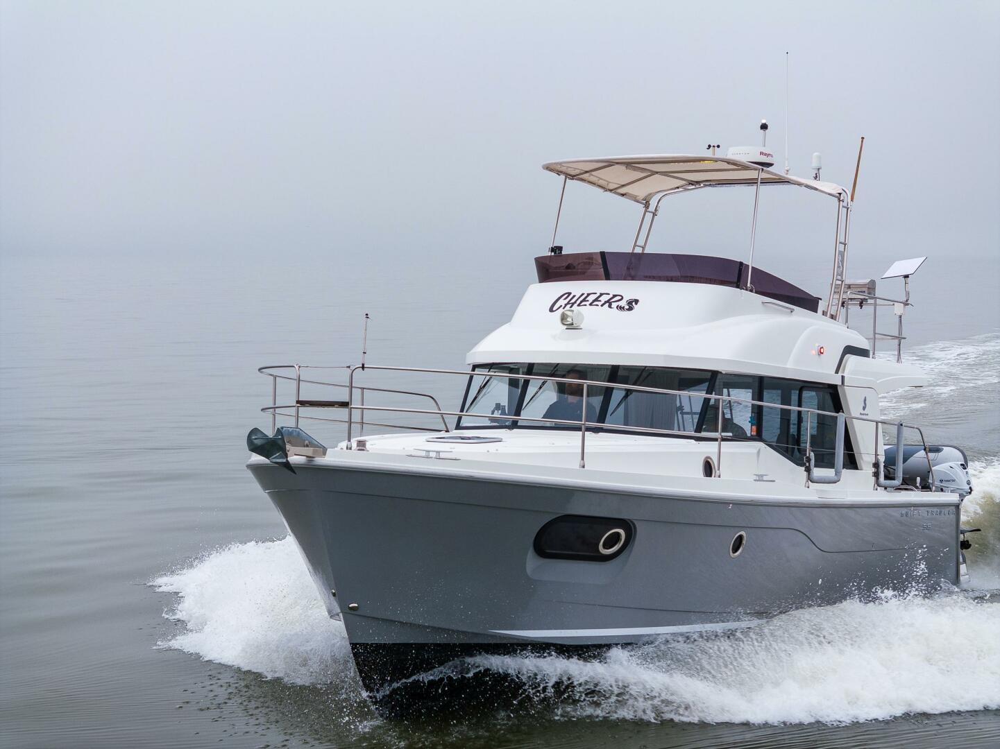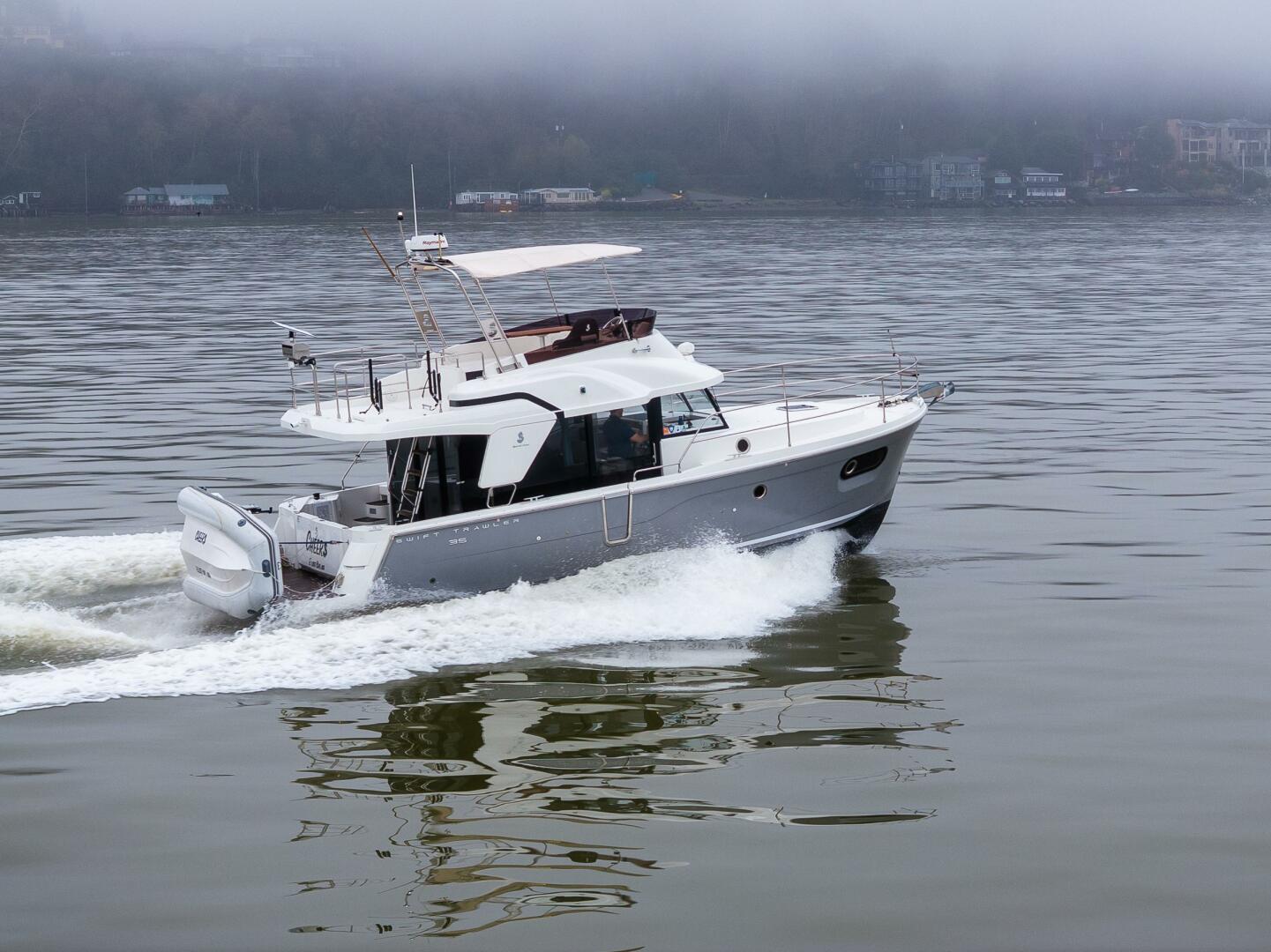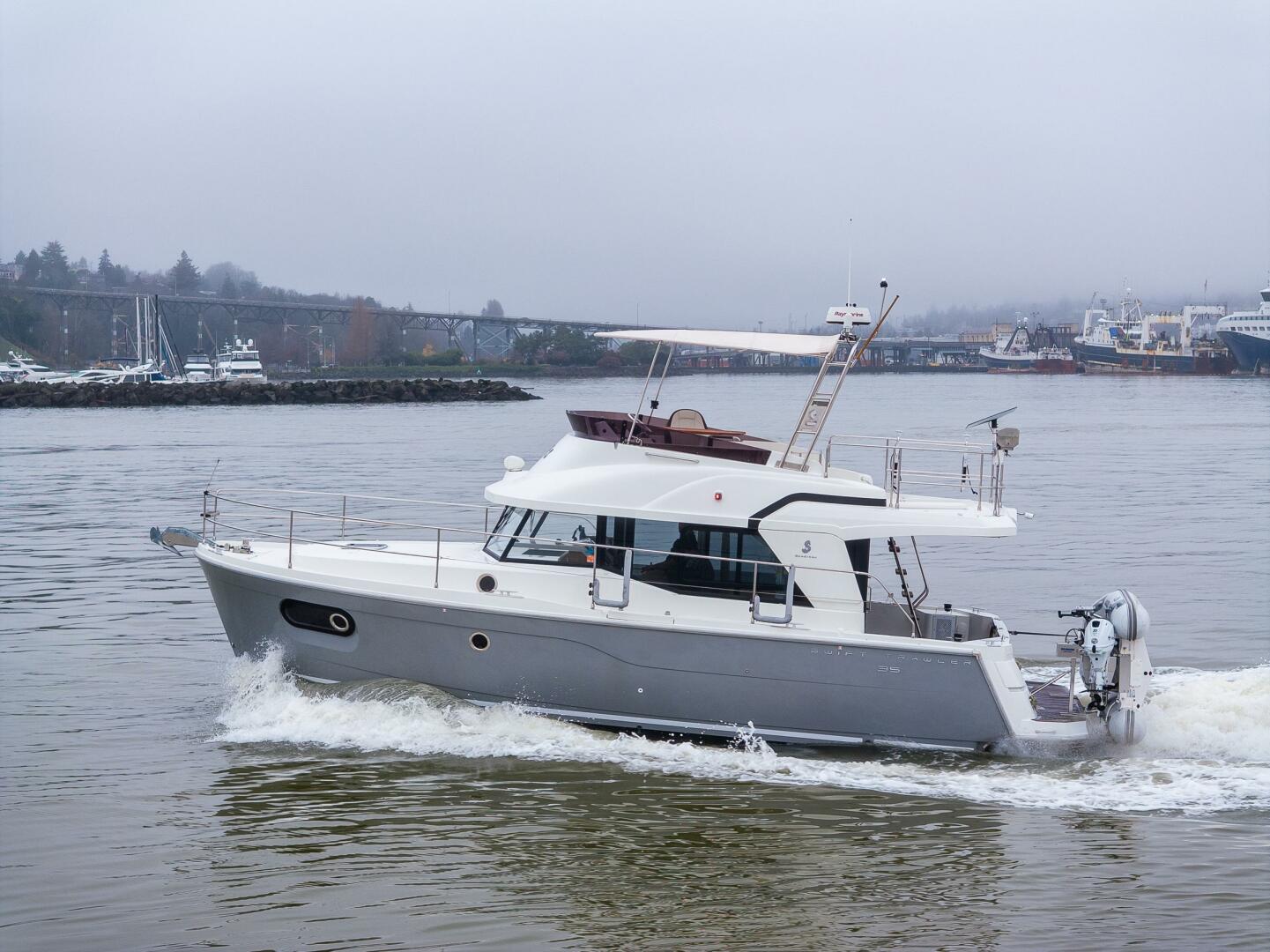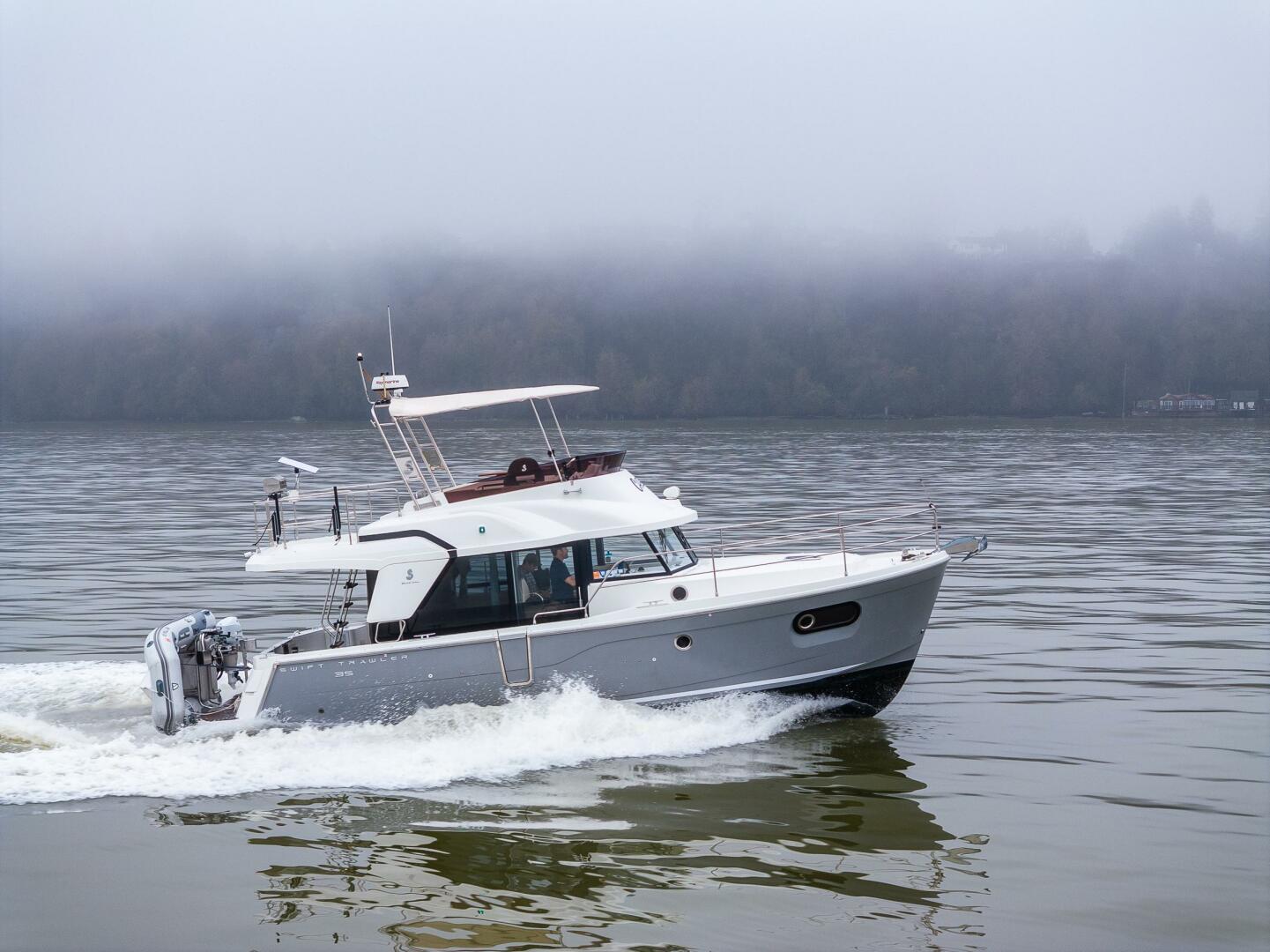The Swift Trawler 35 has strong harmonious lines making you feel reassuringly safe, and this quality is repeated in the design and fit out choices. Built on a semi-planing hull developed through the expertise of Beneteau Power, the Swift Trawler 35 has a Cummins 425 hp engine, and together they procure pleasure underway and offer easy maneuvering. Protected by a fixed Bimini, the Swift Trawler 35's flybridge has a comfortable living space with a sea view.