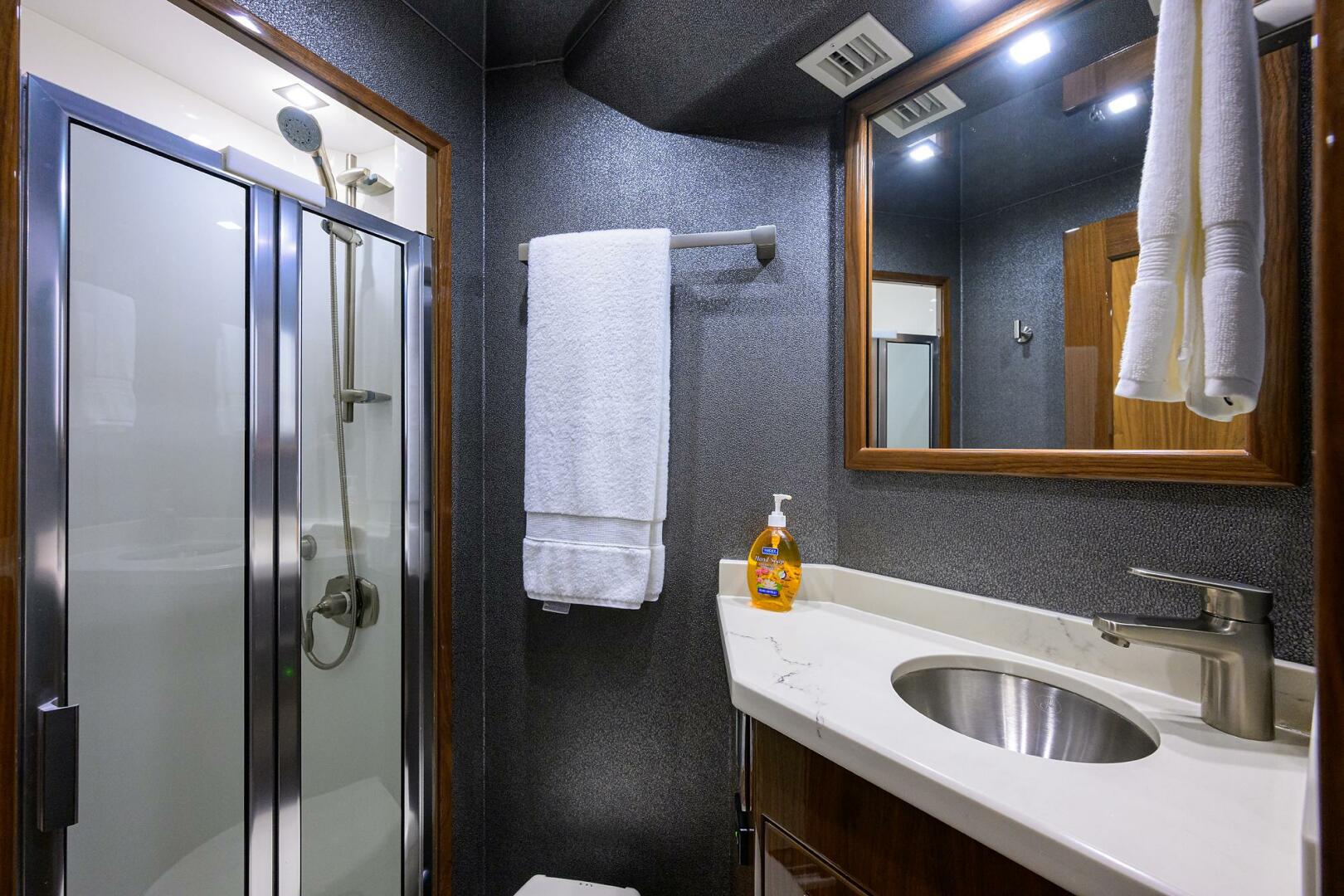 Corintios features 4 staterooms, 4 ensuite heads, and day head located starboard aft off salon. The forward VIP cabin has crossover layout with a queen and single berth.