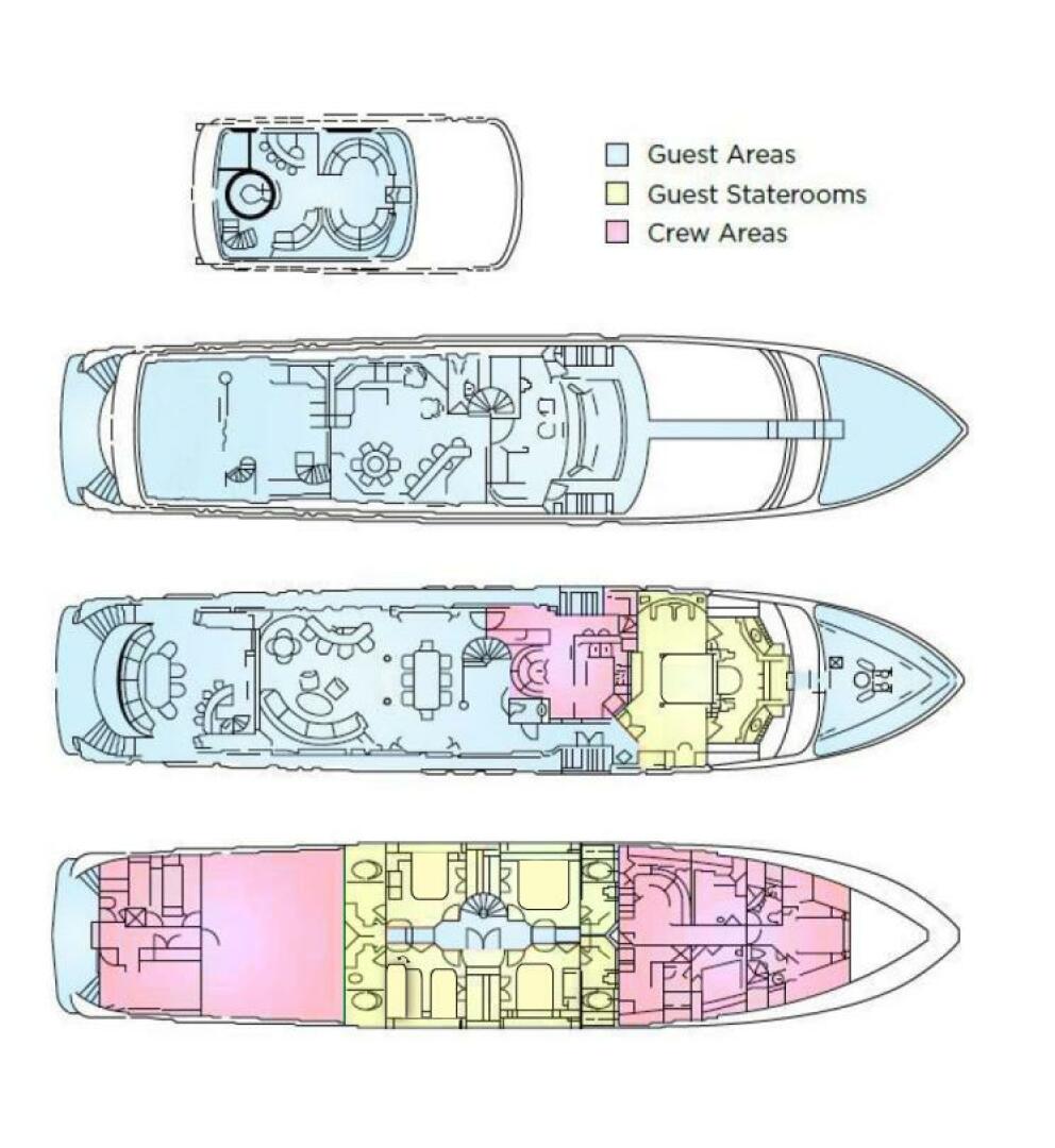 • Music system with keypad controls in galley, salon, aft deck boat deck, sun deck and sky lounge
