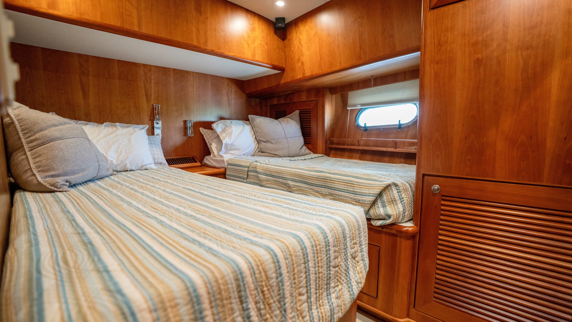 Moving forward from the master stateroom, a lower foyer area provides access to the guest accommodations and includes a new full-size washer and dryer. To port is a cozy guest stateroom with twin side-by-side berths, perfect for family or visiting guests. The cabin features cedar-lined storage and opening portlights, maintaining the same quality finishes found throughout the yacht.