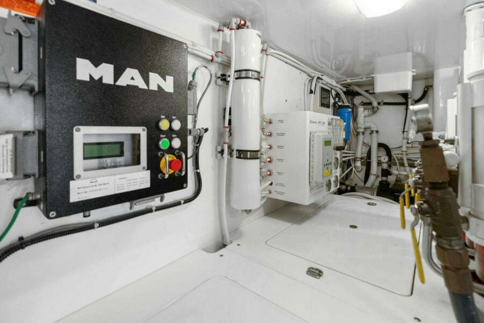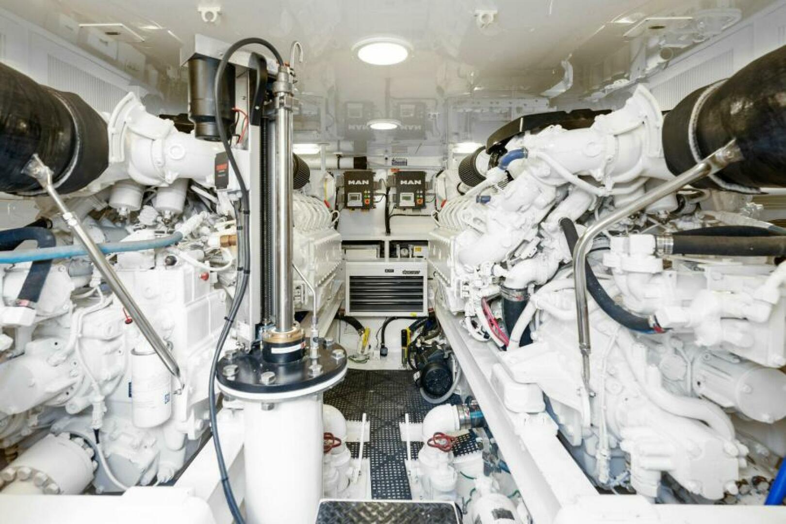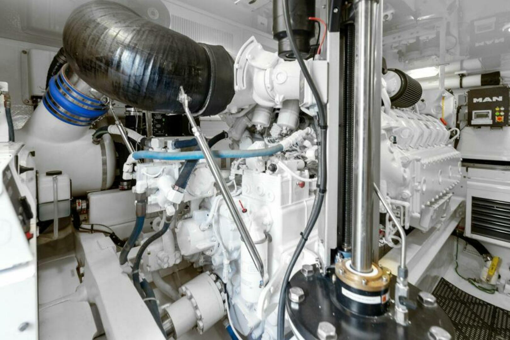 - Mechanically, the new Viking 55 Convertible is peerless in construction and performance. Viking’s industry innovative powder-coated engine beds secured to dedicated intermediate bulkheads isolate torque and vibration to reduce engine noise and ensure drive-train alignment. The Delta-T engine room ventilation system incorporates supply and discharge fans for proper air supply and water intrusion suppression. A comprehensive gauge package, plus remote engine start/stop switches are accessible immediately inside the engine room access door. The centralized sea-water supply system saves weight and room by minimizing the necessary plumbing and hardware, yet maximizes delivery and capacity, while also providing redundancy. Valves and fittings are labeled, and chafe gear protects wiring and hoses where needed. Fiberglass hull side fittings reduce upkeep and add style. In addition to high-capacity bilge pumps, clean out pumps in the keel area, plus additional condensate pumps for the air conditioning and refrigeration systems help keep the bilge dry. All bilge areas are sealed with Awlgrip coatings for visibility and easier maintenance, as are brass thru-hull fittings in the engine room, lazarette and forward bilge areas.Twin 1550 hp. Diesel MAN V-12's