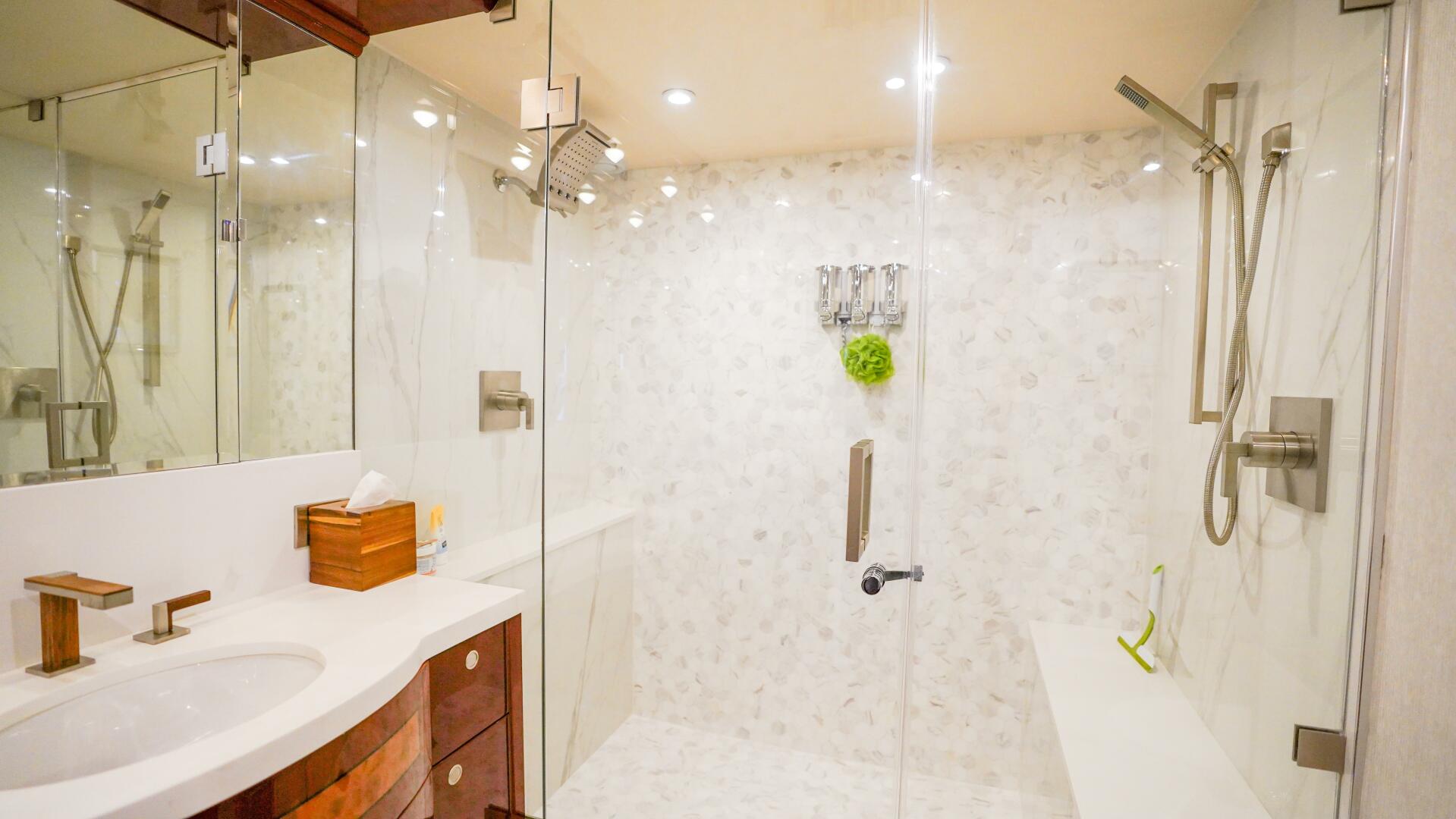 - Comprehensively Refitted Bathroom with New Dual Head Shower with Marble Veneer Throughout & Glass Enclosure, Floor Tiles, Countertops & Dometic Toilet