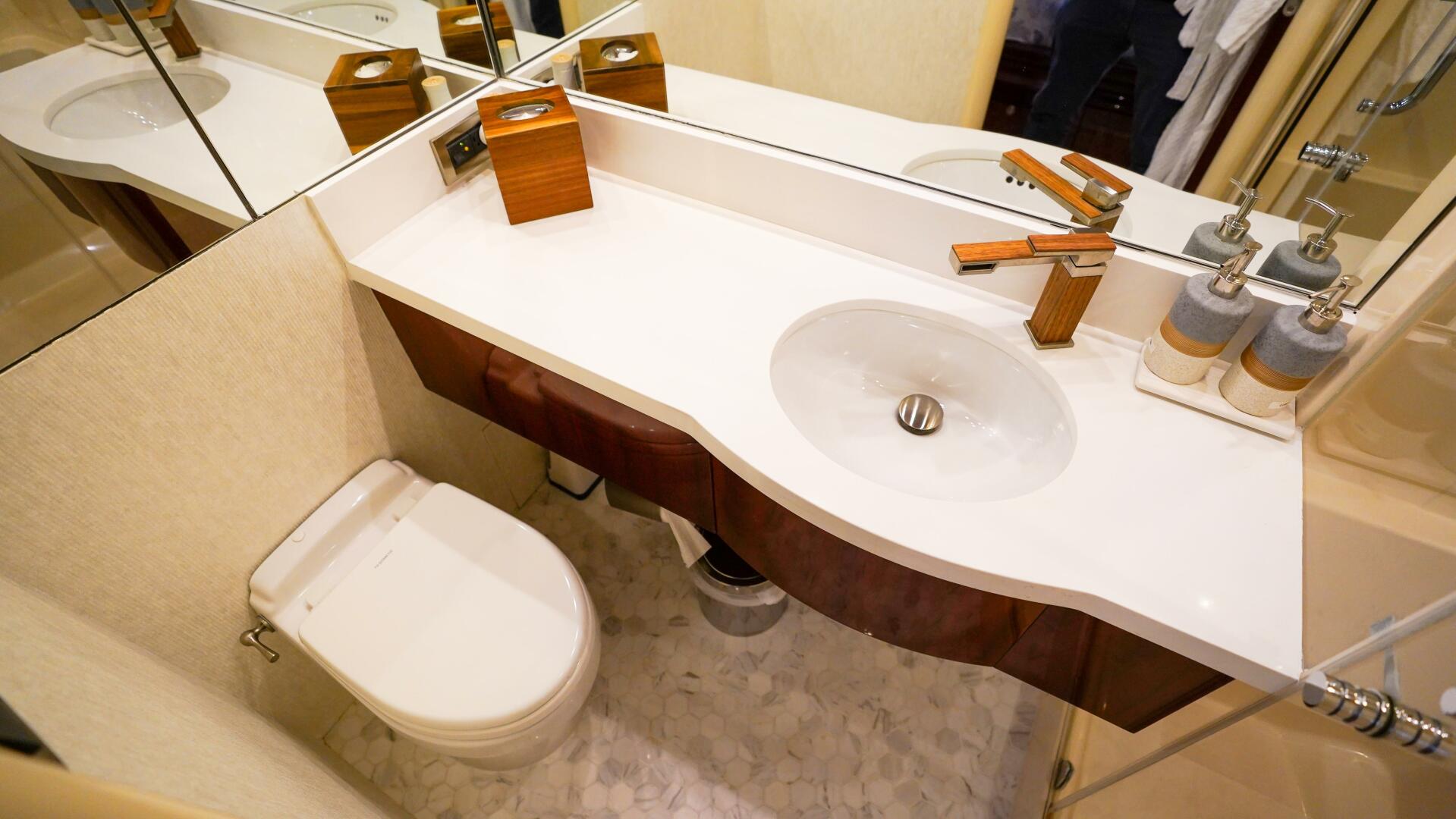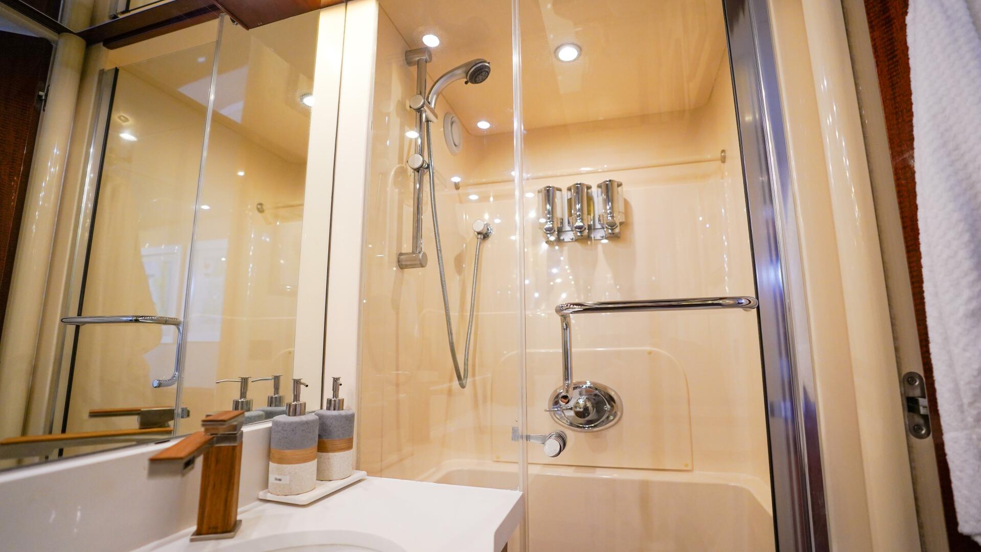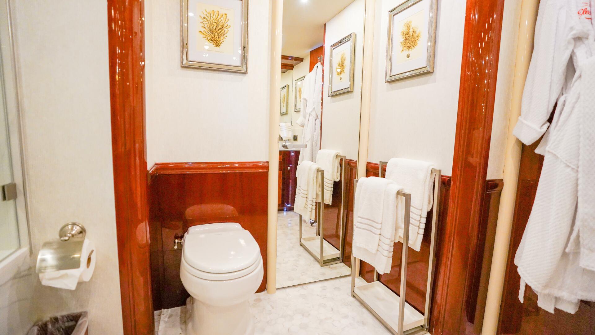 Continuing forward on the main deck, the on-deck owner’s stateroom offers a rare and highly desirable arrangement, centered around a king-size berth with storage below and surrounded by finely crafted cherry cabinetry. The suite includes built-in dressers, nightstands, a vanity or desk area, seating, and generous natural light through large port windows, while the en-suite master bath features marble finishes, dual sinks, and an oversized glass-enclosed shower, creating a private retreat equal to that of much larger yachts.