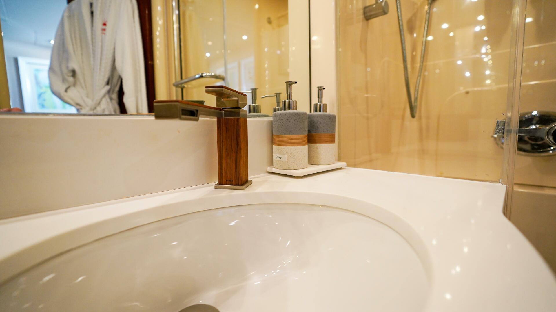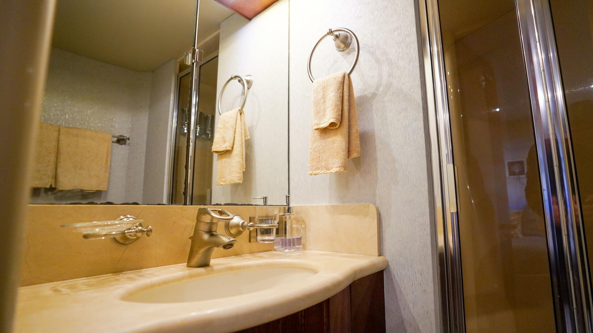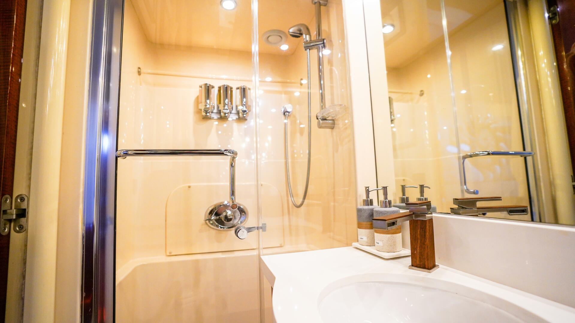 Continuing forward on the main deck, the on-deck owner’s stateroom offers a rare and highly desirable arrangement, centered around a king-size berth with storage below and surrounded by finely crafted cherry cabinetry. The suite includes built-in dressers, nightstands, a vanity or desk area, seating, and generous natural light through large port windows, while the en-suite master bath features marble finishes, dual sinks, and an oversized glass-enclosed shower, creating a private retreat equal to that of much larger yachts.