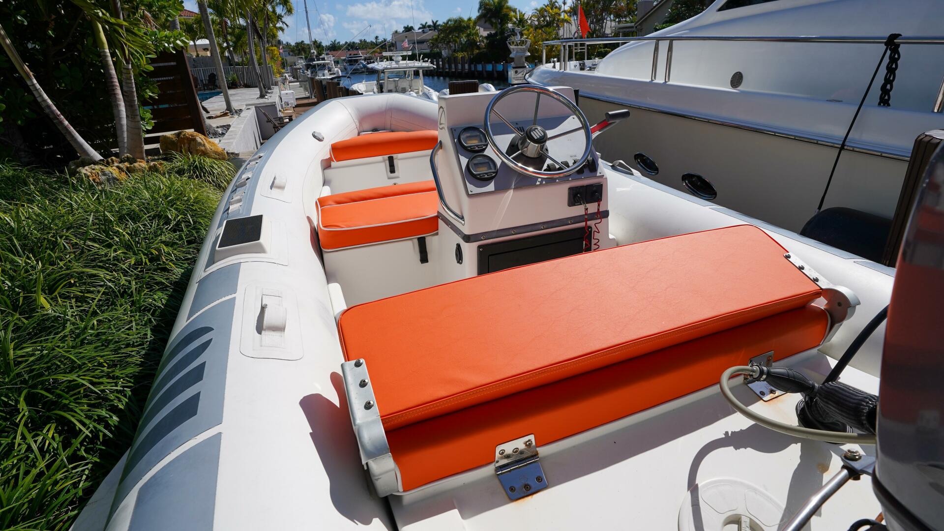 Moving aft from the Sky Lounge, the flybridge opens into an expansive outdoor living area featuring a full bar with refrigeration, seating and dining space, and unobstructed views. A hydraulic davit and tender storage are positioned aft, allowing for easy deployment of the included tender and toys, while the elevated vantage point makes this space perfect for entertaining, relaxing, or overseeing docking operations.