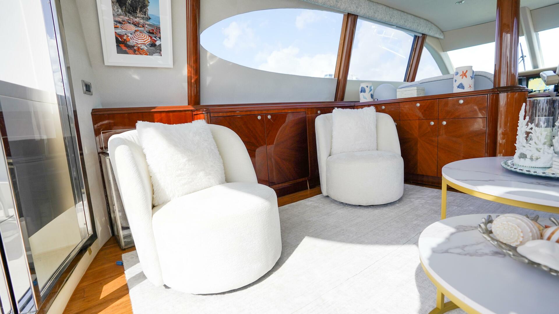 Stepping inside, the salon immediately impresses with its expansive layout, custom cherry wood joinery, and abundant natural light. An inviting L-shaped sectional sofa and upholstered club chairs create a relaxed lounge atmosphere, complemented by cocktail and end tables, while built-in cabinetry to port and starboard offers extensive storage. Forward, a formal dining area with a cherry dining table and seating for six is perfectly positioned beneath custom soffit lighting, and an entertainment center with a concealed flat-screen TV provides an elegant focal point without interrupting sightlines.