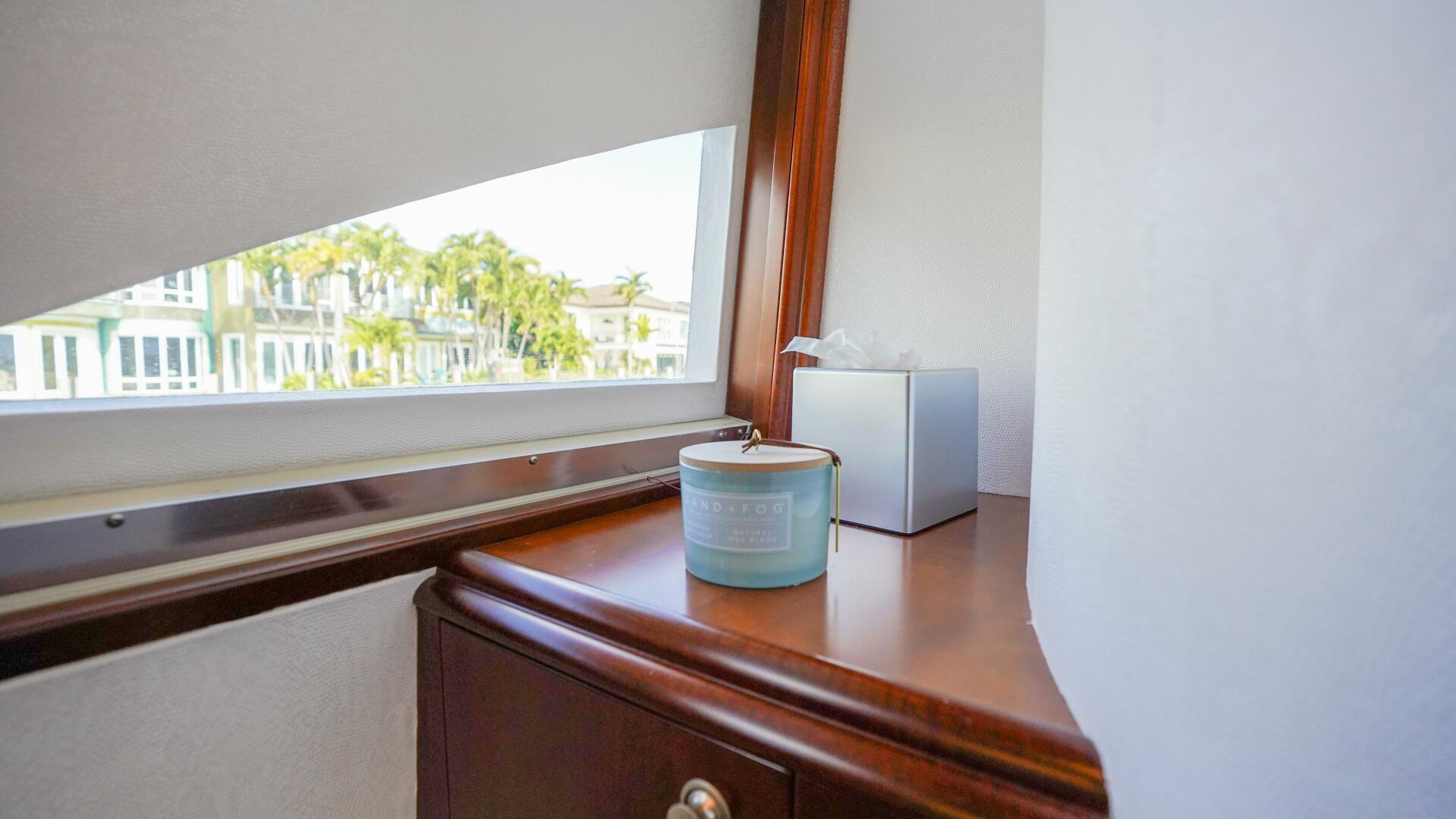 Descending to the lower level, the guest accommodations are arranged for privacy and comfort, featuring two queen staterooms with walk-around berths, ample storage, entertainment systems, and private en-suite baths finished in marble. Opening portlights provide fresh air and light, while quality sound insulation ensures quiet relaxation underway or at anchor, making this layout ideal for hosting family and guests.