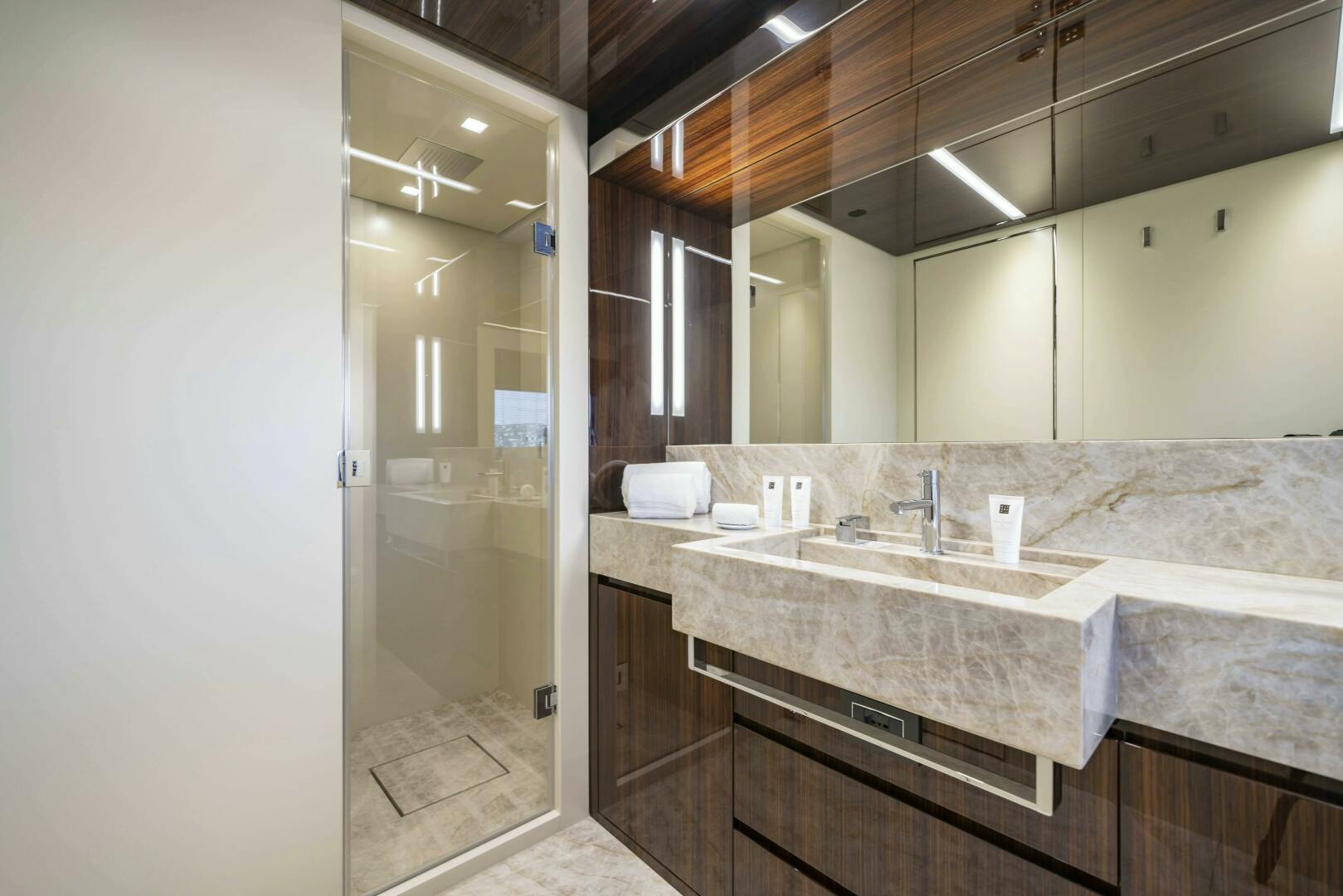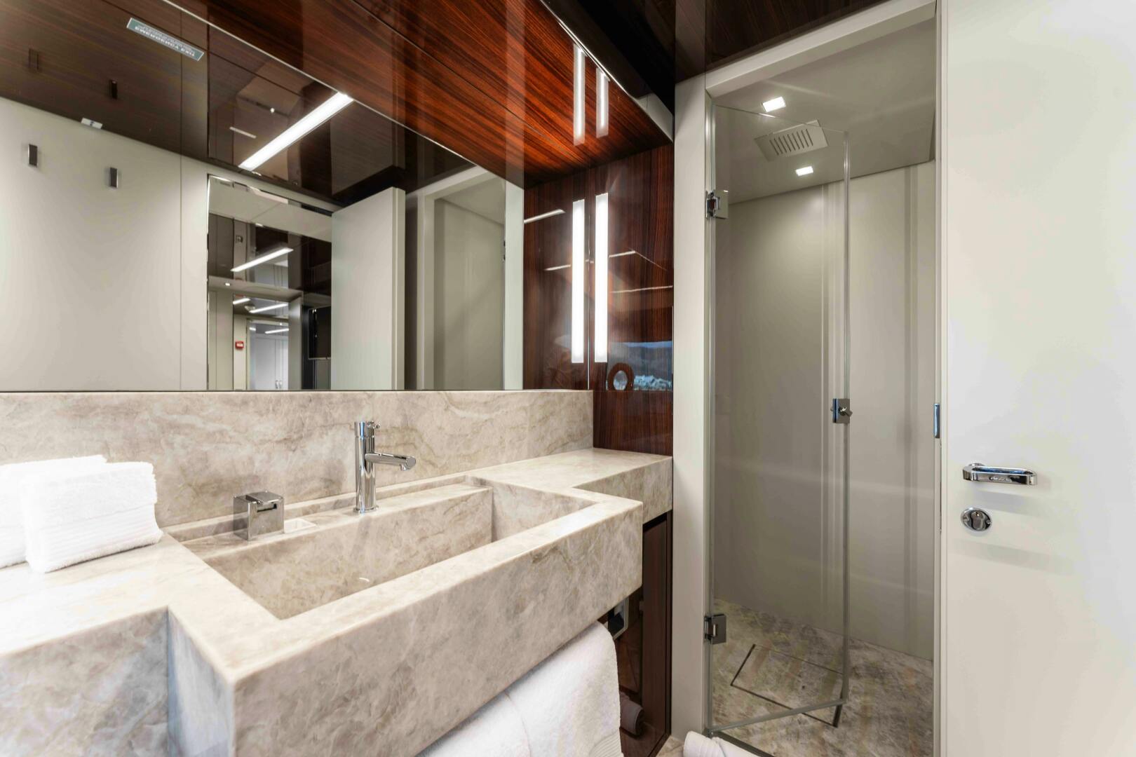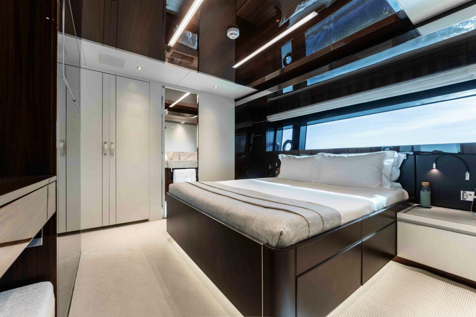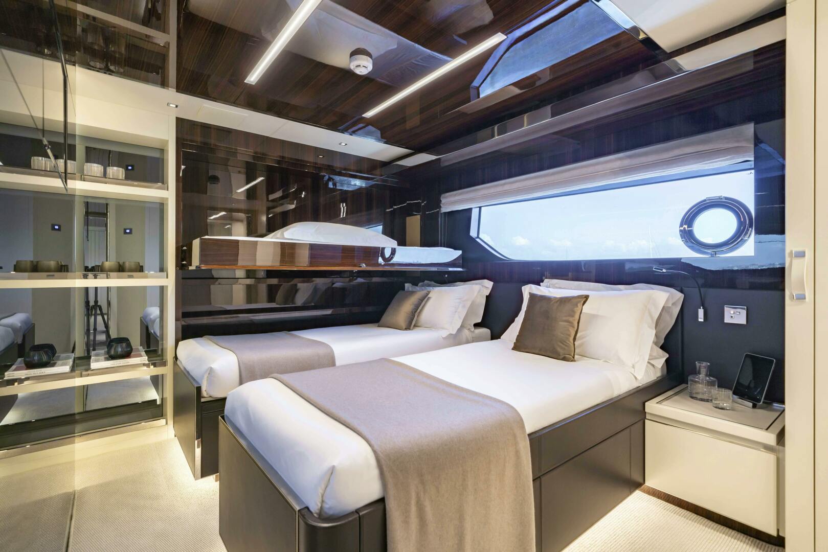 Accommodation is arranged for up to 11 guests across five cabins. The full-beam owner’s suite is located forward on the main deck and finished in striped tropical rosewood veneer, contrasting elegantly with white lacquer surfaces. Large windows, generous headroom, ample storage and a private en-suite create a calm and luxurious owner’s retreat. Four guest cabins are located on the lower deck, all comparable size and accessed from a central lobby. One cabin features sliding berths and an additional Pullman, providing flexibility for families or charter groups. Crew accommodation is arranged for five across three en-suite cabins, accessed discreetly via the galley.