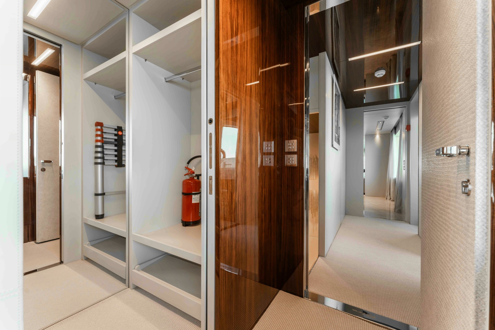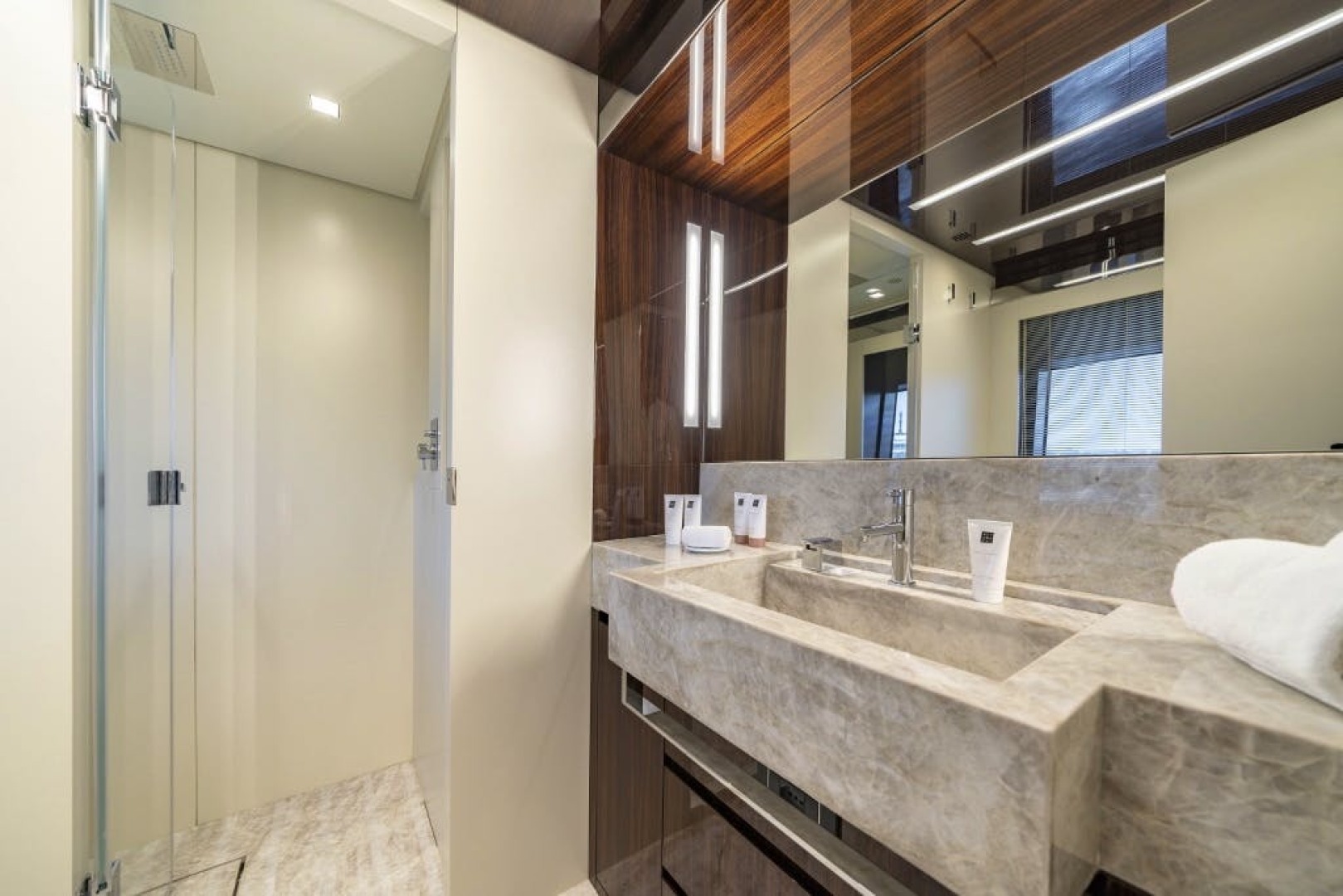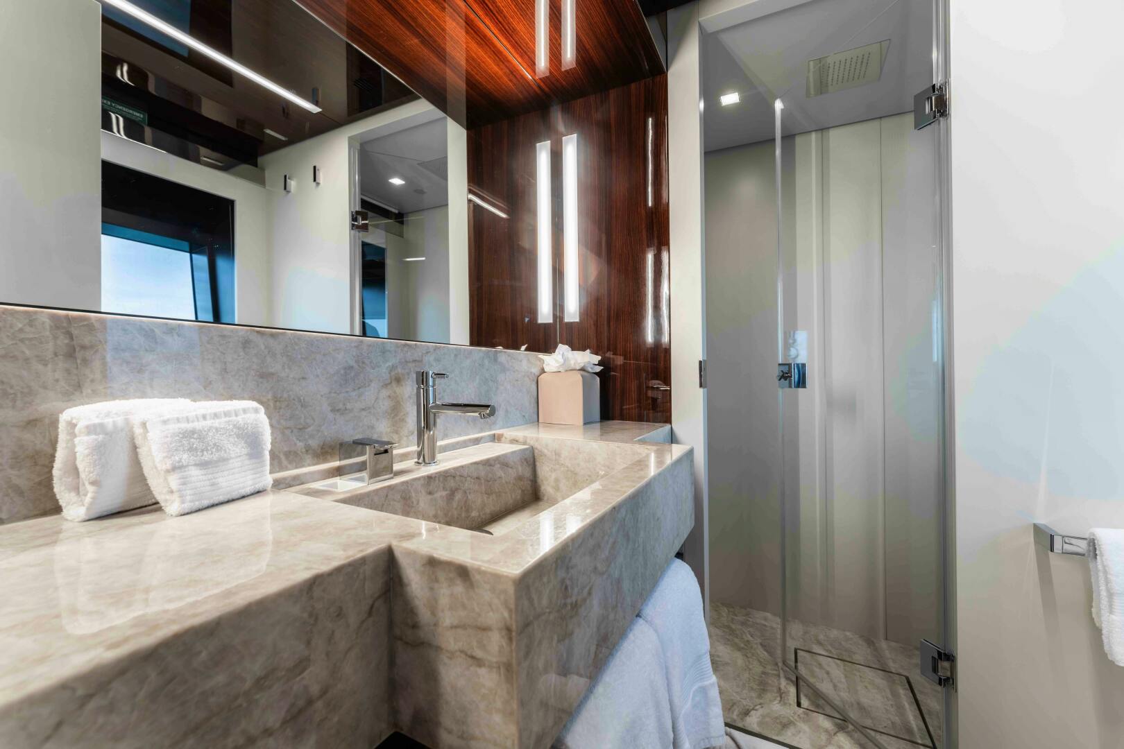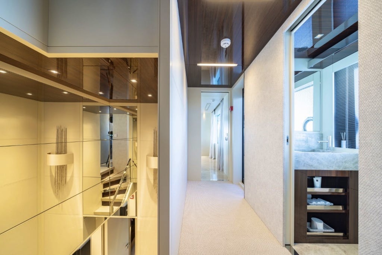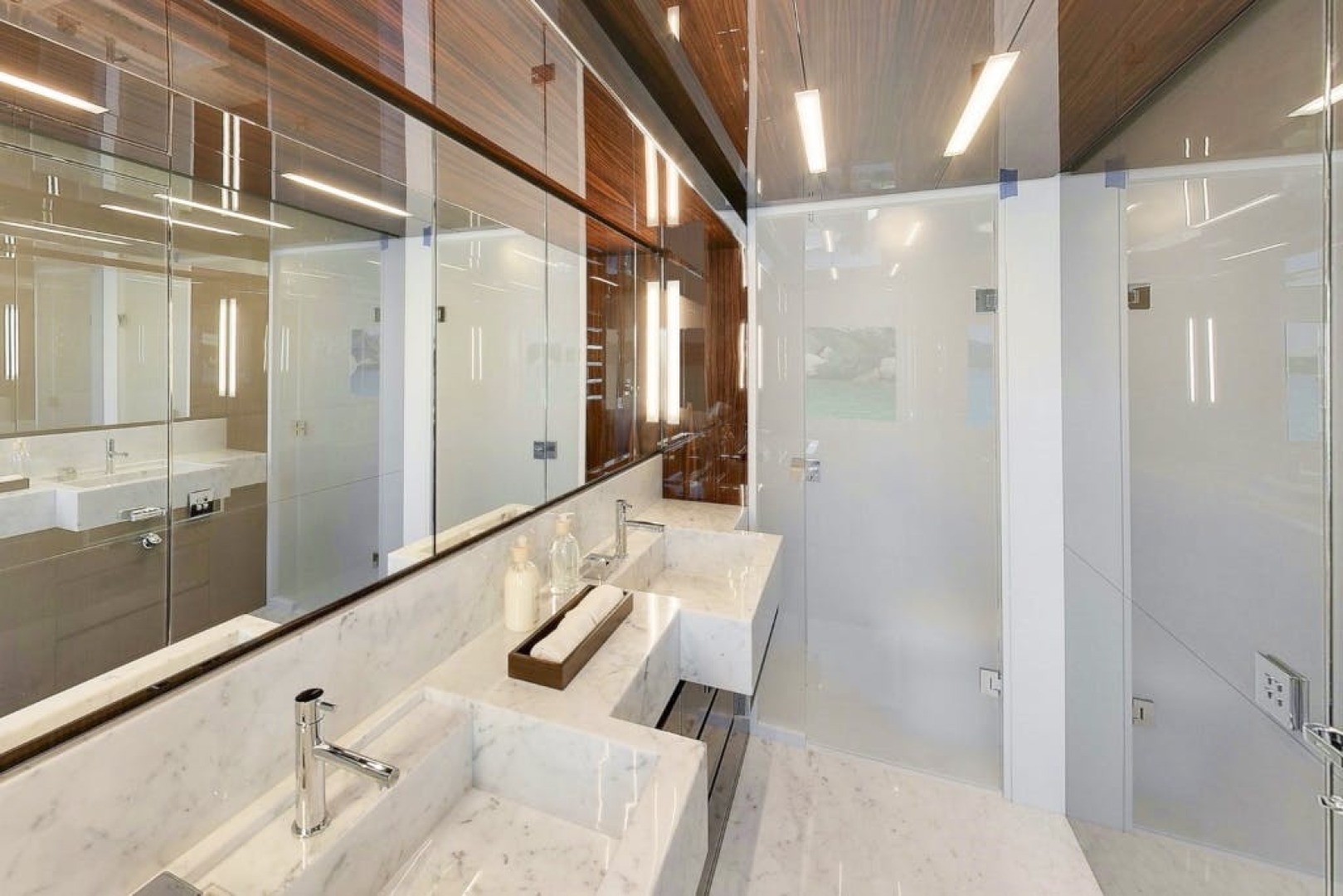 Accommodation is arranged for up to 11 guests across five cabins. The full-beam owner’s suite is located forward on the main deck and finished in striped tropical rosewood veneer, contrasting elegantly with white lacquer surfaces. Large windows, generous headroom, ample storage and a private en-suite create a calm and luxurious owner’s retreat. Four guest cabins are located on the lower deck, all comparable size and accessed from a central lobby. One cabin features sliding berths and an additional Pullman, providing flexibility for families or charter groups. Crew accommodation is arranged for five across three en-suite cabins, accessed discreetly via the galley.