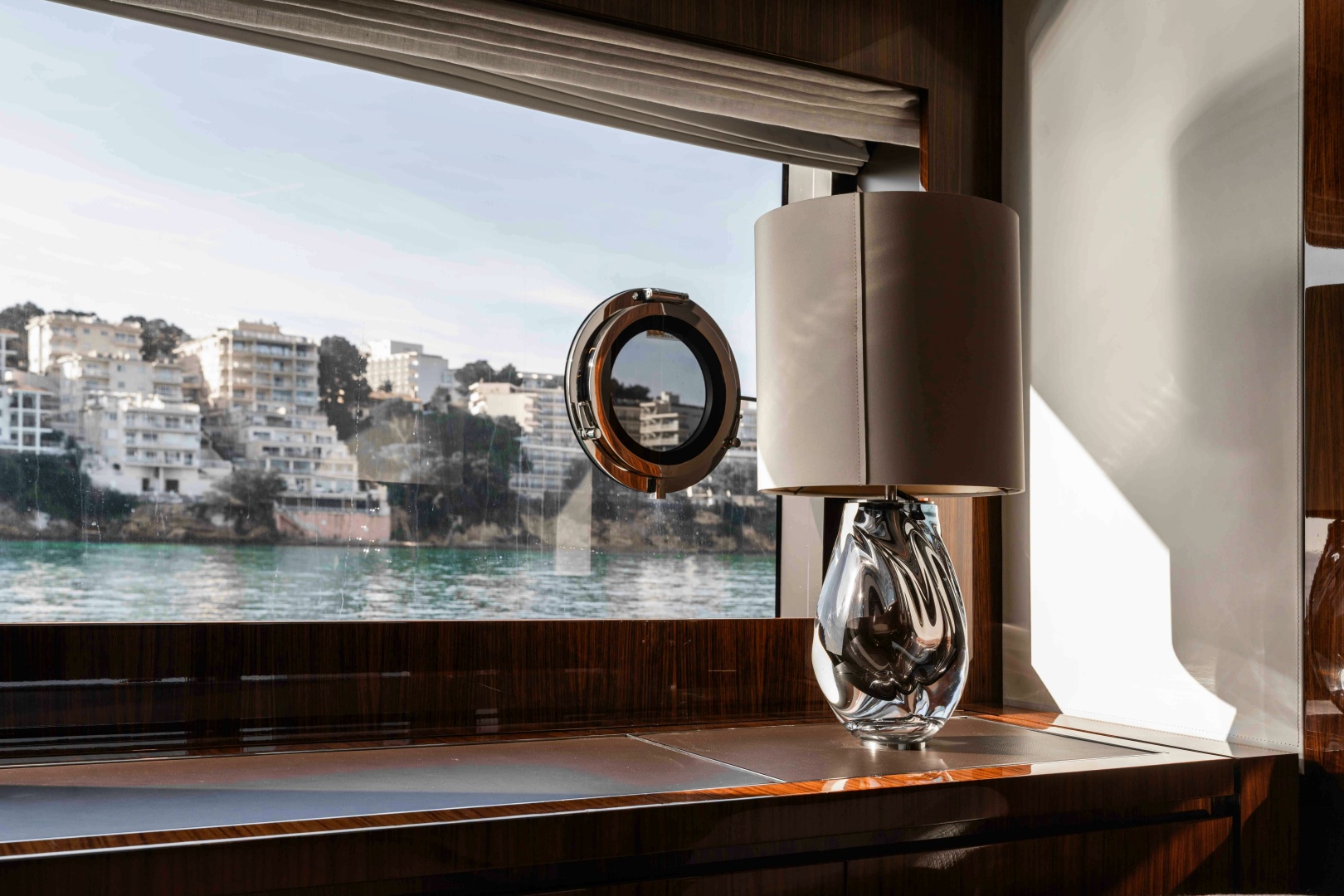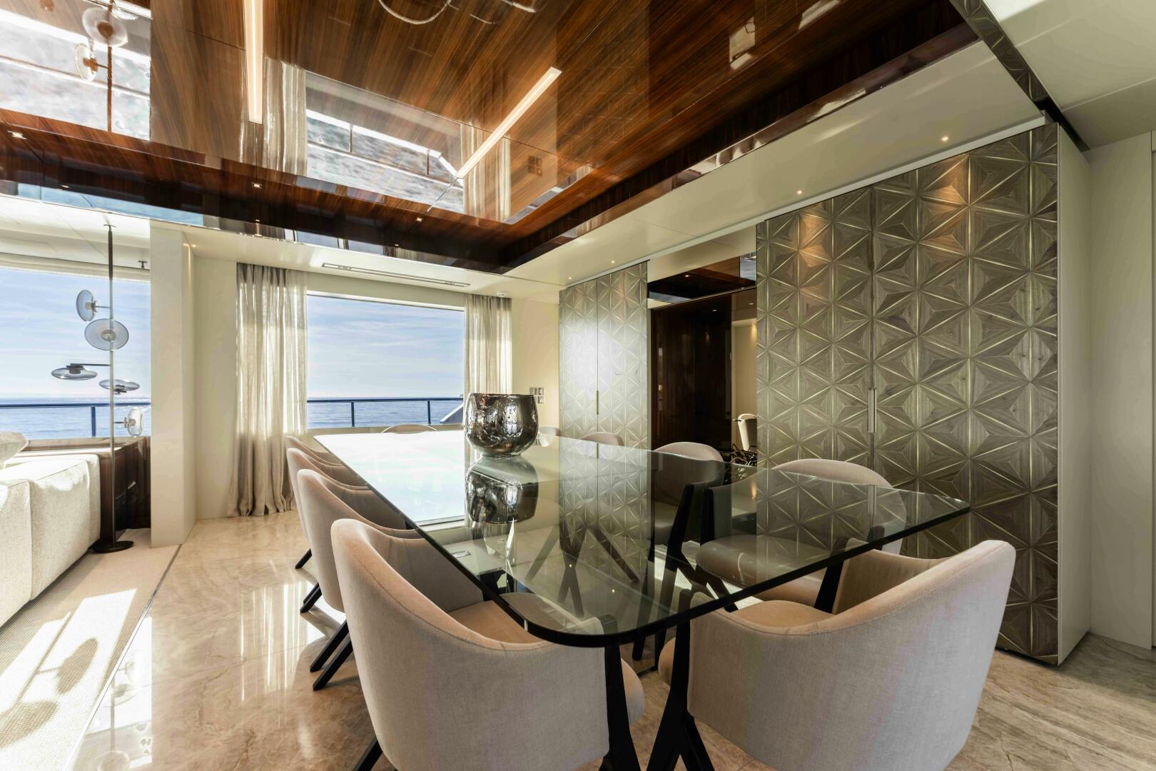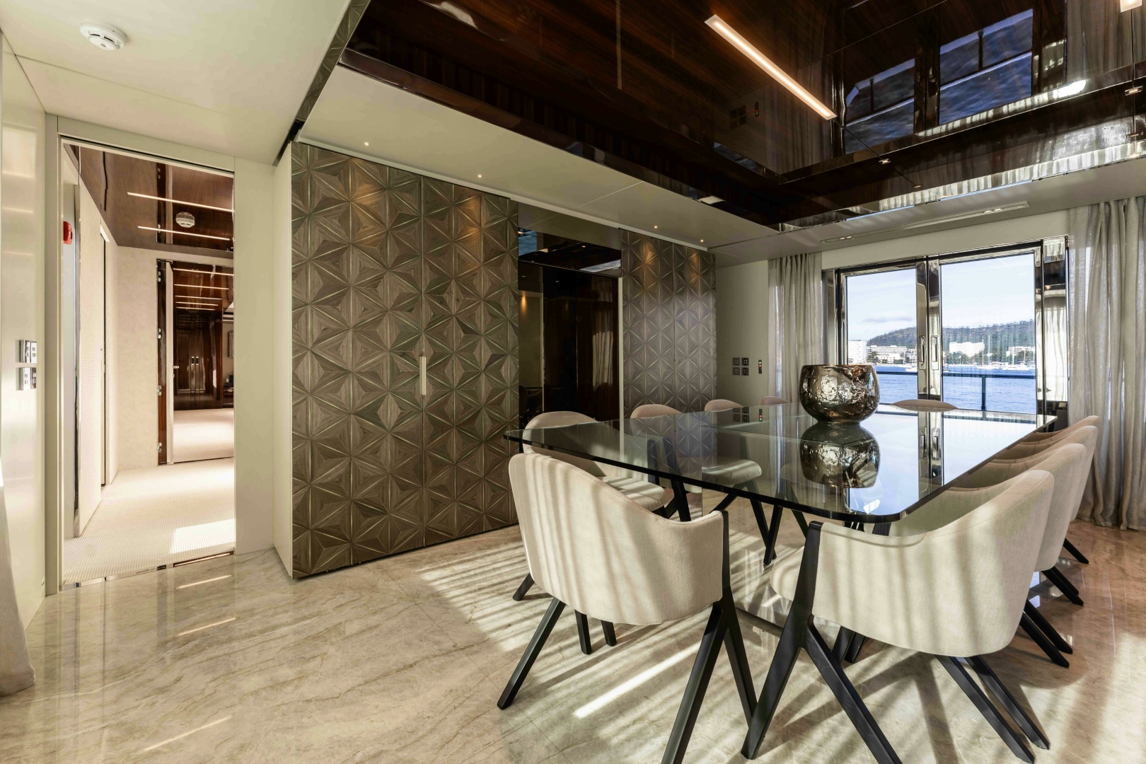 Inside, ELYSIUM I features a highly customised interior specification, going well beyond the standard Dolcevita configuration. Stainless steel inlays, stitched leather panels, monogrammed hardware and substantial marble detailing underline Riva’s meticulous attention to finish and brand identity. High-gloss surfaces and a rigorously rectilinear layout enhance light and volume throughout the main salon, reinforcing the sense of openness created by the yacht’s distinctive glazing.