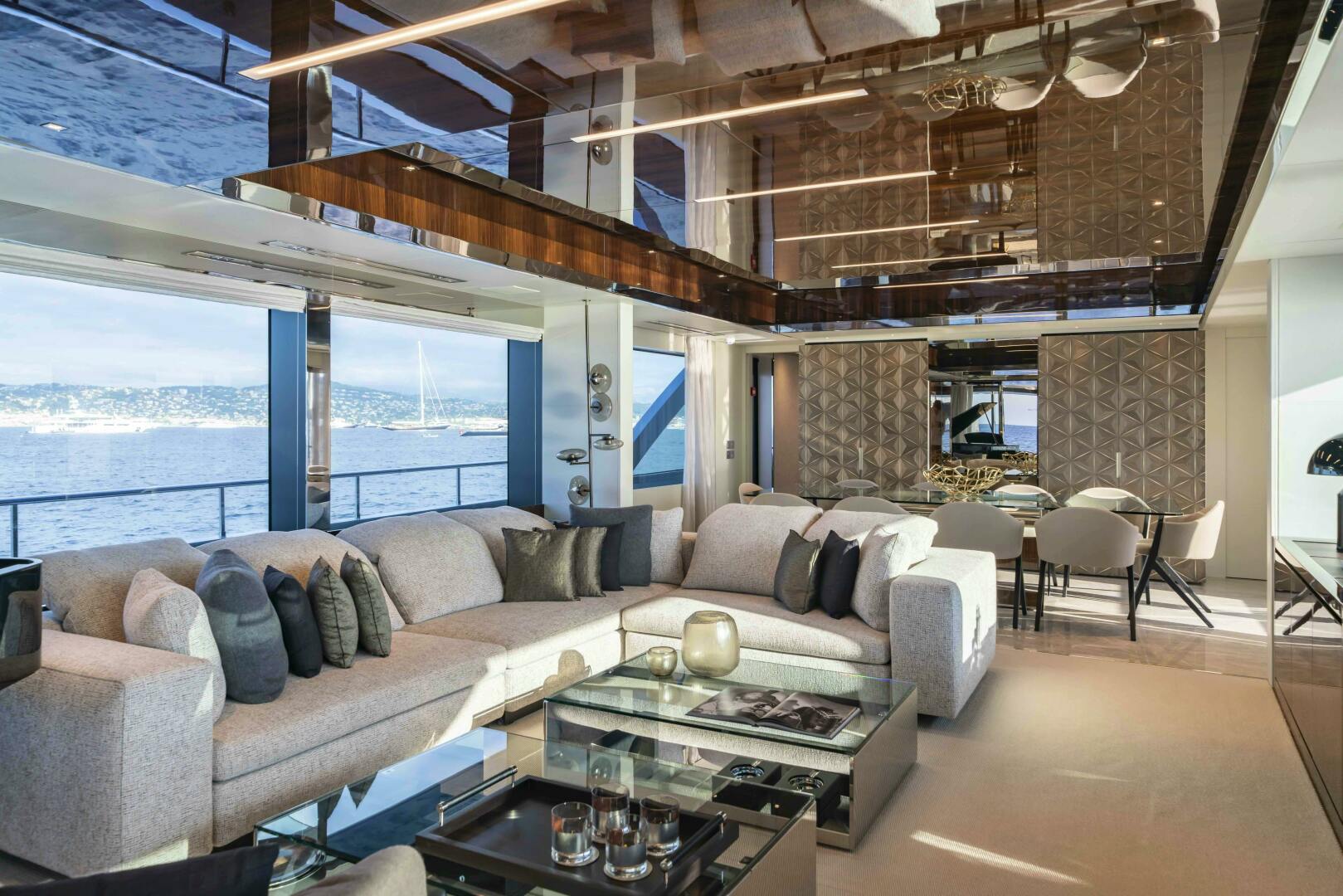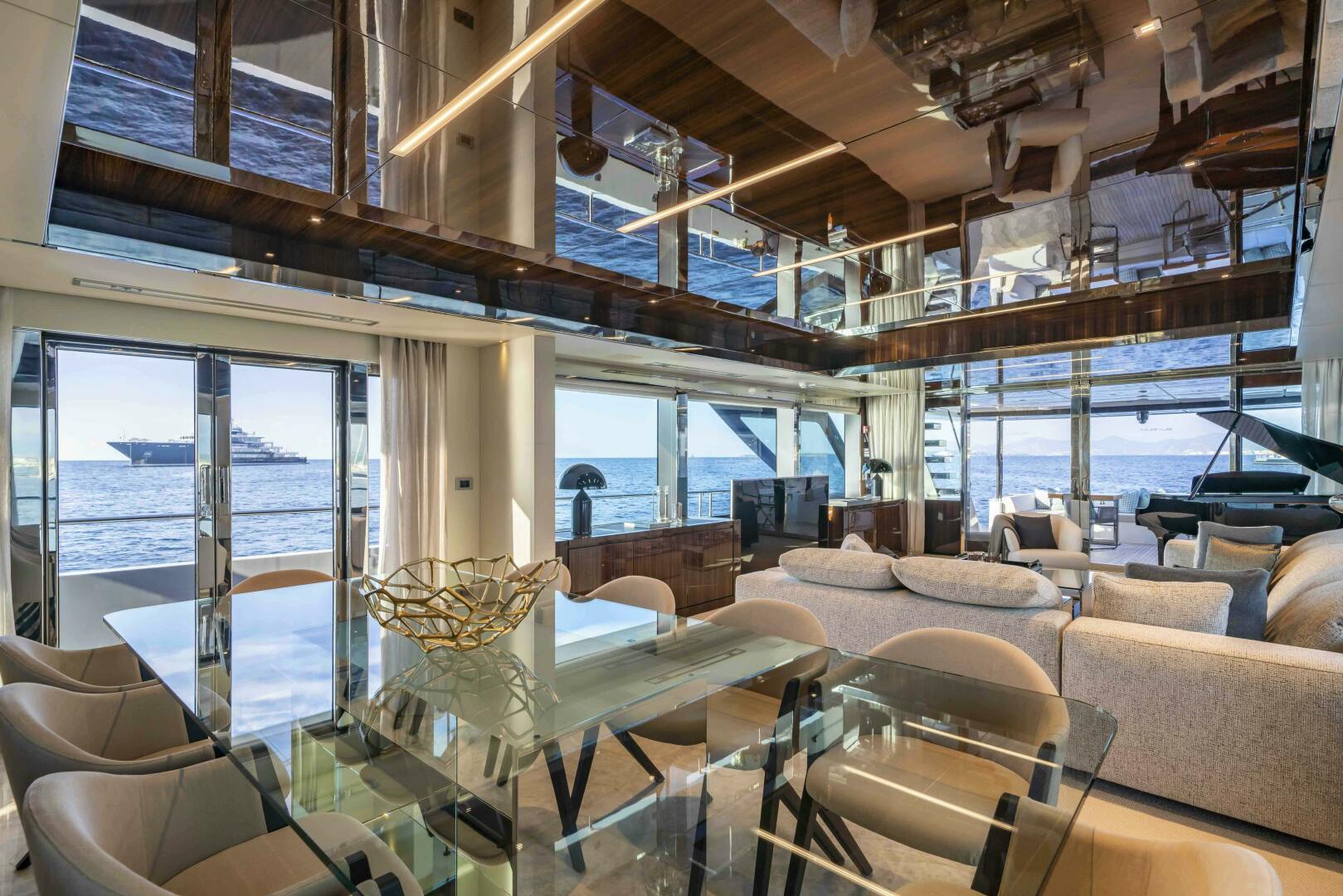 Riva’s reputation for combining speed, luxury and engineering refinement is fully expressed in ELYSIUM I. Beneath the GRP skin of her superstructure sits a stainless-steel structural framework, allowing for exceptionally large main-deck windows with minimal vertical pillars. The result is a main salon flooded with natural light and uninterrupted sea views, more akin to a contemporary waterfront apartment than a traditional flybridge yacht.
