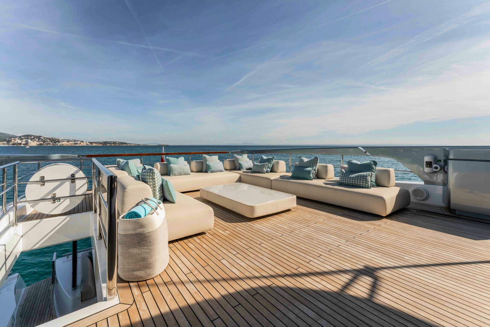 On deck, the main aft deck offers a shaded formal dining area, while the flybridge is divided into multiple social zones, including an informal lounge aft, a central bar and a generous dining table. A large, fixed hardtop provides shade across most of the deck. Forward, the foredeck offers private seating ahead of the bridge and two separate sunbathing areas leading toward the bow. At anchor, the aft garage door converts into a substantial bathing platform, enhancing access to the water.