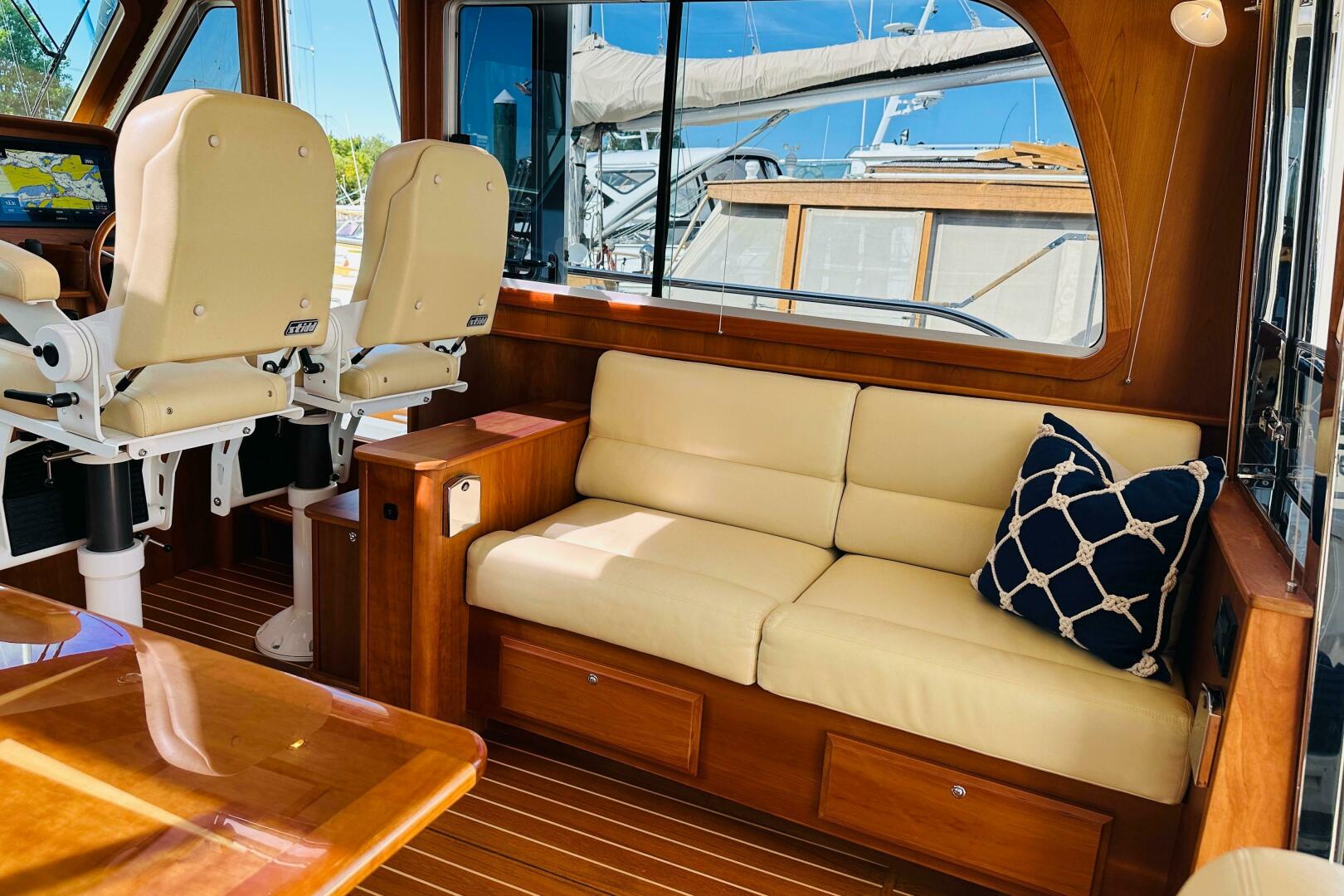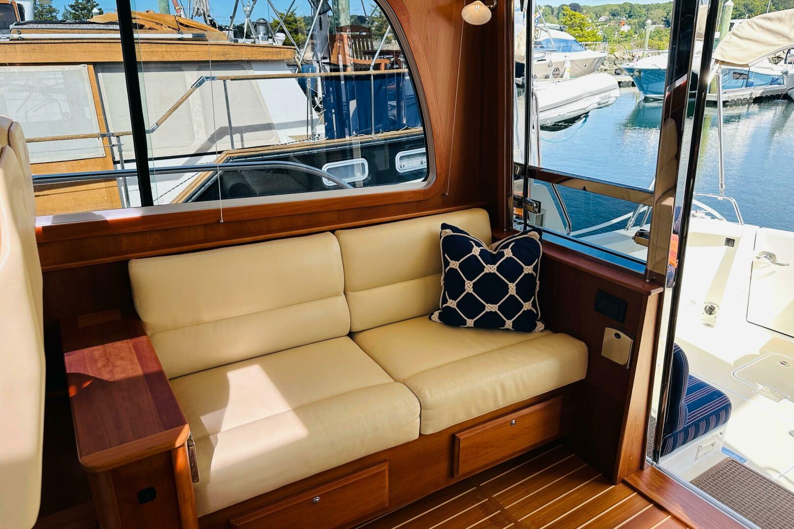 - “L” settee to port, foam cushions, with storage and Sabre tool drawer under