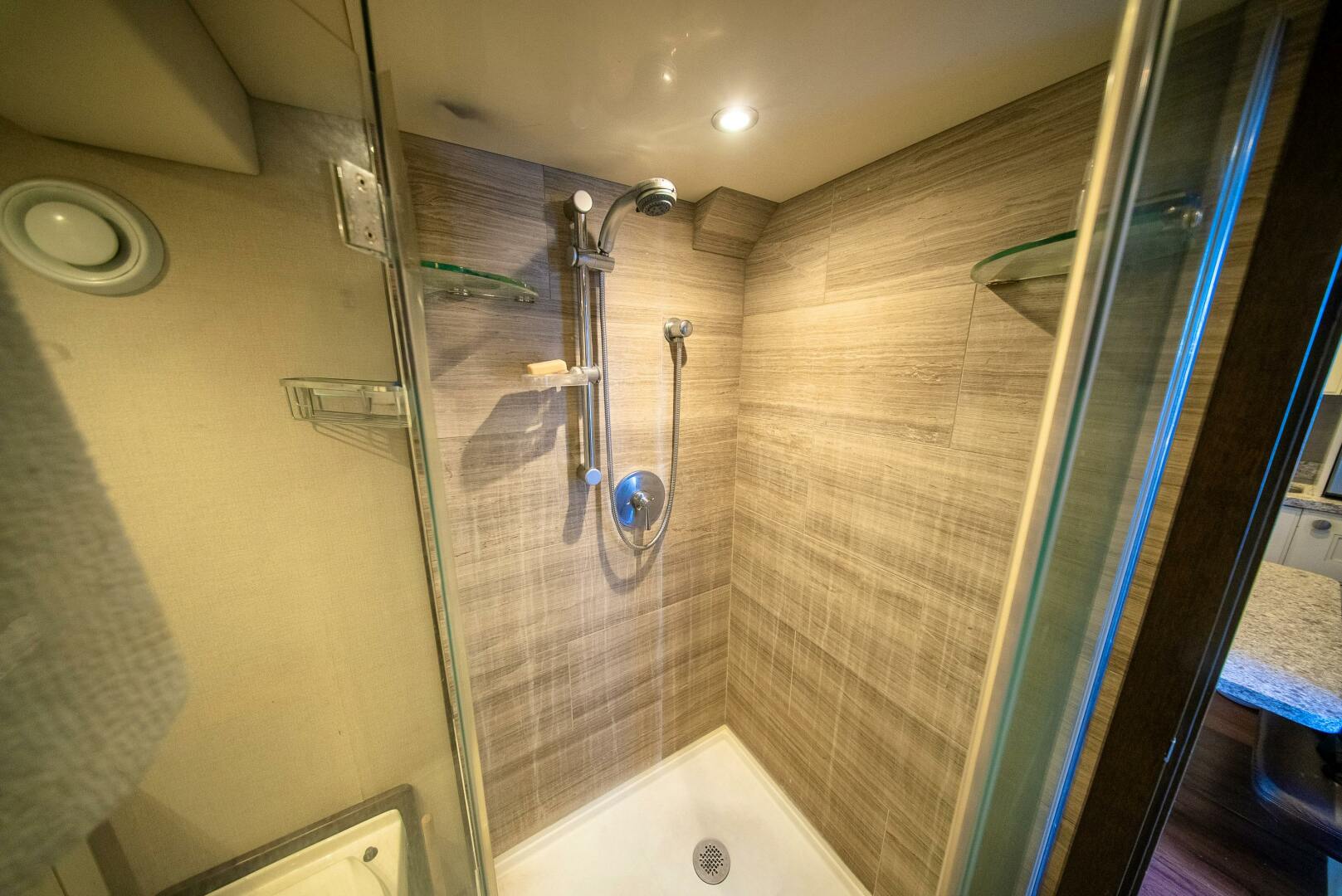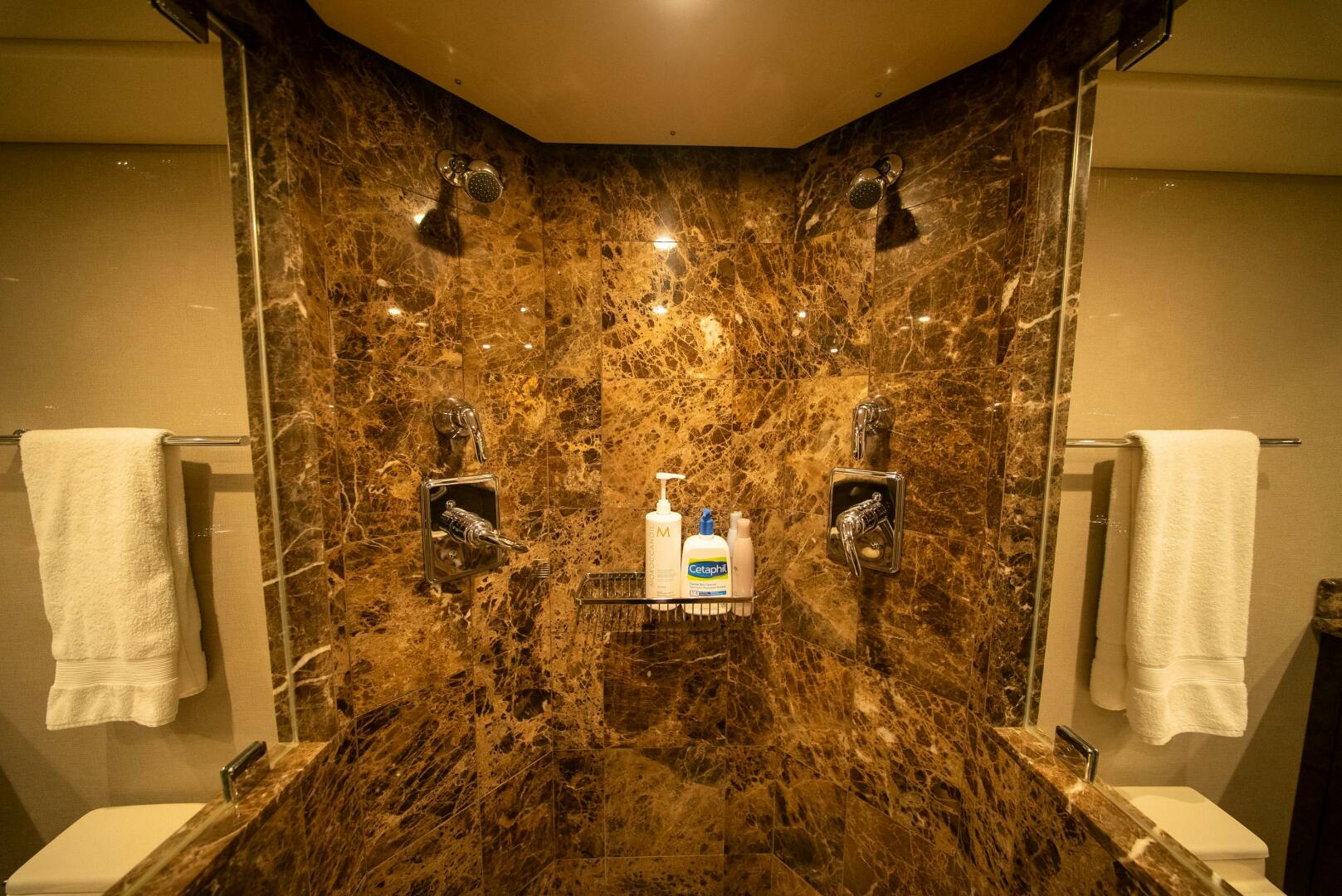 The aft side of the lower foyer allows access to the two remaining guest cabins. The starboard cabin has a queen size memory foam mattress while the port features two large memory foam singles berths that can be joined as a large queen sized berth. Both rooms enjoy spacious ensuite bathrooms incorporating stone counters/floors/walls. Entertainment systems, storage and heated bathroom floors round out the features.