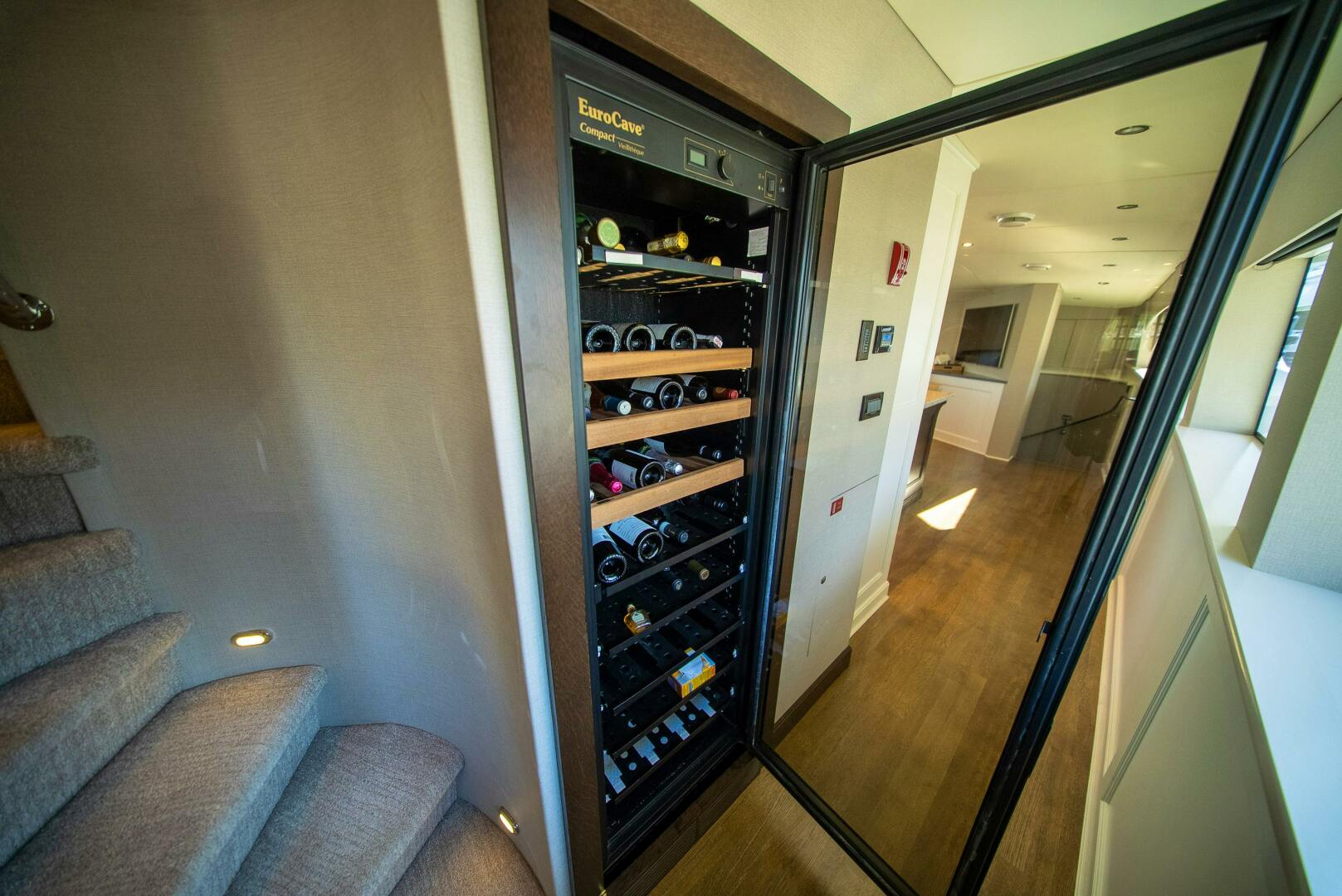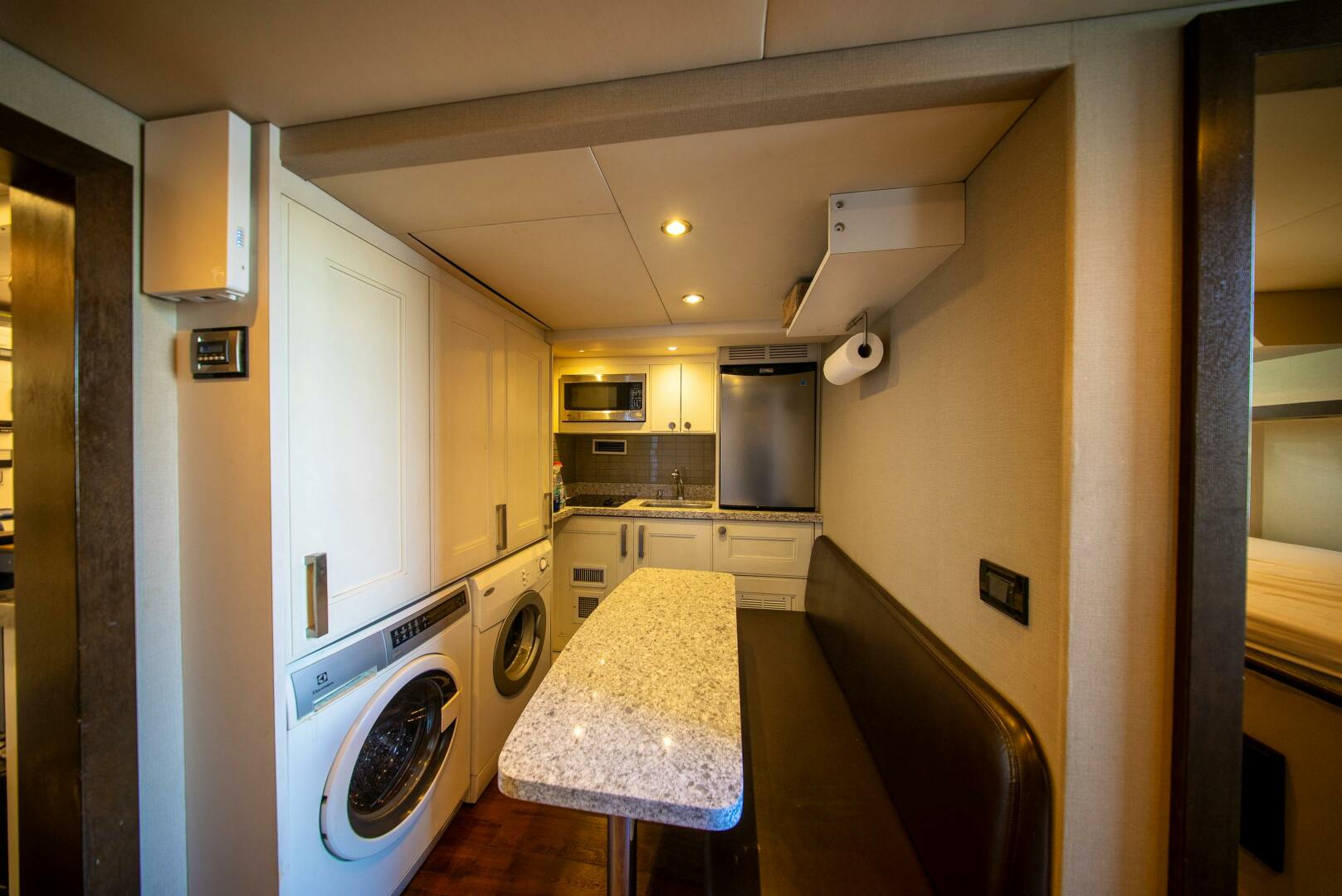 Further forward along the port companionway, you find a stairwell to the lower foyer which a beautiful entry area that separates the master from the guest staterooms and provides access to the guest laundry. A large separate room on the starboard side holds the Miele guest washer and dryer, additional storage, and a functional work vanity for the cleaning duties.