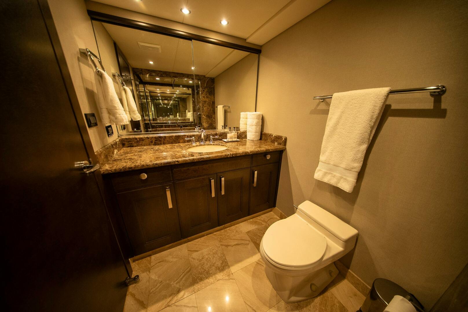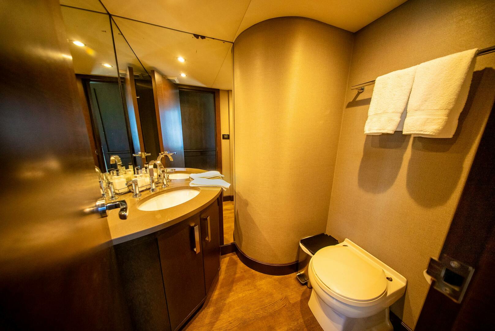 Forward of the foyer, the master stateroom is in the quietest, calmest part of the yacht: low and centered amidships. Inside you find a king sized bed, his and her closets, copious drawer storage, and a comfortable settee. The his-and-hers bathroom arrangement is beautifully appointed with marble counters and accents as well as modern fixtures. Again a full entertainment system compliments the amenities.