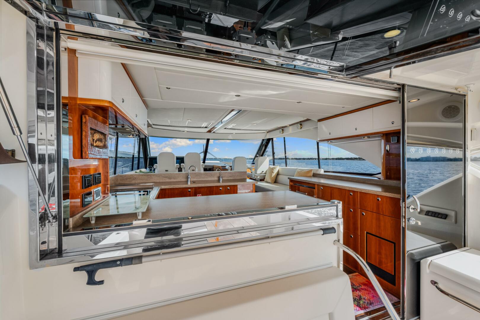 • The large cockpit features STD side sink with lid, insulated cool box or optional freezer cool box are all easy to access at waist level.