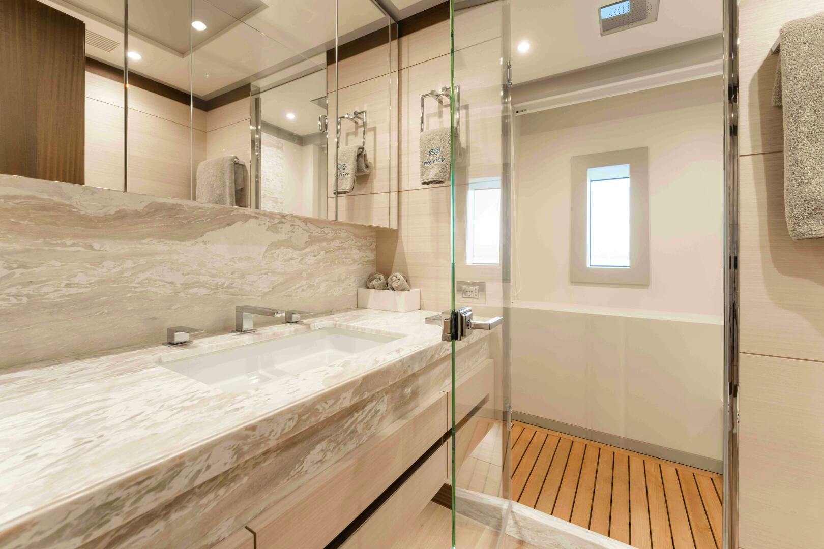 Exinity welcomes up to 11 guests in five staterooms. The main-deck master suite is spacious and full of light with floor-to-ceiling windows, a walk-in closet, and a his-and-hers en-suite bathroom with a shower. The yacht has four additional staterooms, two with queen-size beds and two with two twin-size beds. The port twin cabin has a pullman berth; all guest cabins feature en-suite bathrooms. Three crew cabins and one captain’s cabin behind the bridge, can accommodate 7 crew members onboard.