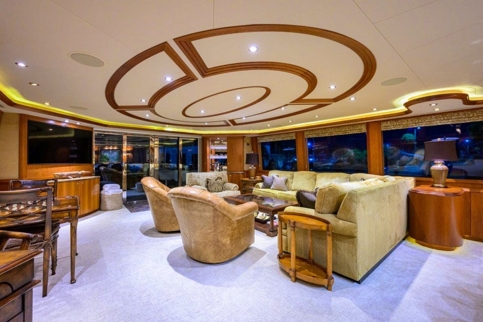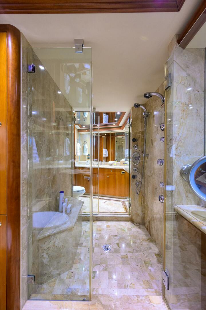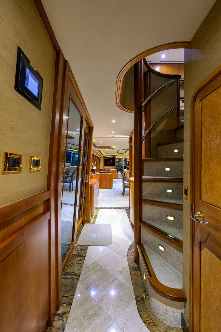 In 2023, EXODUS completed a yard period at Roscioli Yachting Center, during which the bottom and running gear were serviced, stabilizers were dropped for maintenance, and chillers were rebuilt, among other upgrades. She has received ongoing maintenance throughout 2024, placing her in optimal condition. Her guest accommodations reflect very light use while her interior design showcases classic Satin Cherry woodwork complemented by marble countertops and flooring. Much of the furniture is not fixed, allowing for modifications to suit the new owner's personal taste. With light use and exceptional maintenance, EXODUS represents great value in a quality and versatile motor yacht.