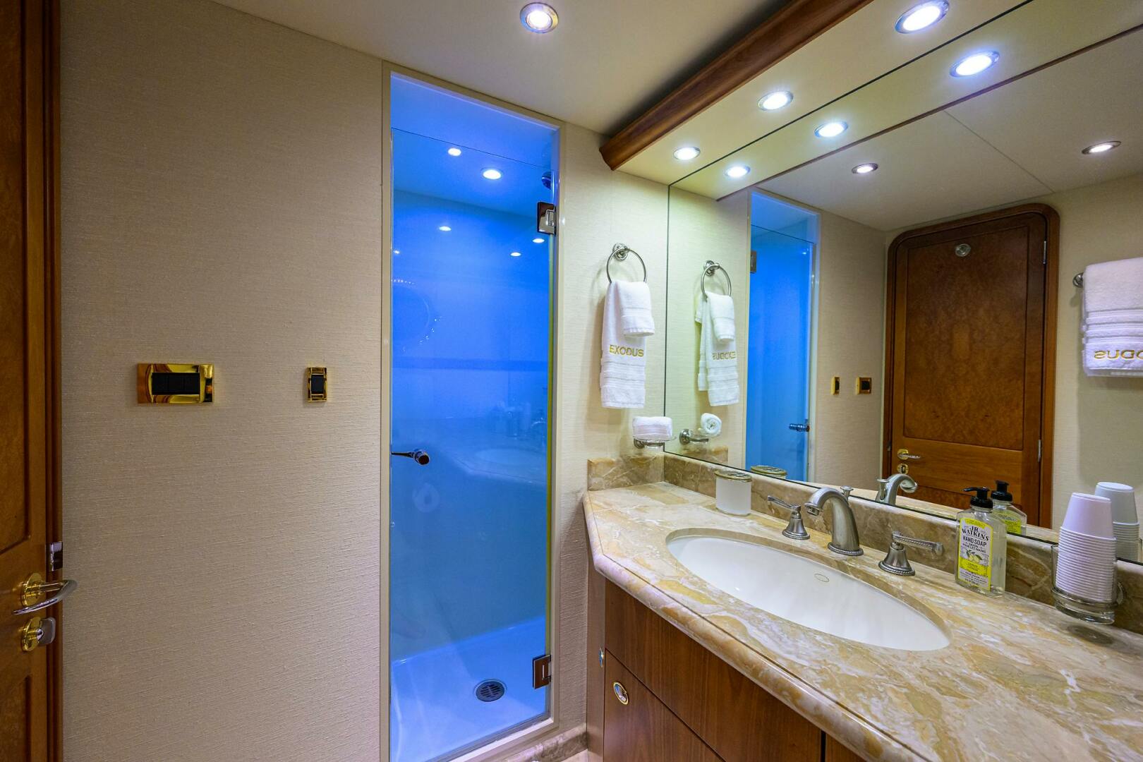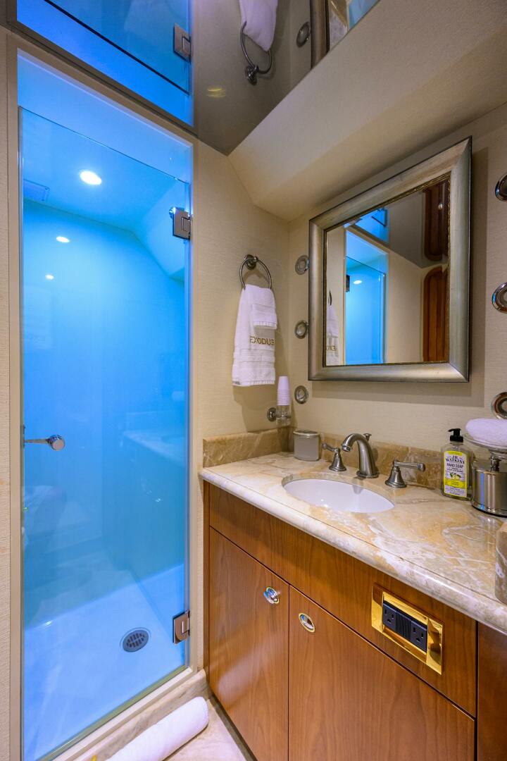 EXODUS can comfortably accommodate up to eight guests in four staterooms, with the master suite featuring a California King berth, upholstered headboard, a 15-drawer dresser, a walk-in wardrobe, opening port lights with screens and privacy covers and a TV with surround sound. The VIP cabin offers a queen berth, a walk-in cedar-lined wardrobe, a custom upholstered settee and a flat-screen TV. The portside guest stateroom features a queen berth, a cedar-lined wardrobe, opening port lights, an entertainment center with cherry doors and a flat-screen TV. The starboard side guest stateroom mirrors these amenities, and each cabin is complemented by an en-suite bathroom.