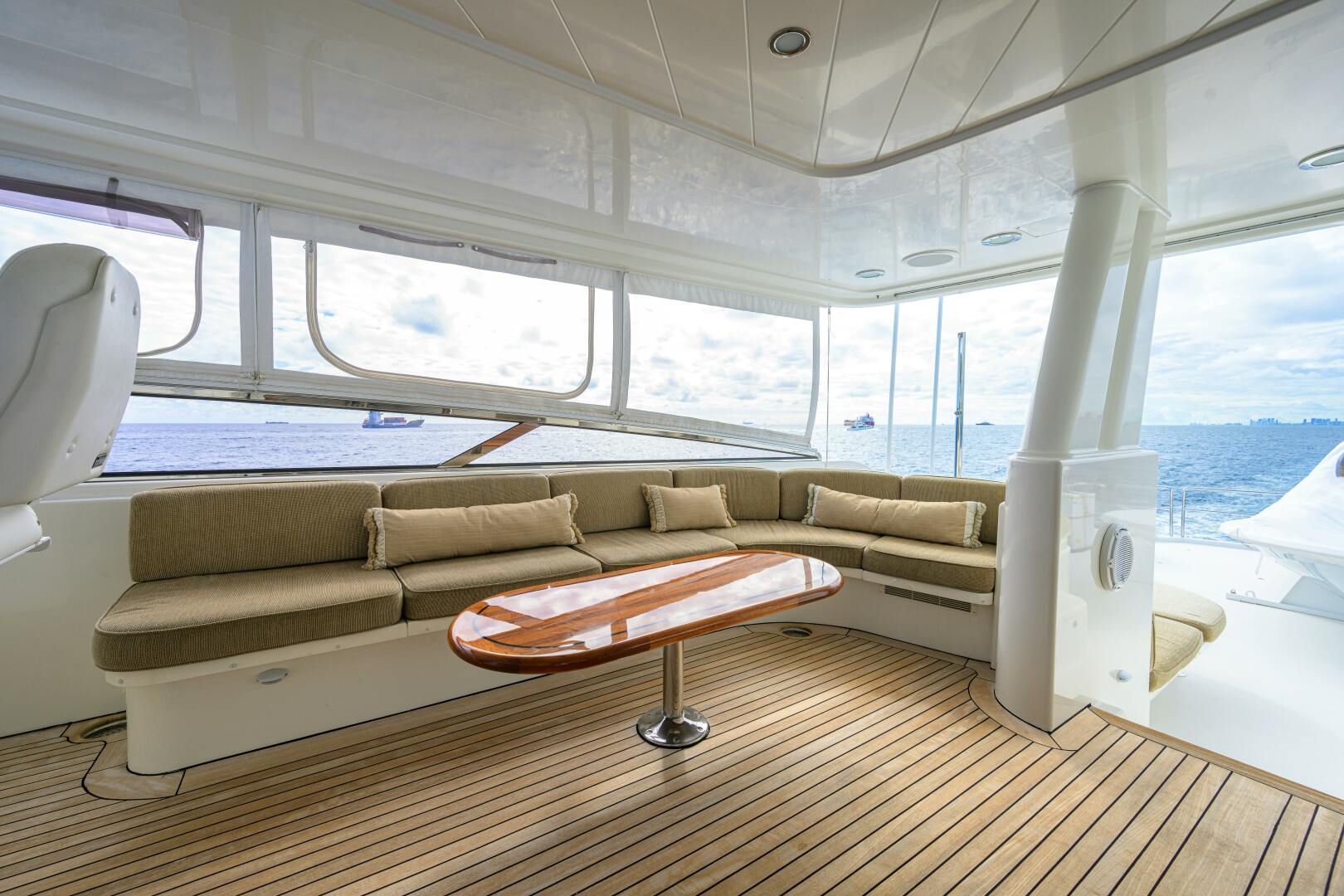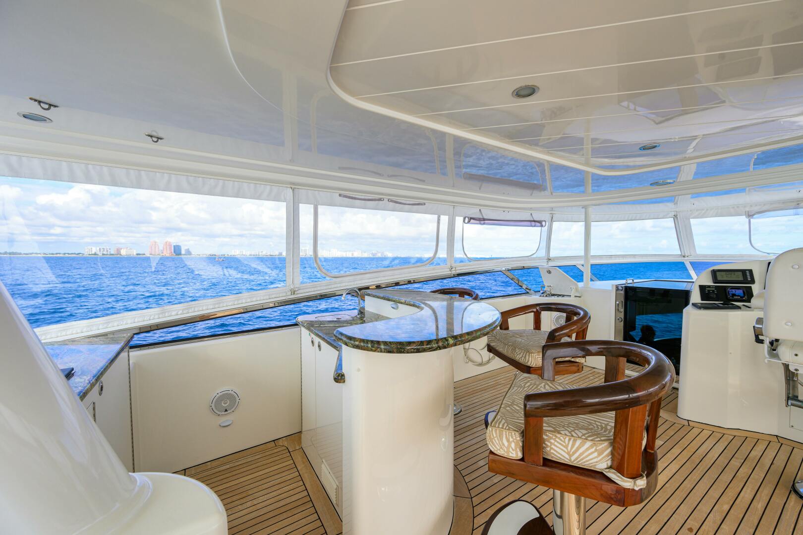 - Wood finished forward bulkhead, flanked by wood detail port and starboard