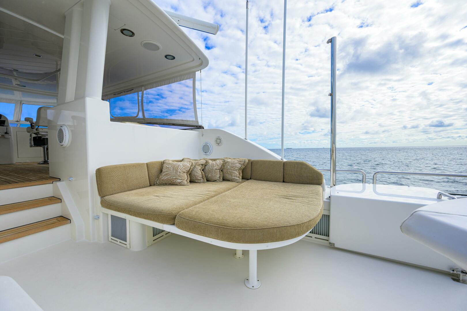 The exterior styling of EXODUS is sleek and timeless. The flybridge features a wet bar with a solid surface white sink and granite countertop, icemaker, refrigerators, and three bar stools. There is a hydraulic-powered Nautical Structures crane with a 2,000 lb. load capacity and removable chocks for a tender. Additional amenities include Stidd Low Back Helm chairs, a Kahlenberg air horn, a hot tub with a sunpad top and storage below, a molded settee with cushions and hinged seating for storage, and teak decking under the hardtop area. The flybridge also boasts a teak table at the settee, stainless steel table base, JL Audio speakers, and port and starboard wing stations with full controls. EXODUS’ exterior spaces are primed for entertainment and relaxation.