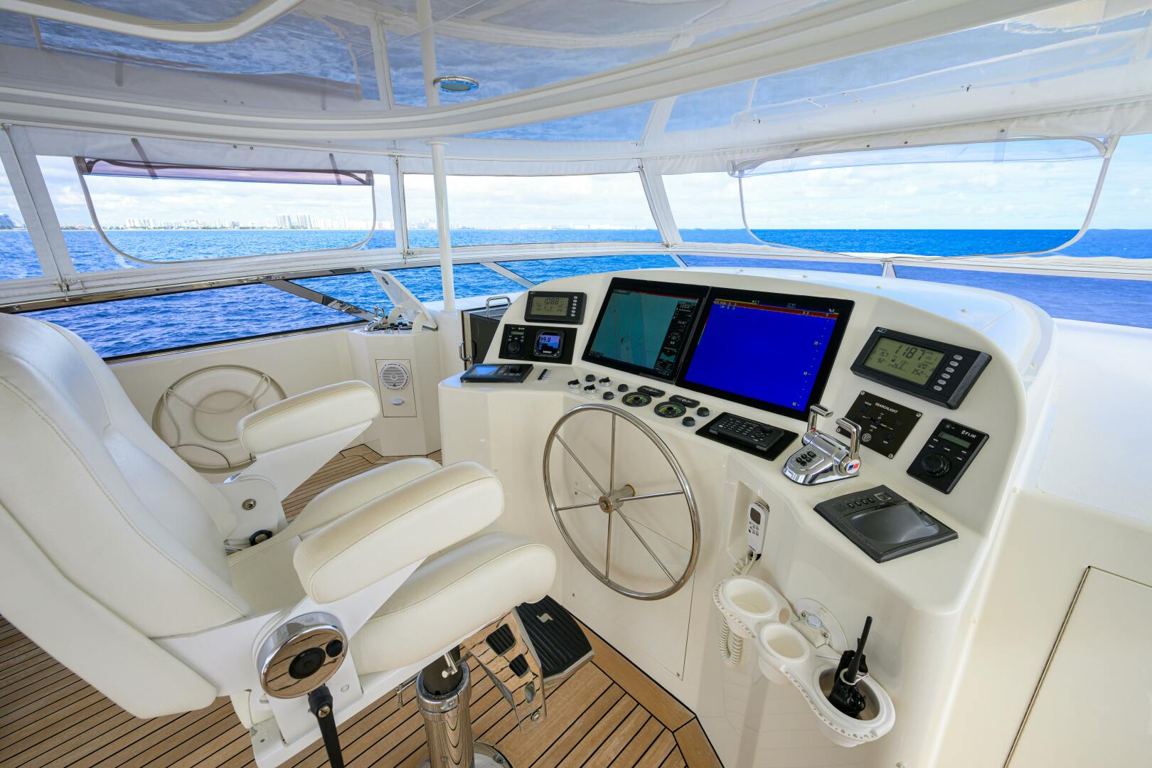 - Steering: Jastram power steering with dual engine driven pumps and four steering stations (Pilothouse, Flybridge, and Port &starboard Wing Stations on Flybridge) Stations include indicator, start/stop buttons and covers