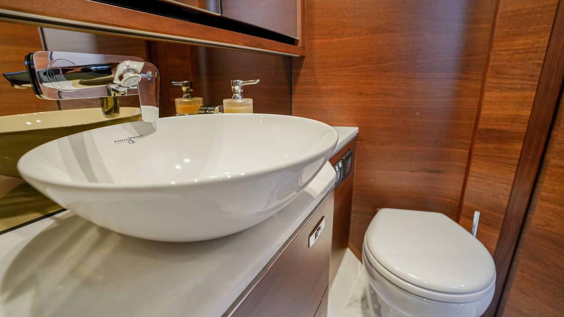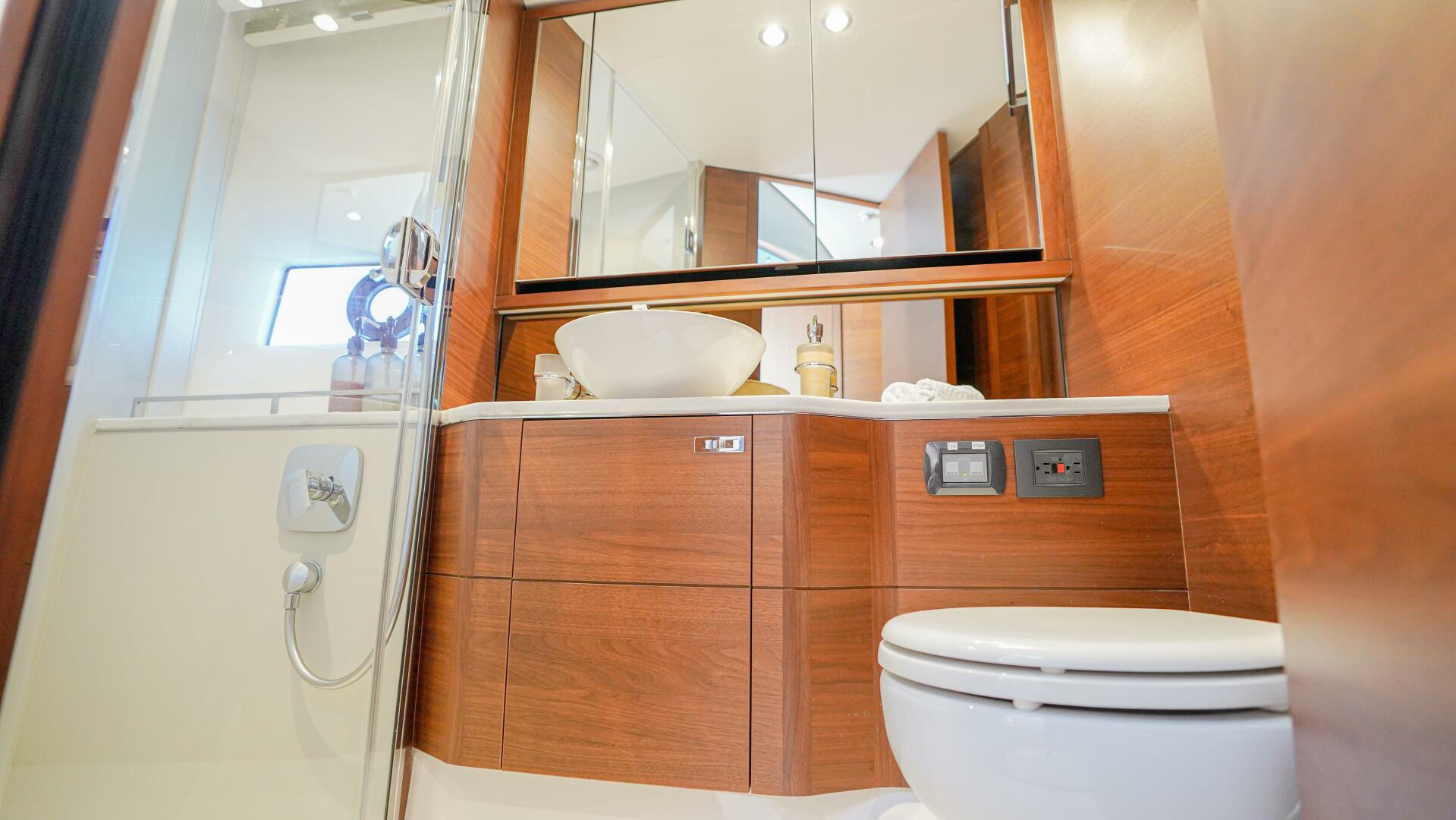 The experience continues down the companionway to the lower deck, where natural light pours through oversized hull windows that illuminate the beautifully designed staterooms. The full-beam master suite is a true sanctuary, offering a plush berth, spacious wardrobe, seating area, and a private ensuite bath. Forward, the VIP cabin provides luxurious accommodations for guests, while an additional twin cabin completes the versatile three-stateroom layout.