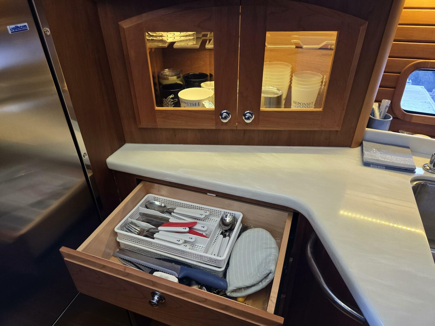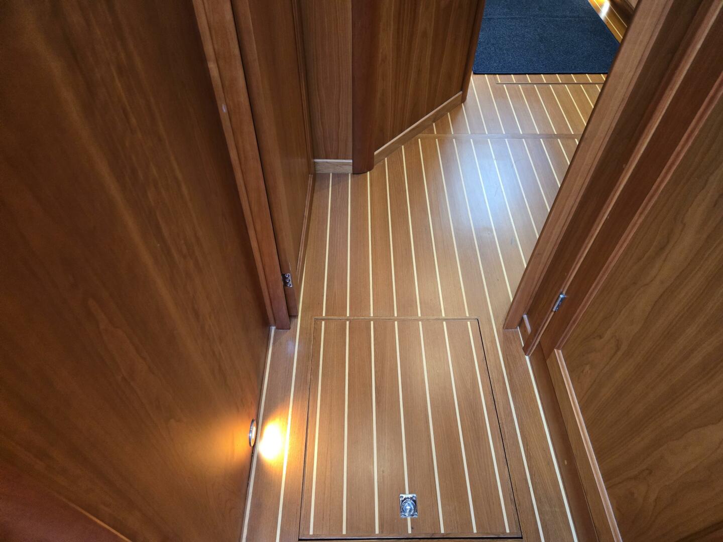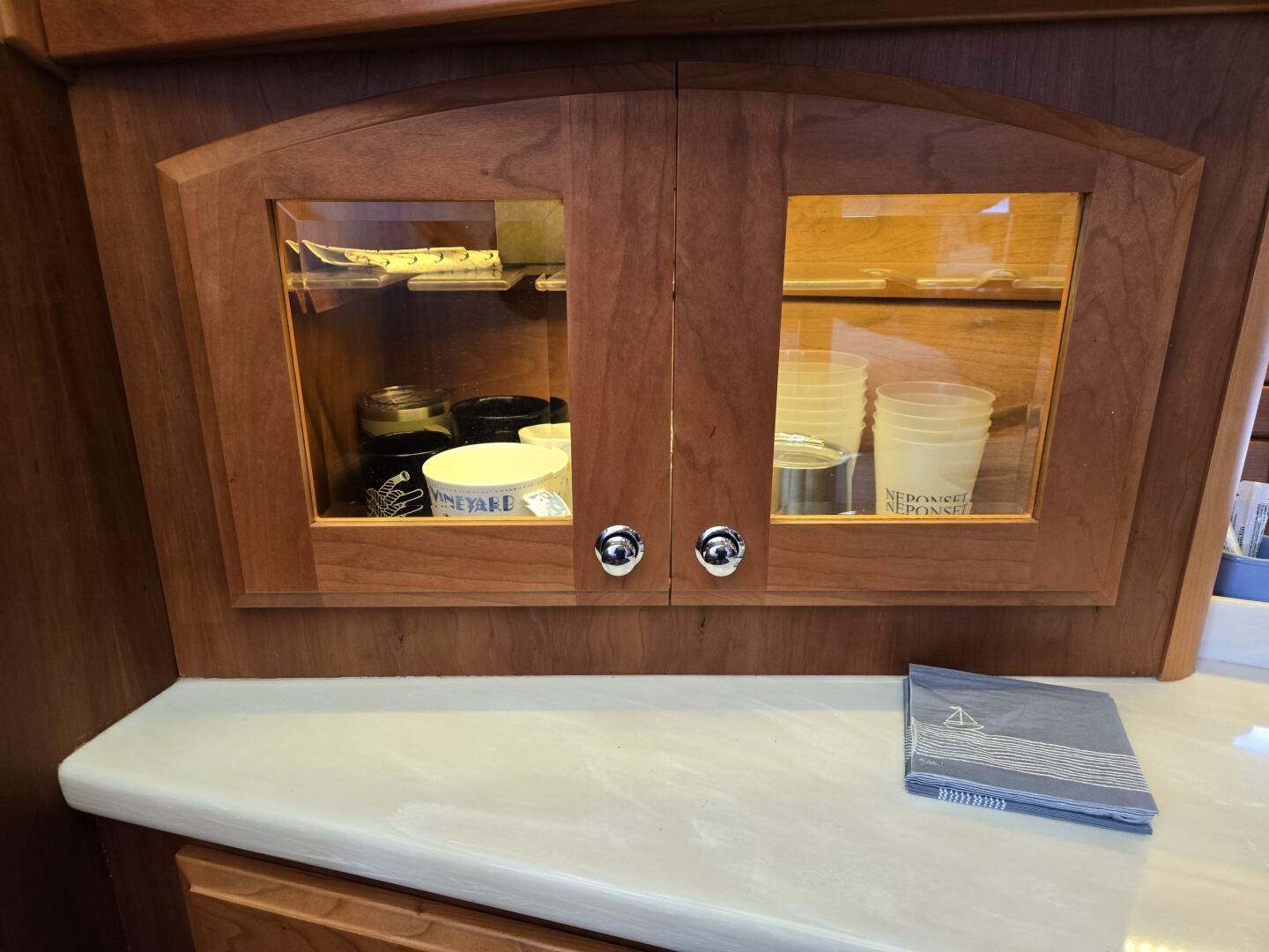 Grayson has a warm and inviting varnished cherry interior with Ultraleather cushions and cream colored pull-down blinds. Walk in through the custom sliding door from the cockpit and you are struck by how pretty the MAIN SALON is. There is an L-shaped settee to starboard and a custom straight settee to port. Both settees have a beautiful high gloss varnish end table at the aft end. A 32" flat screen TV is hidden under an electric lift hatch which is located just outboard of the settee. There is a custom gloss finished cocktail/dining table controlled by an electric pedestal to adjust height. The sole is varnished teak and holly. Forward of the port settee is a custom navigation station with room for chart and and laptop.