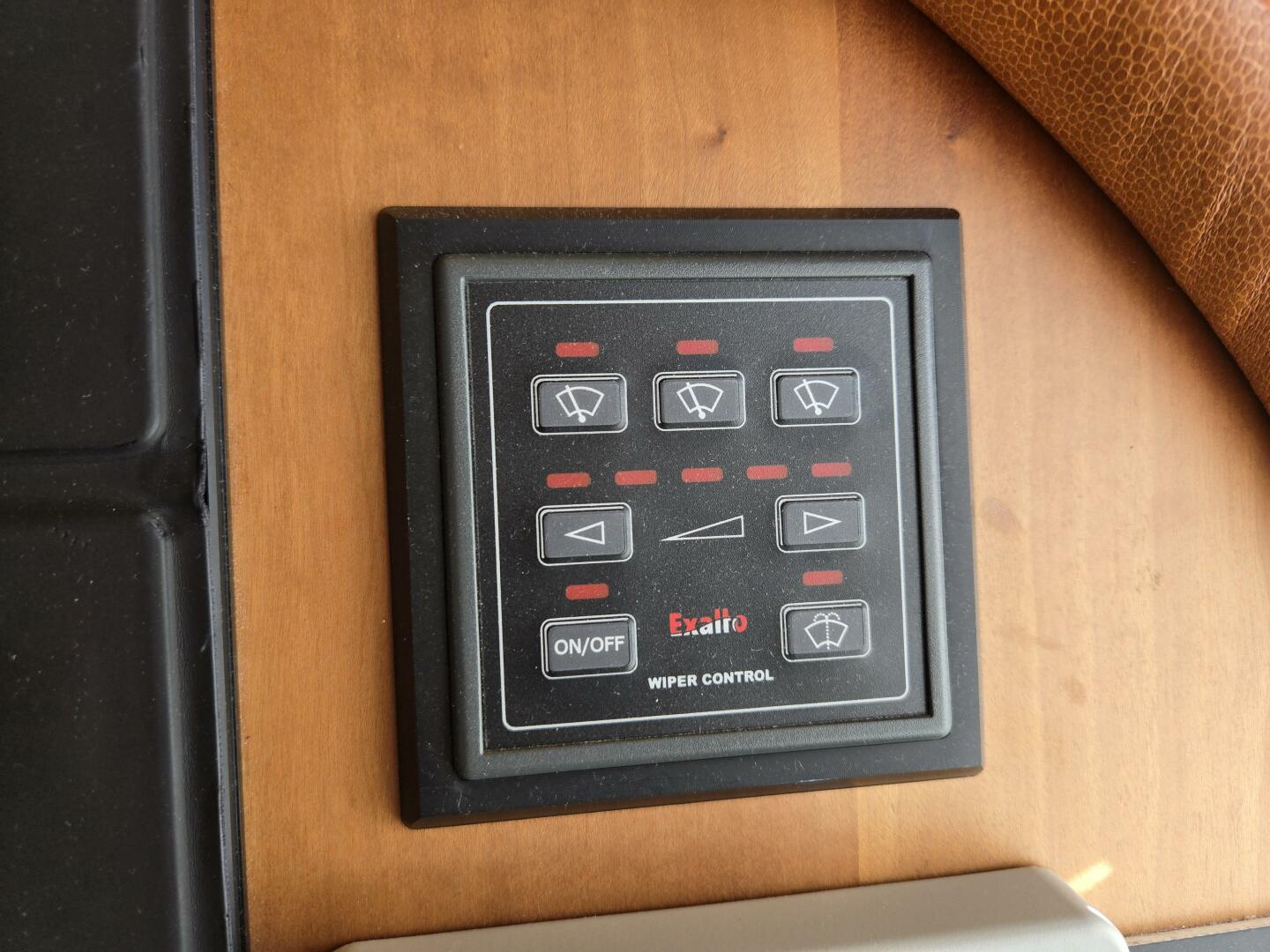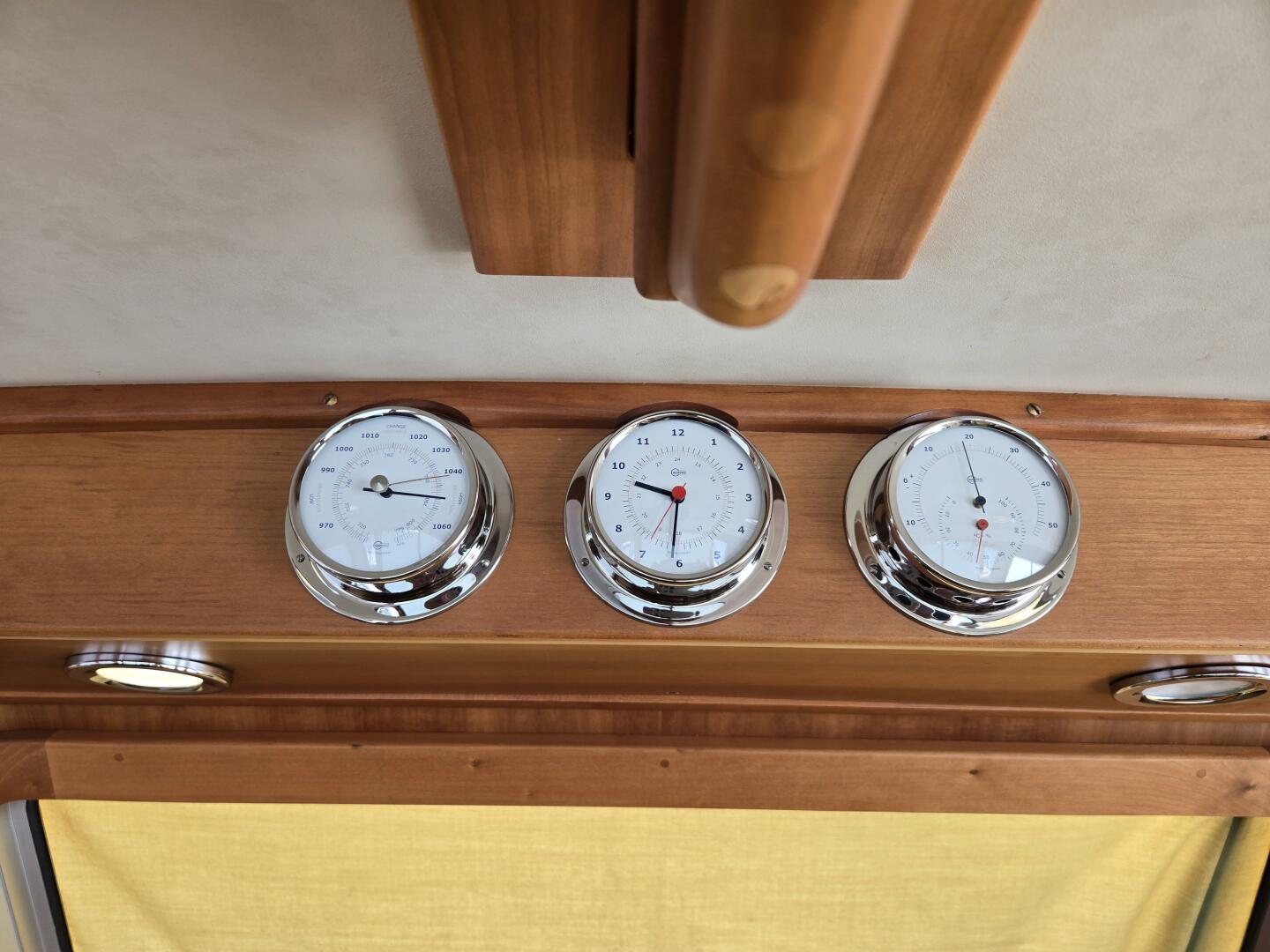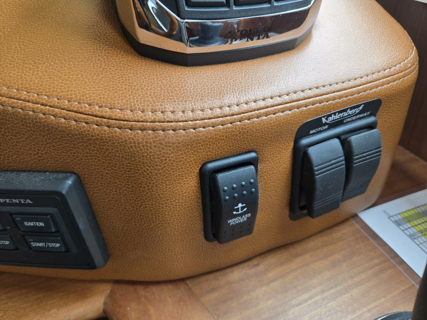 Two Stidd Ultraleather helm seats provide driver and companion excellent comfort and visibility when under way. These are mounted on a cherry cabinet which holds an ice maker fed by filtered water.. There is a sliding side door from the helm for access to the starboard side deck. The helm console has all the controls and electronics mounted (more to follow) and is very well laid out for control and clear navigating. A Stazo tilt wheel is stainless steel with varnished cherry rim.
