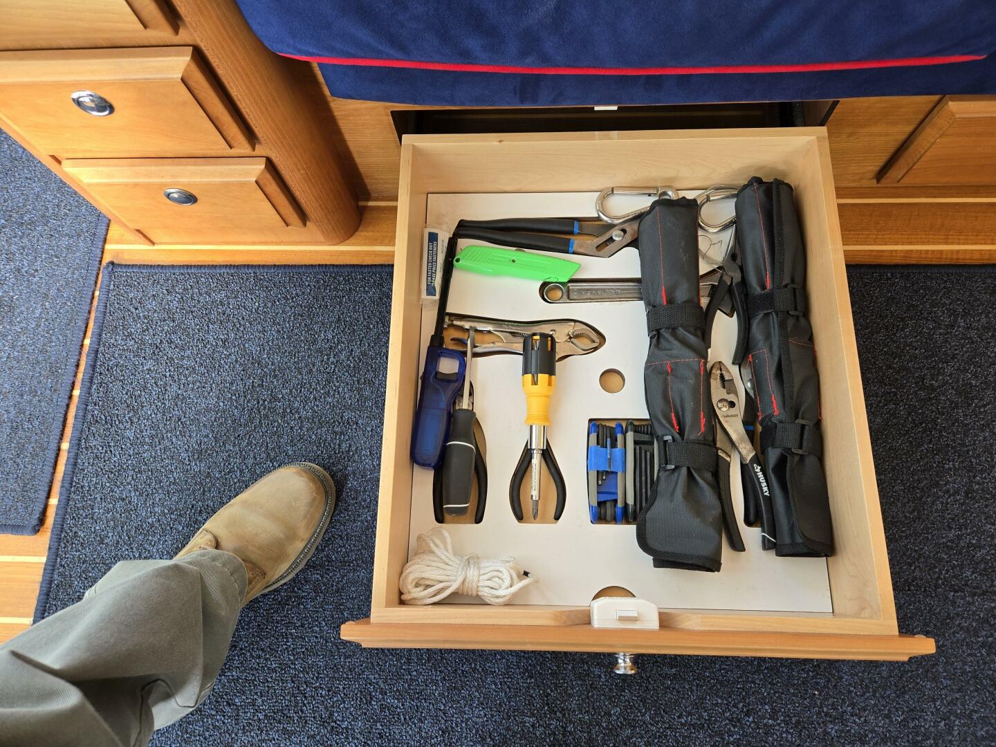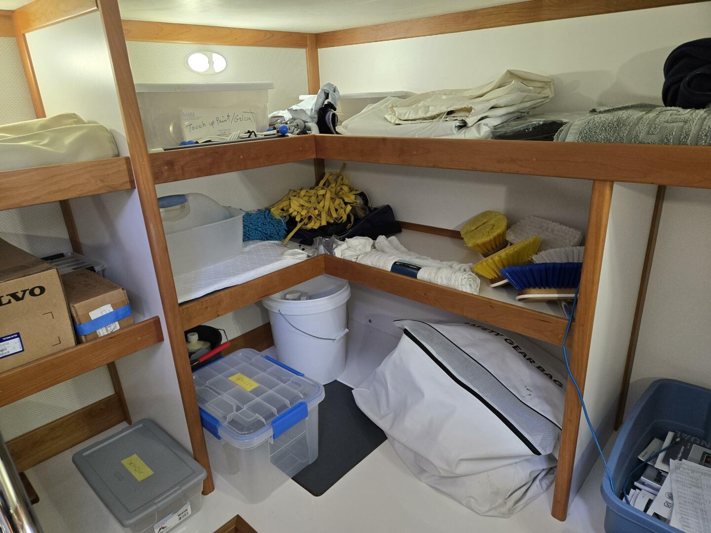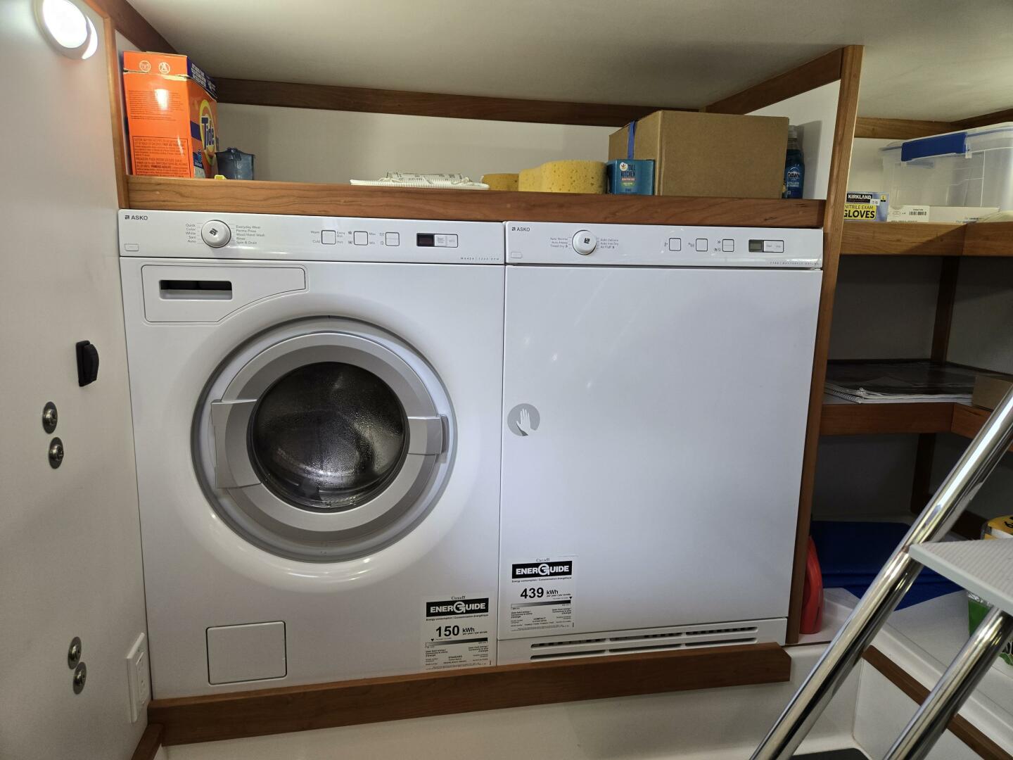 Under the floor in the main salon, a hatch provides access the Utility Room where you find the side by side washer and dryer and tons of storage space.