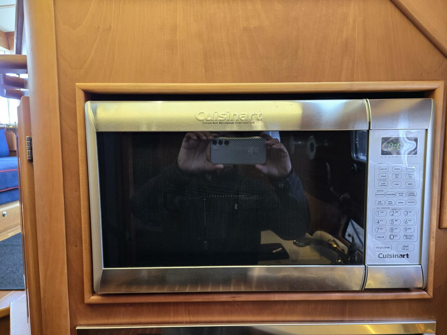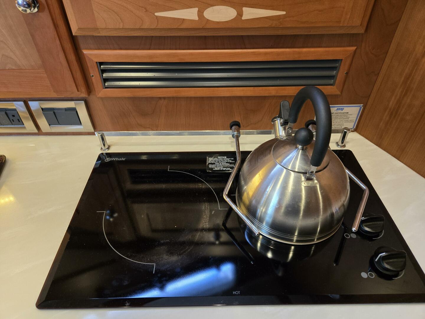 Three steps down from the main salon is the galley to port which runs fore and aft. The solid surface counter is beautiful and galley features include:
