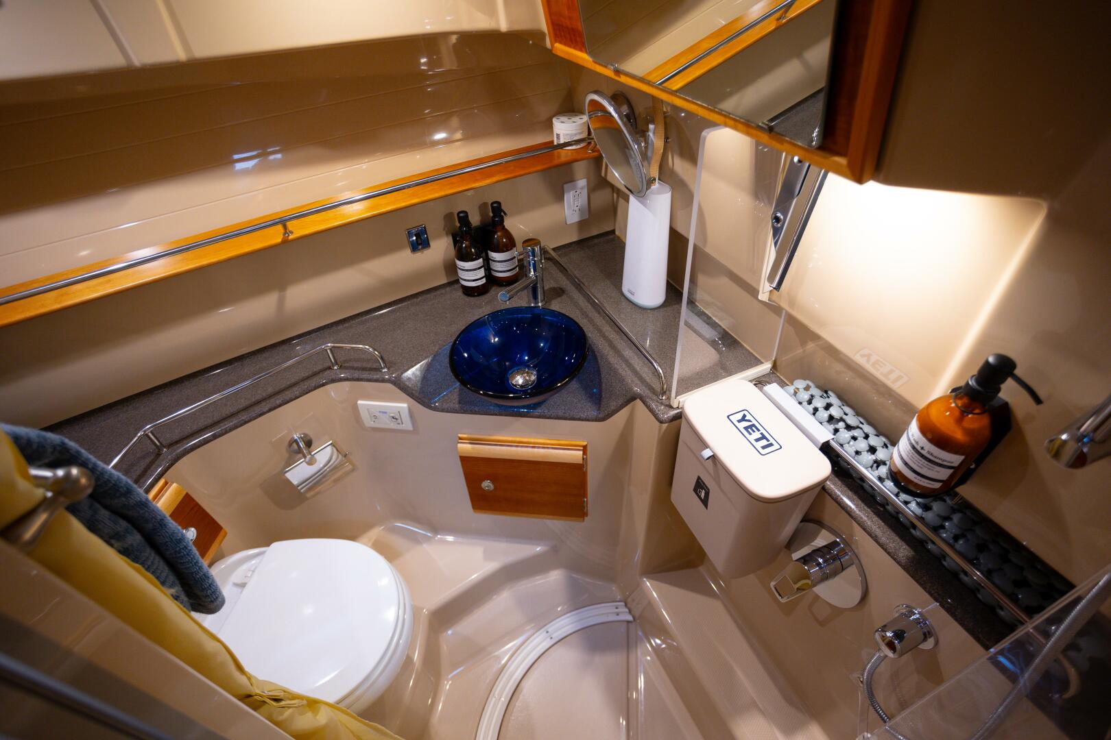 Down below a large berth and clever storage solutions make the primary cabin very comfortable for extended cruising. Custom bedding elevates the space and the ensuite head is well appointed with a separated enclosed shower.