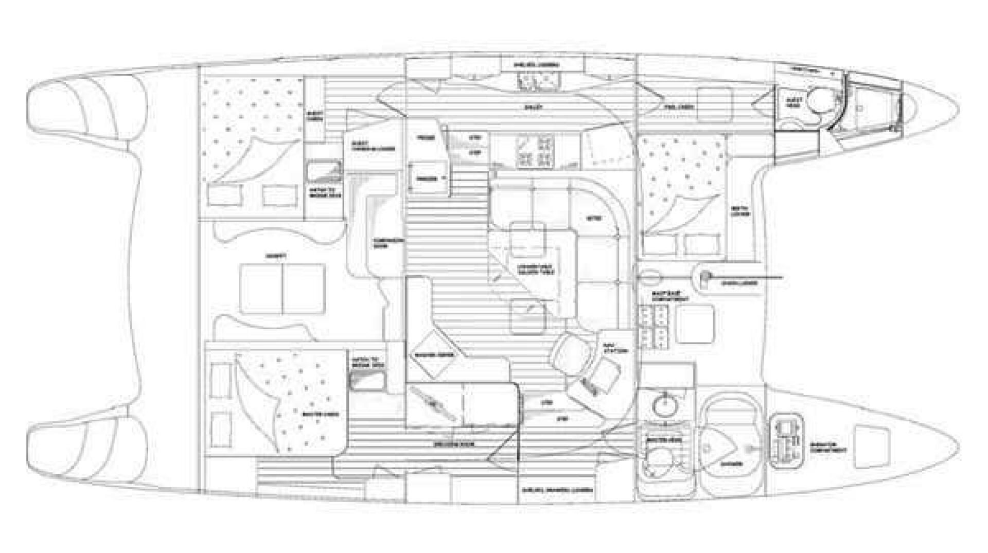 - Engine Placement (Midship): The use of shaft drives necessitates placing the engines (twin Yanmar 40 HP diesels) further forward in the hulls, beneath the saloon floorboards. This central location improves the catamaran's balance, keeps the center of gravity low, and reduces pitching motion in waves, leading to a more comfortable ride.