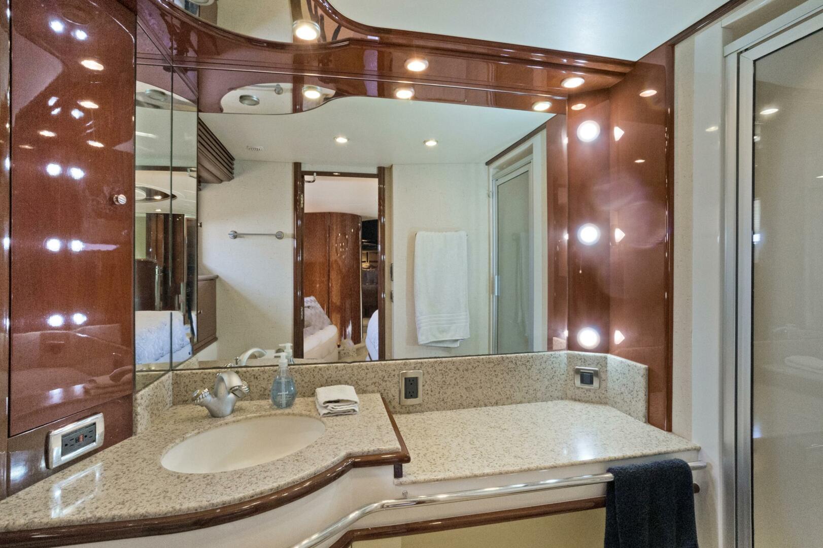 · Vanity - Marble countertop & backsplash, stainless steel grab rail across front, undermounted solid surface molded sink, cabinet beneath with sea rail